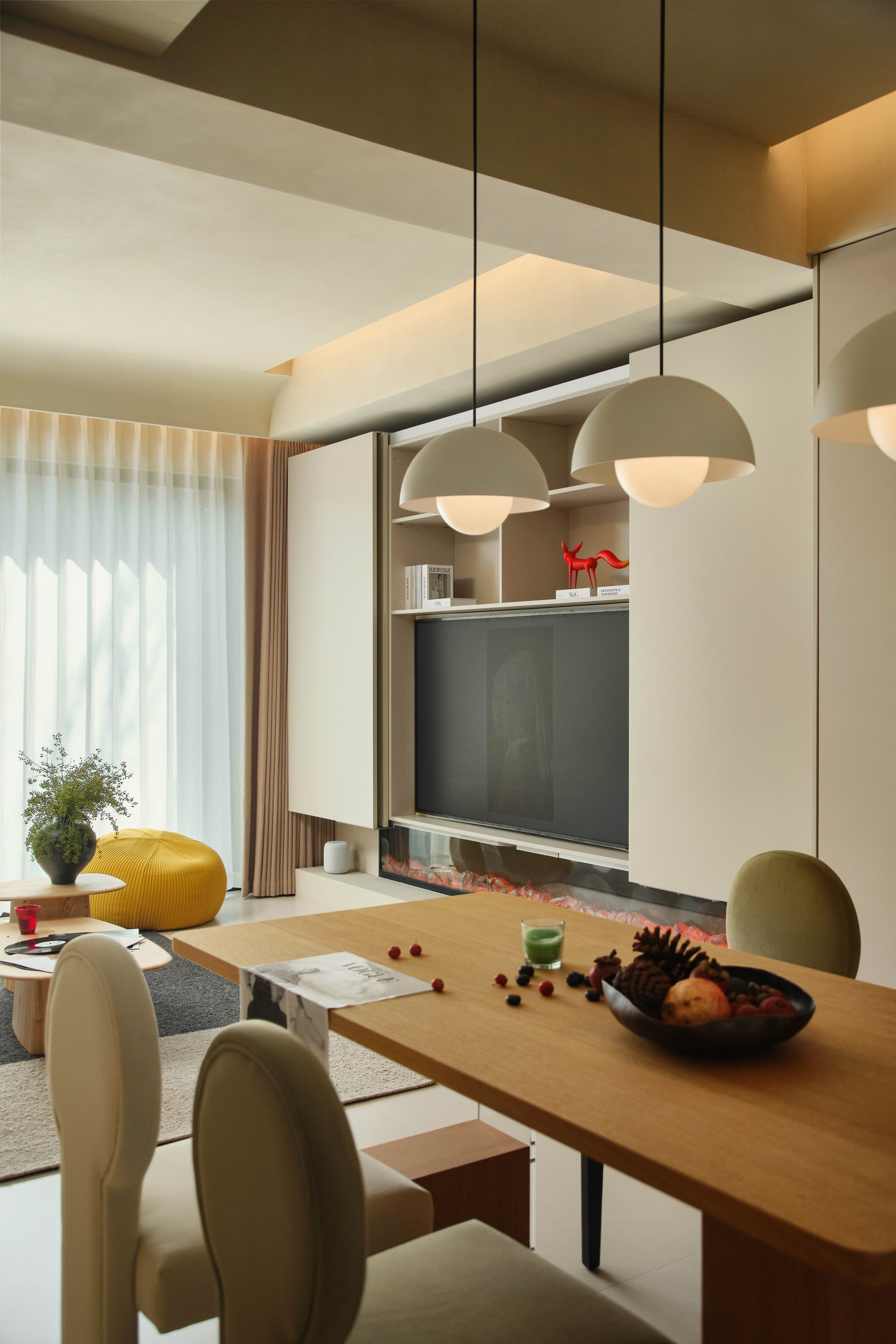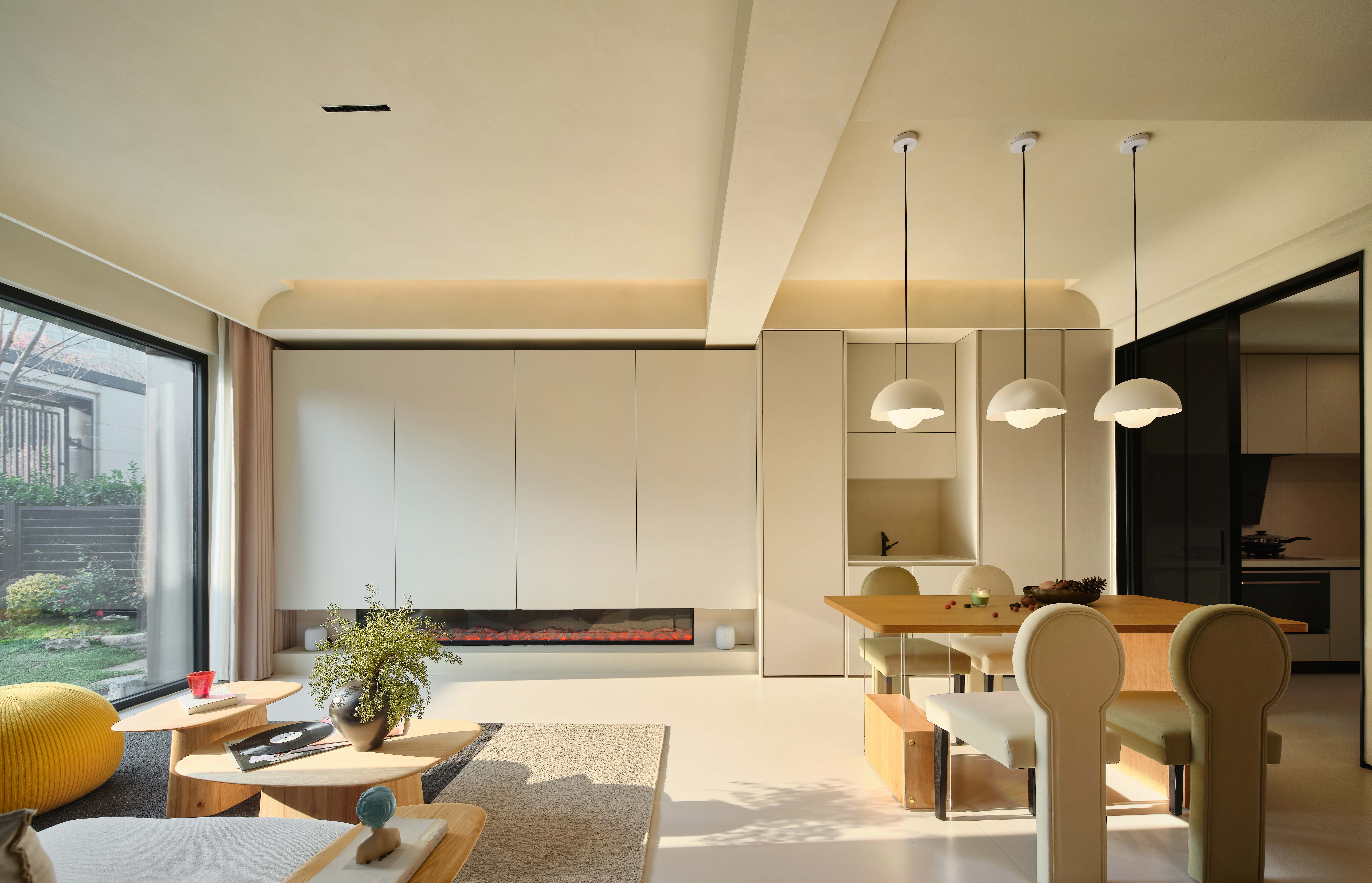 客餐厅以奶油色调与木质家具打造温暖的生活场景,兼顾功能与静谧氛围。