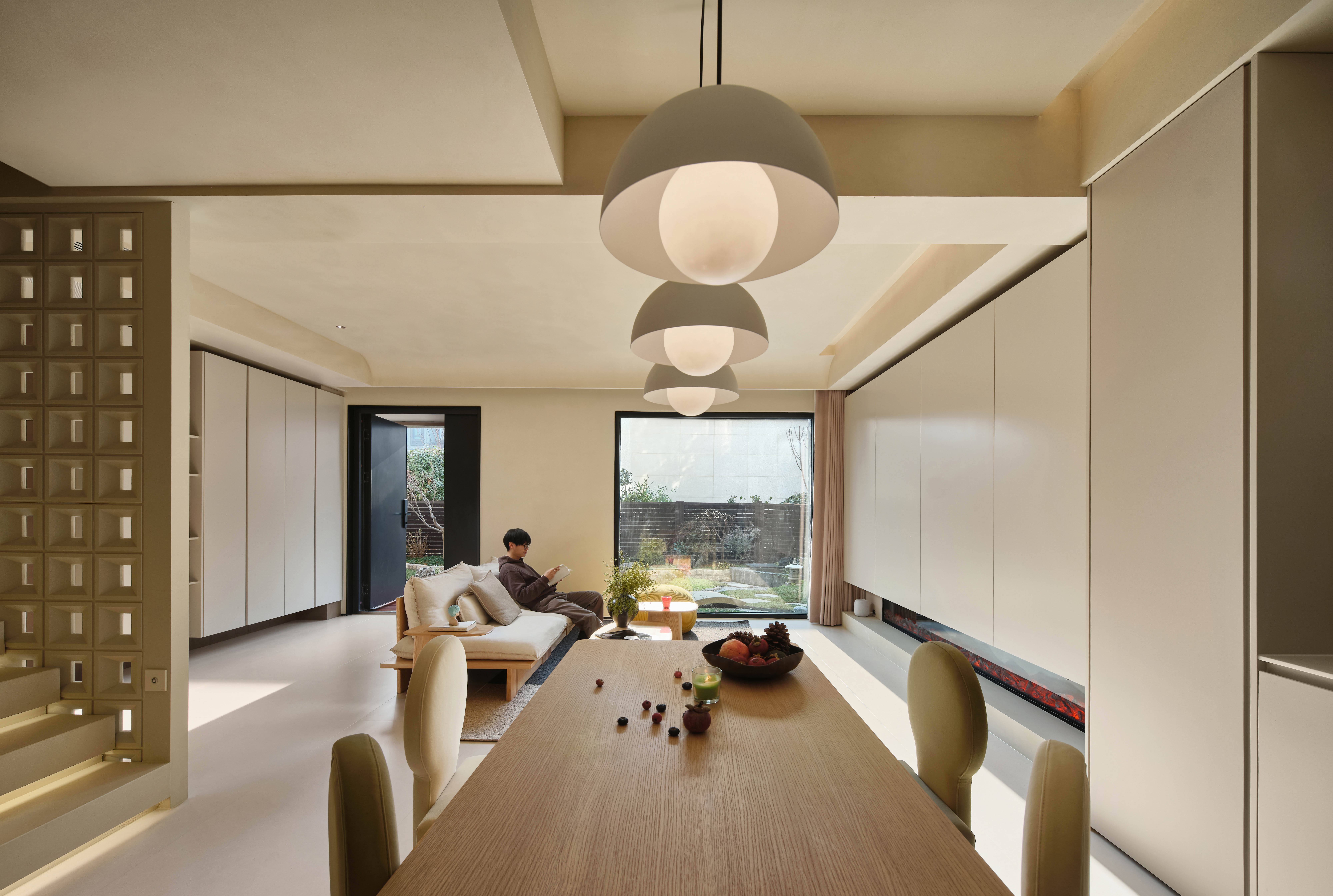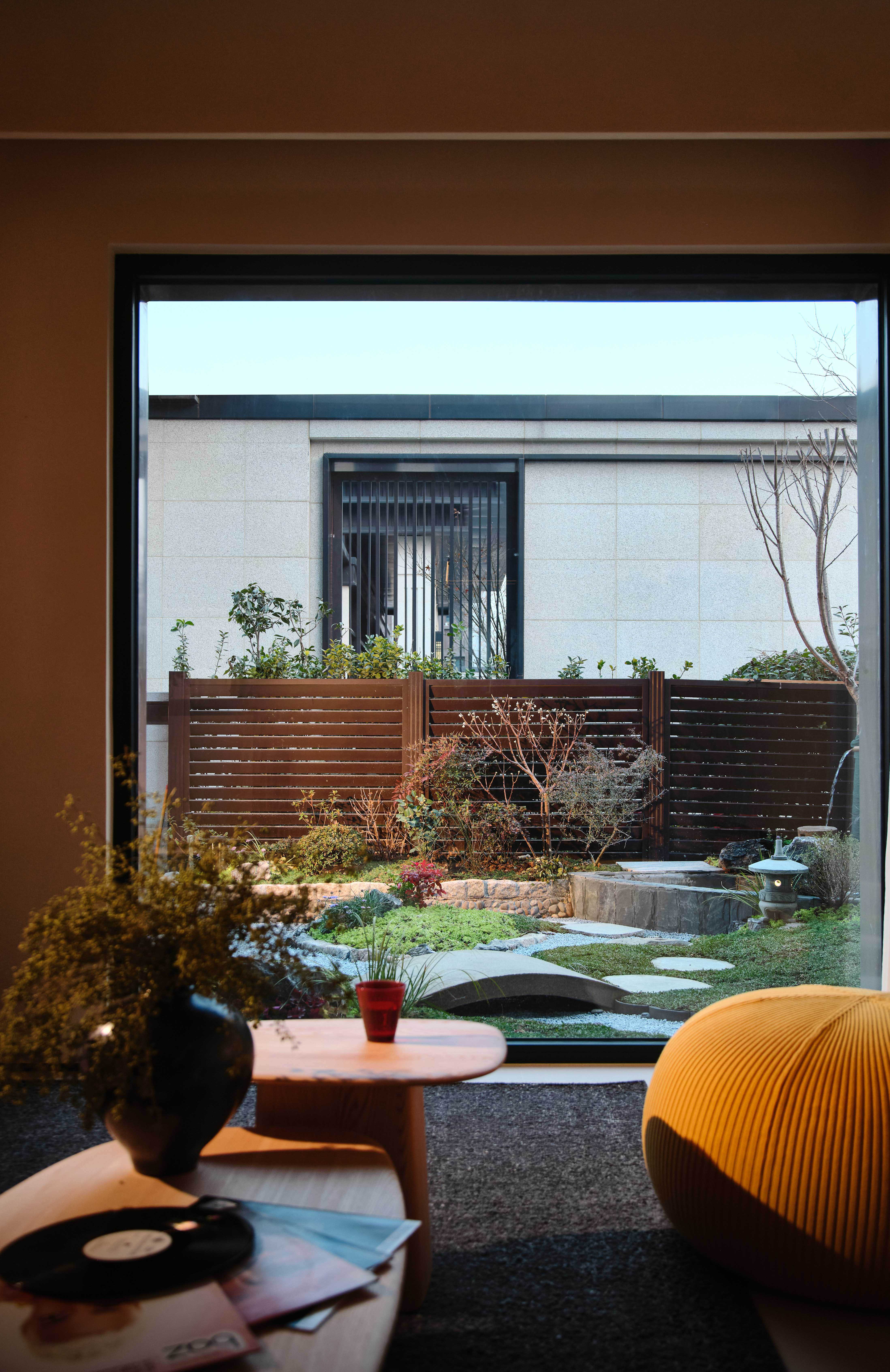 阳光透过落地窗洒进来,将庭院的绿意染上一层暖调,空间在光影中流动,安静而温柔。