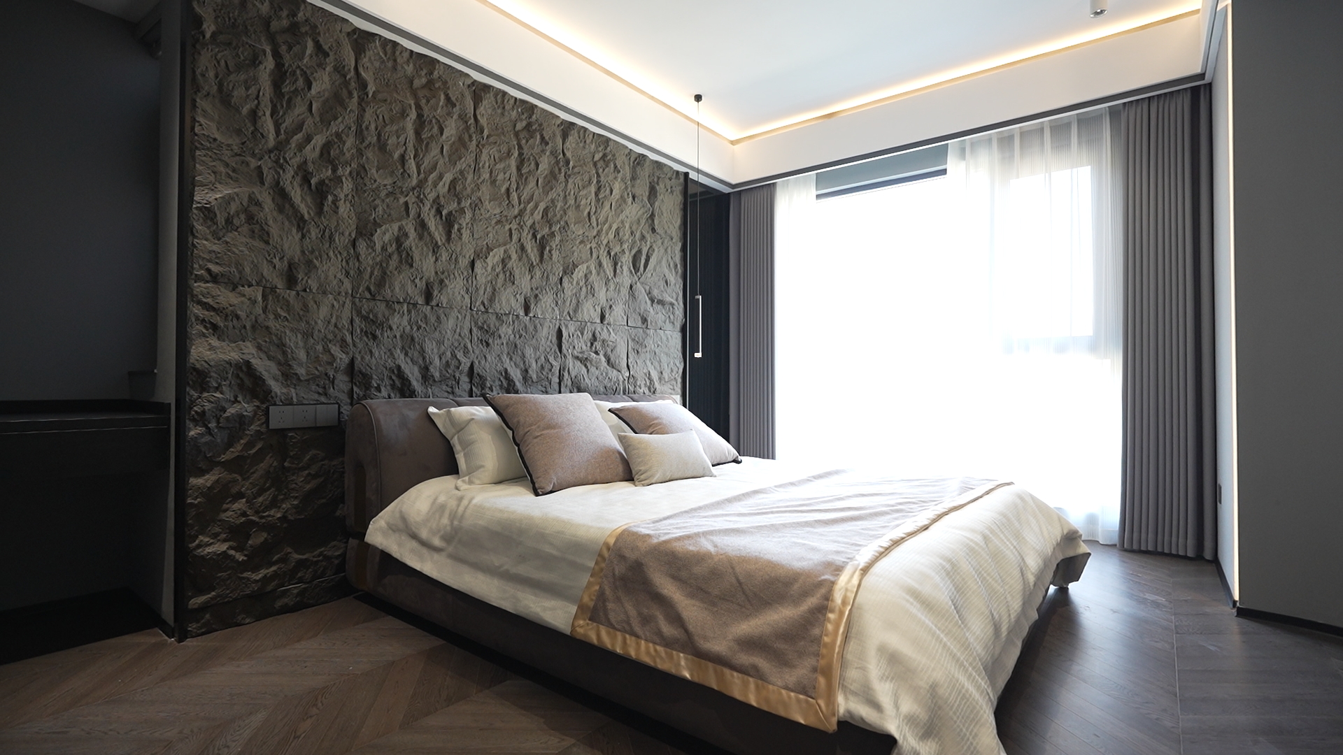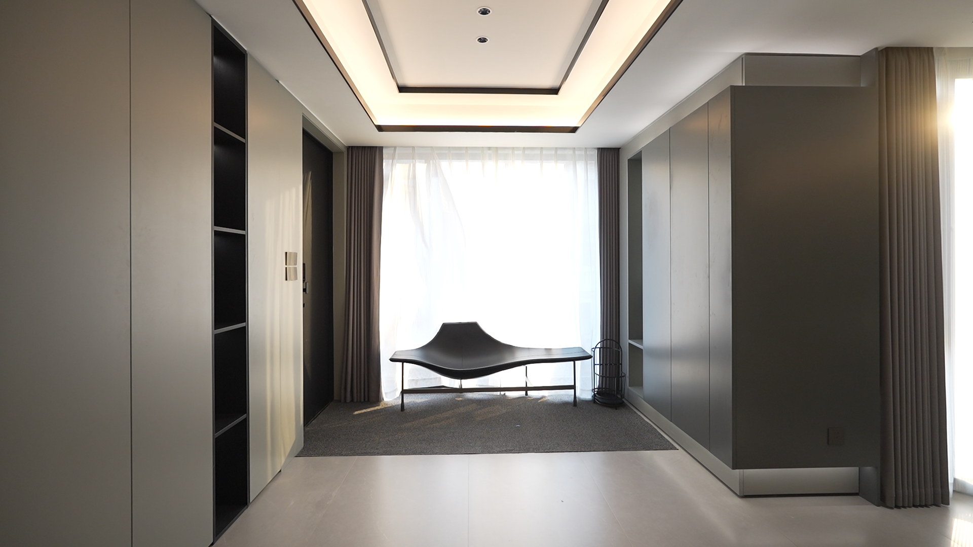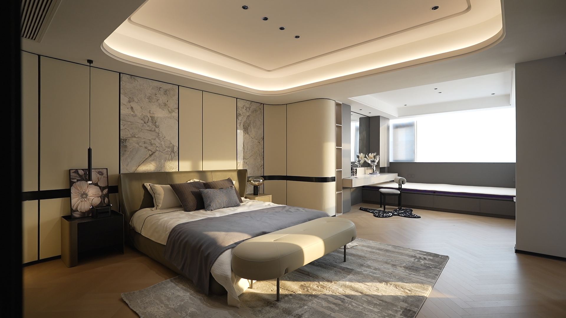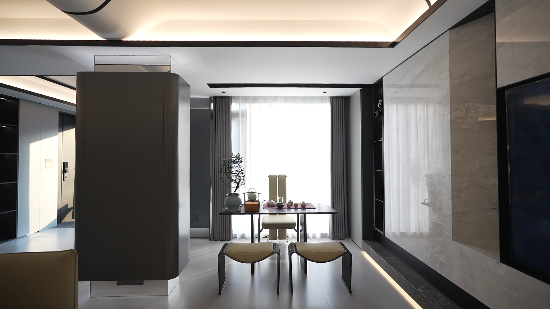 • 主氛围:吊顶弧形暖光灯带,以“无主灯+漫射光”的形式,既契合极简的“隐形设计”美学,又通过暖光柔化空间底色;
