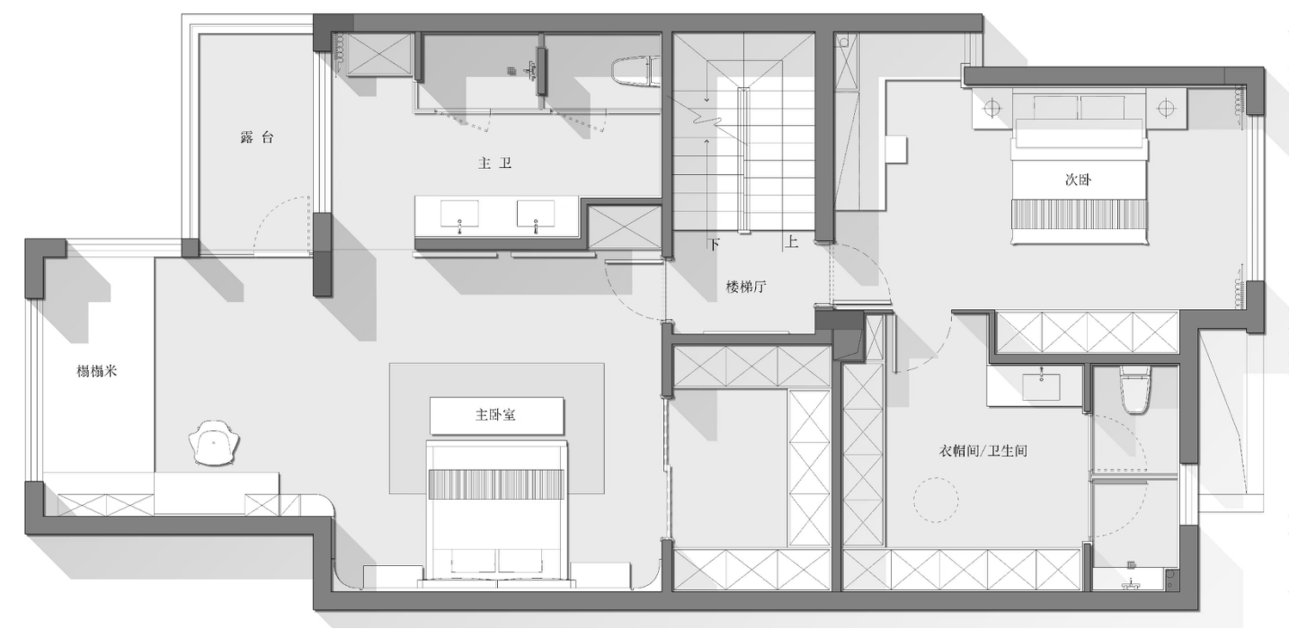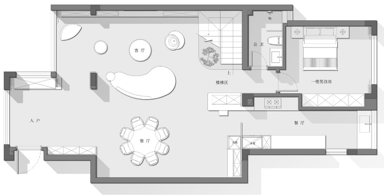 空间布局:该空间布局以“家庭化极简动线”为核心创新:打破意式极简的“对称刻板”,采用“开放互动+隐形功能”的弹性布局——客厅预留1.5米开阔活动区,衔接轻食区与楼梯间的无隔断动线适配孩子跑动;电视墙嵌入式收纳、踢脚线储物槽将功能隐藏于极简立面,既保持空间通透感,又满足四口之家的储物需求,实现“美学秩序”与“生活动线”的双向兼容