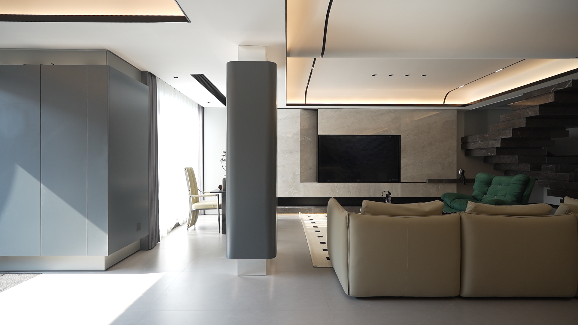 空间意境:在作品的环境风格创新上,这个空间打破了传统意式极简“冷硬、疏离”的刻板印象,以“家庭化极简”为核心做了3个维度的突破:
