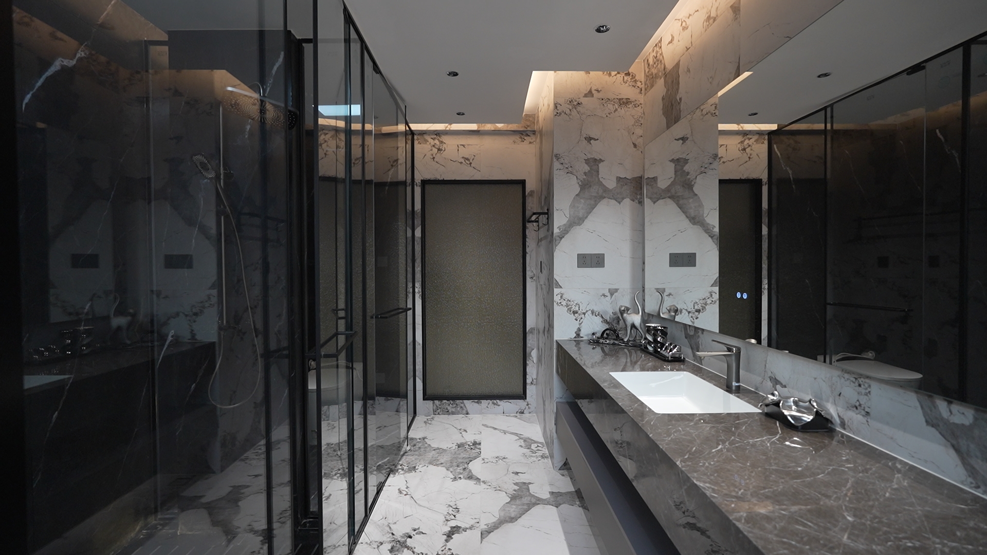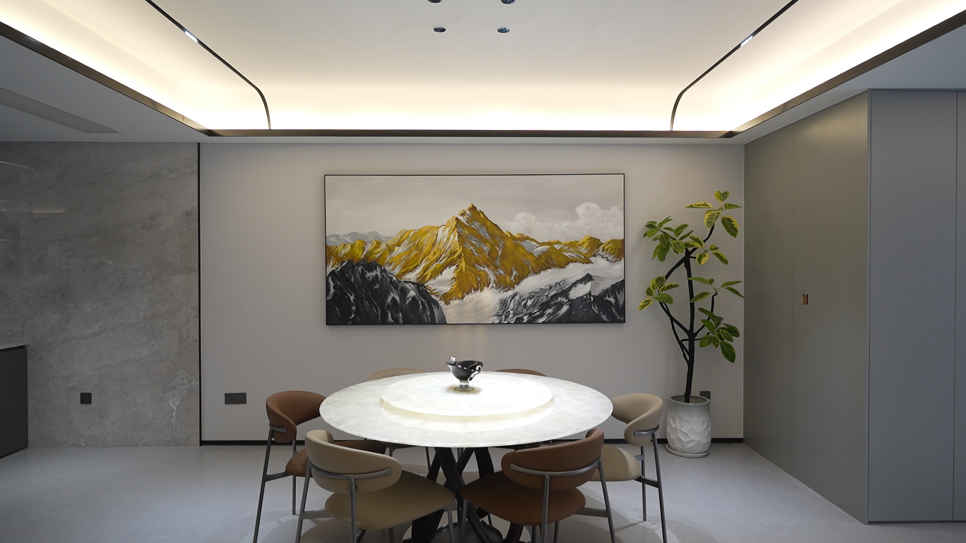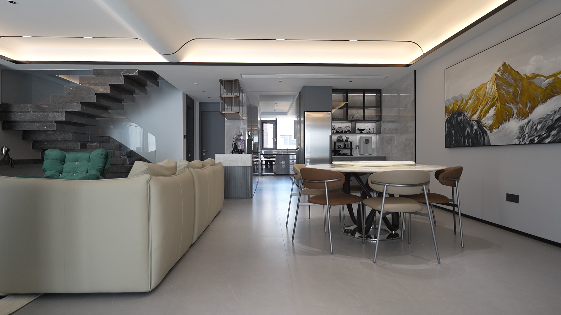 摒弃意式极简常见的“单一冷光”,采用“弧形漫射光+功能补光”的分层灯光系统: