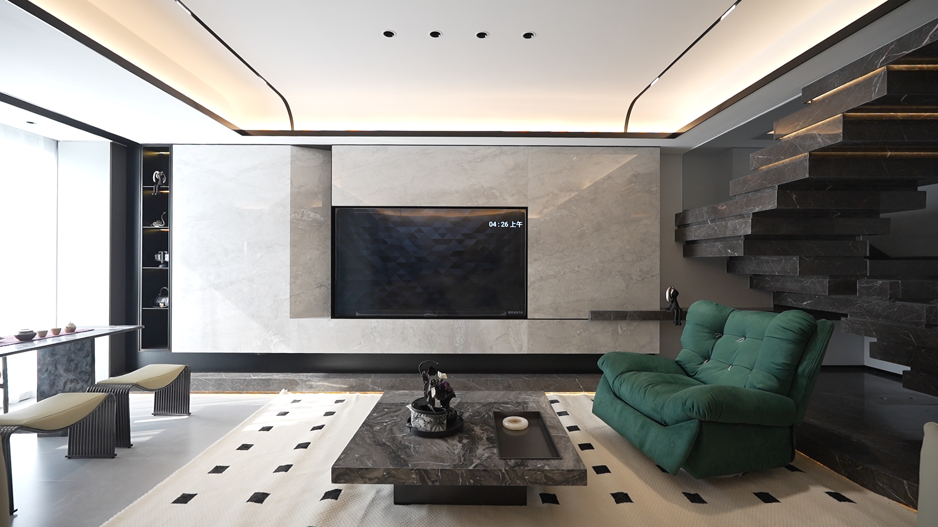 • 用「绒布+短绒」做情绪缓冲:墨绿色绒布沙发、短绒地毯的加入,既保留意式极简的“低饱和色彩逻辑”,又通过柔软材质中和石材、金属的冰冷感,让空间从“展示性”转向“居住性”。