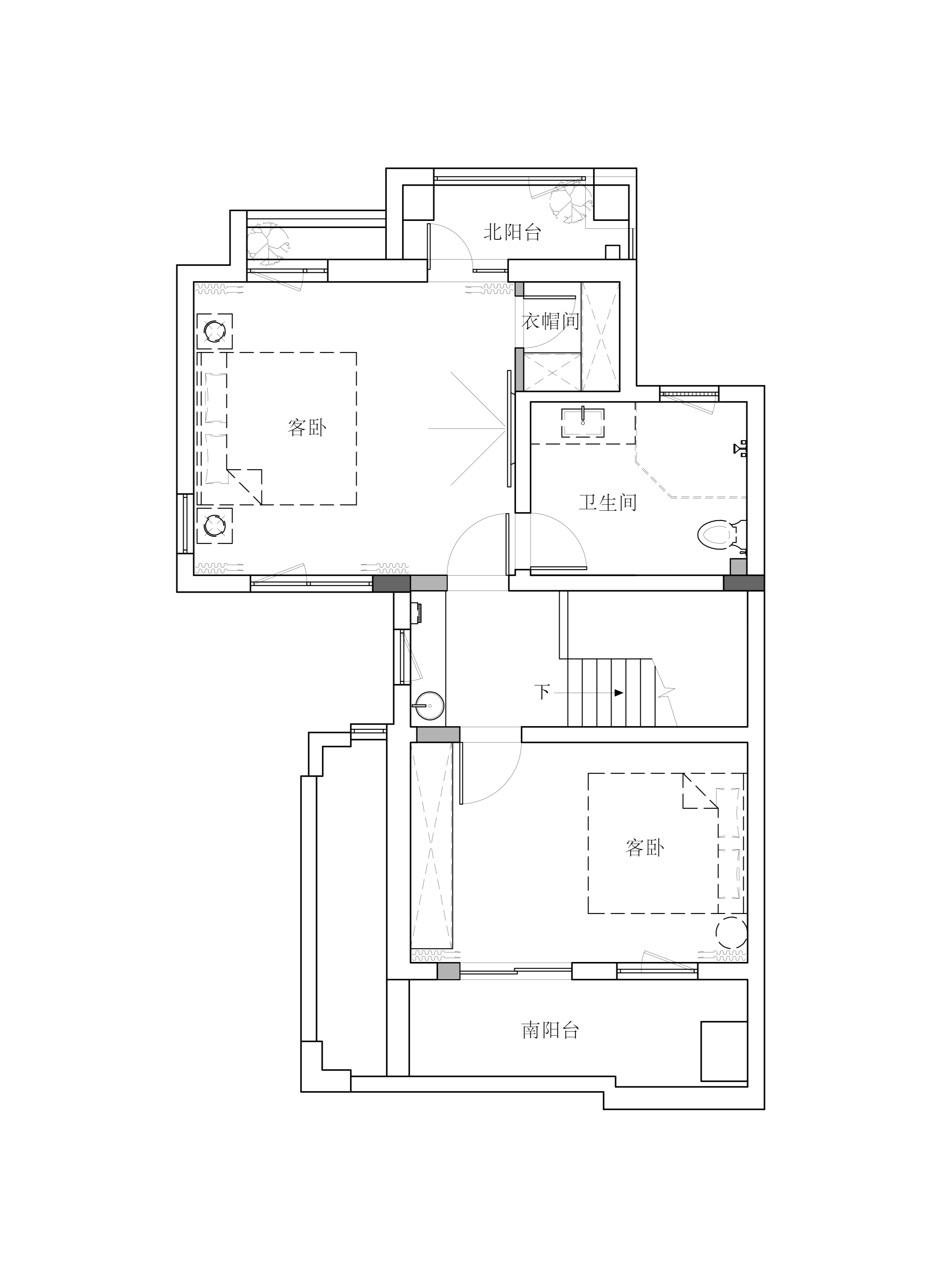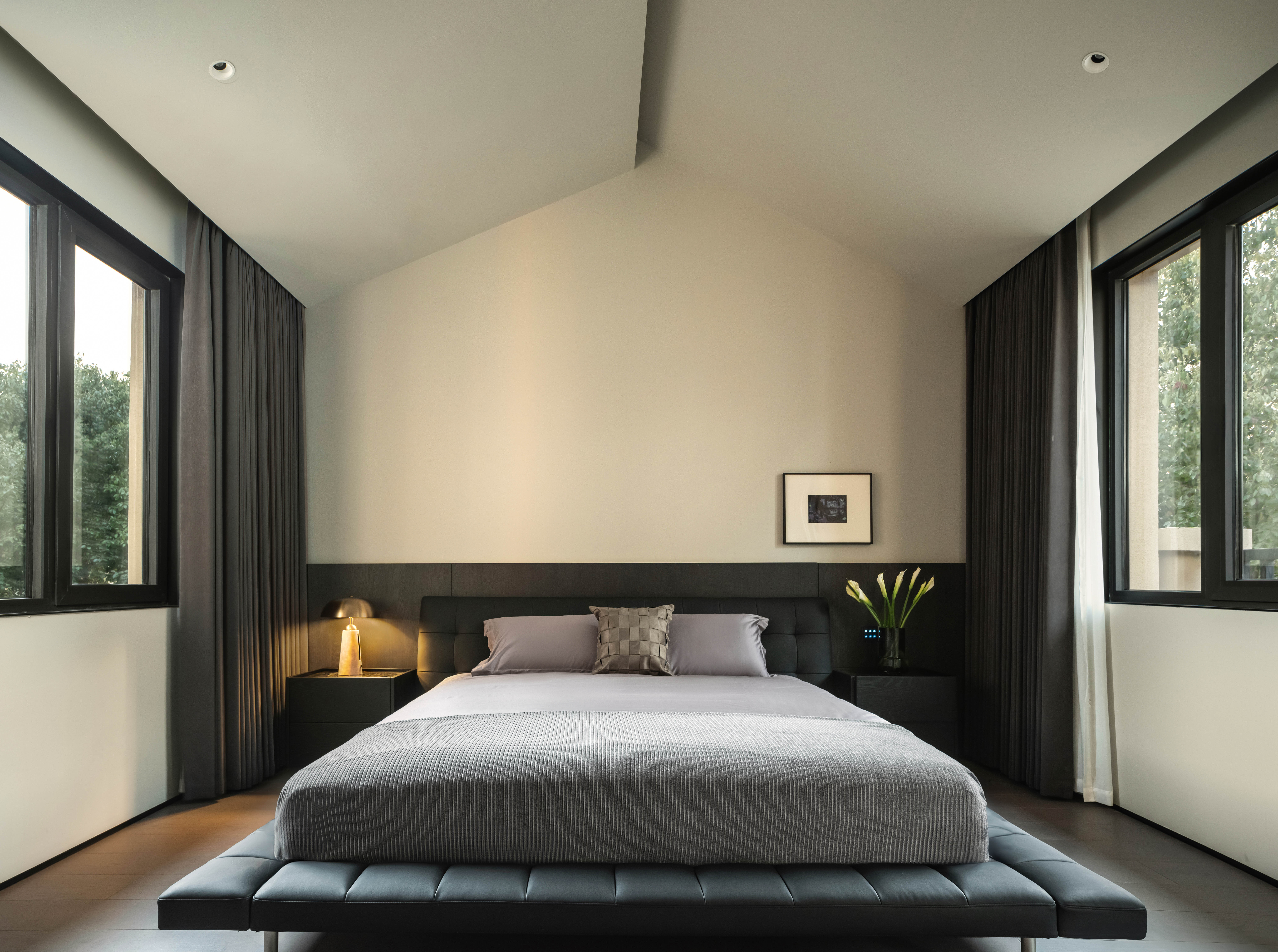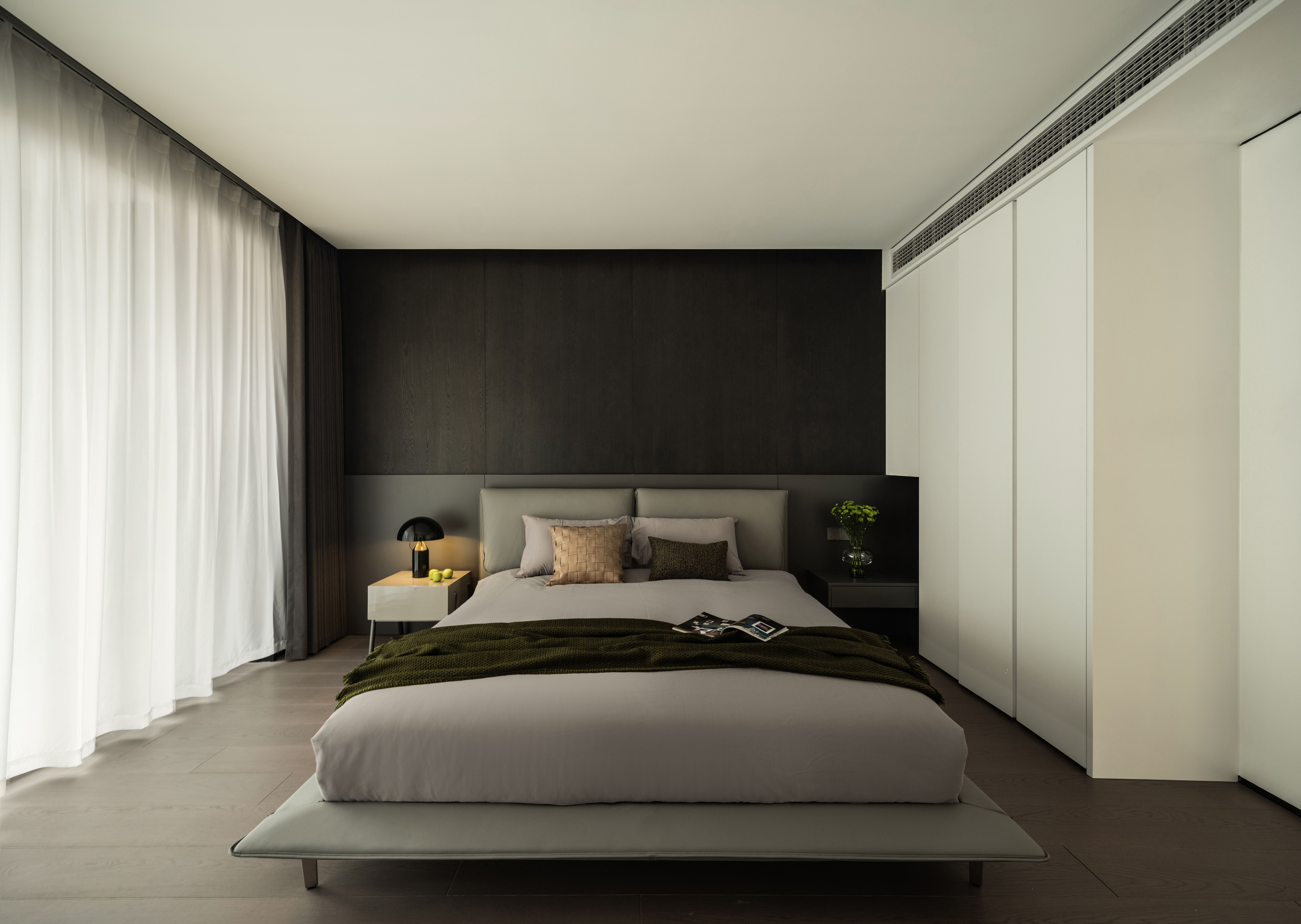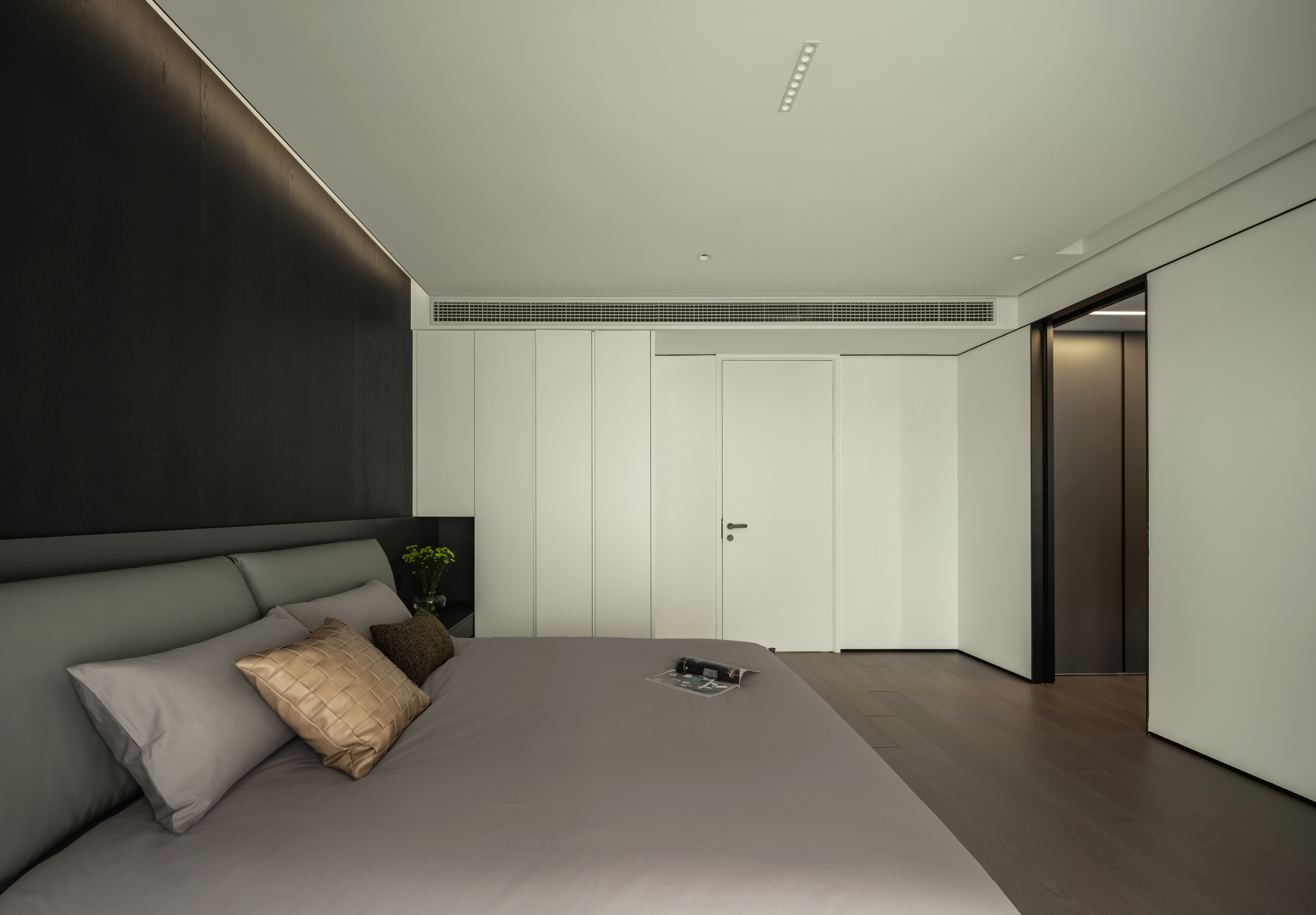卧室延续极简风格,黑色墙面吸收着光线,营造出私密的休憩氛围。白色衣柜衬托着自然光,让空间不至沉闷。