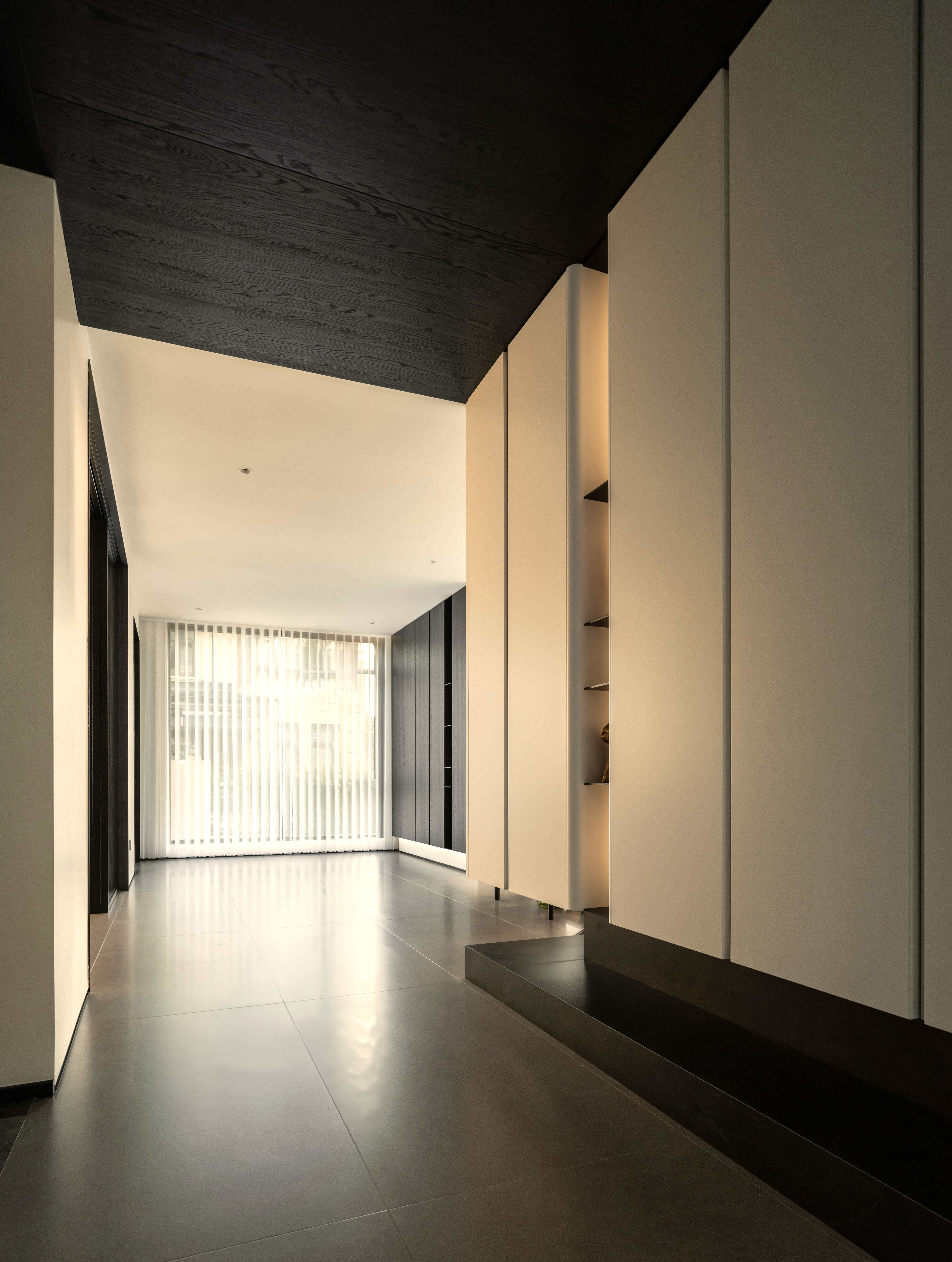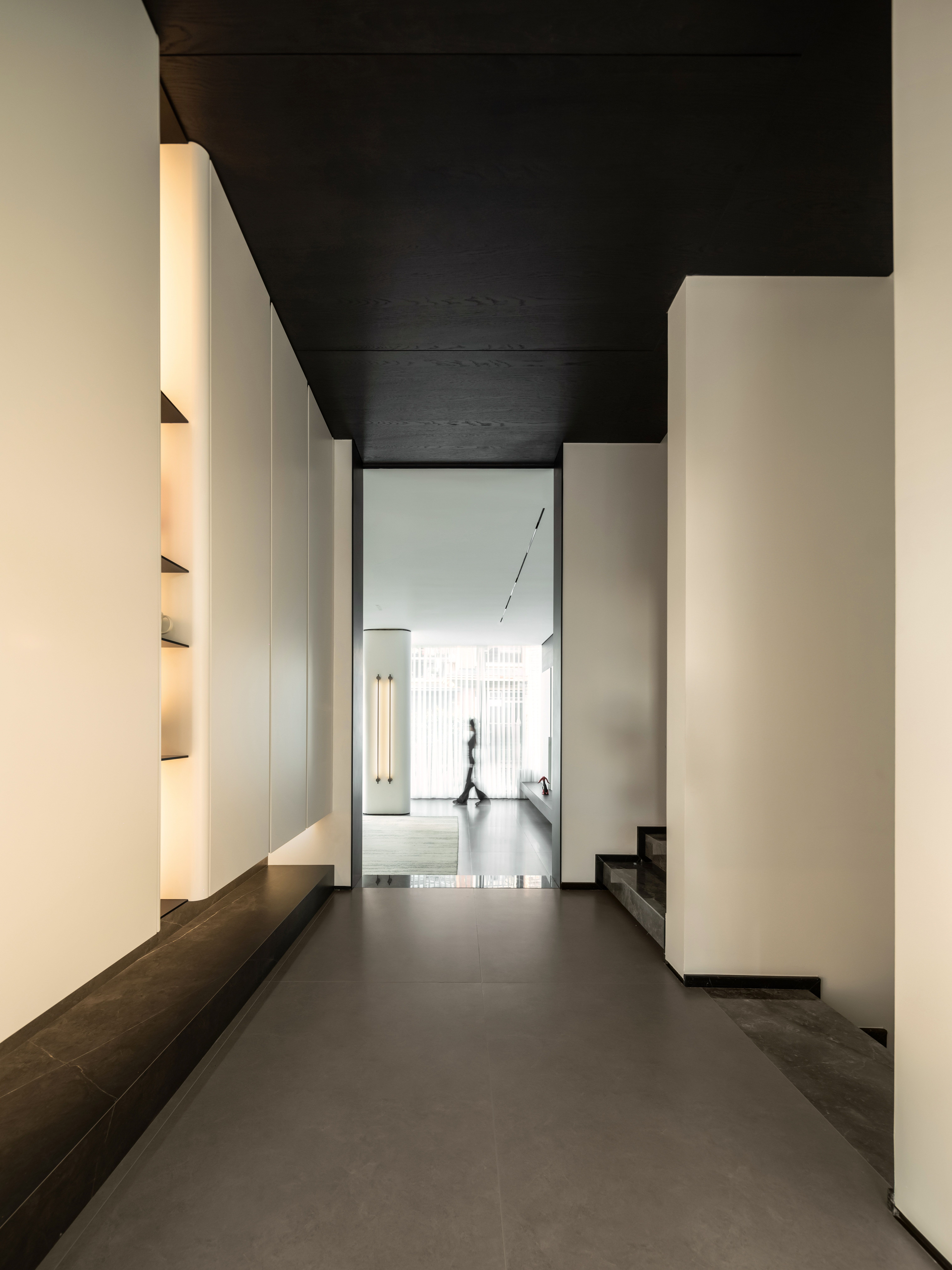 黑与白在这里形成一种安静的对话。墙面与家具的线条干净利落,没有一丝多余的笔触,仿佛空间本身在践行着某种禁欲主义。
