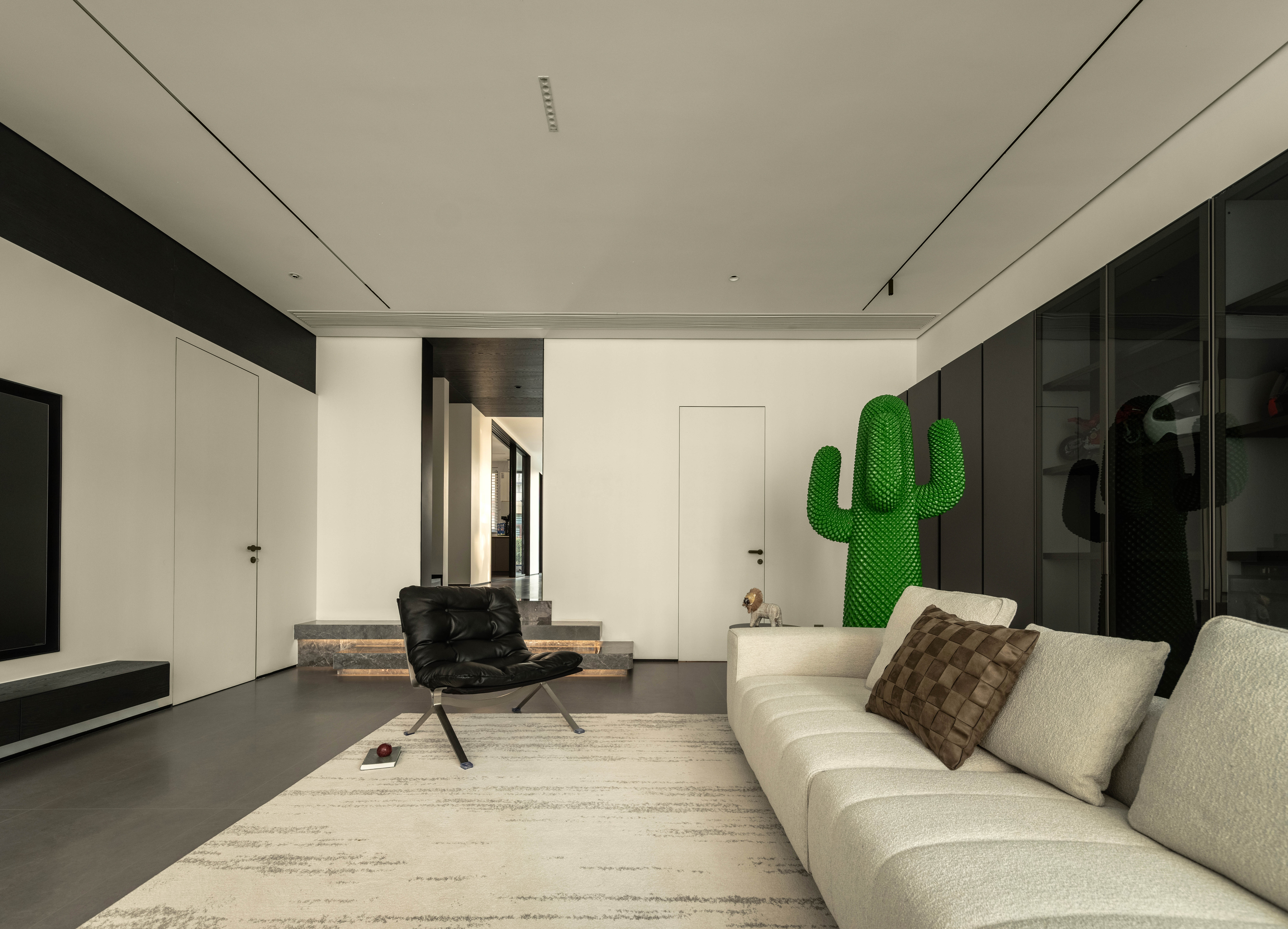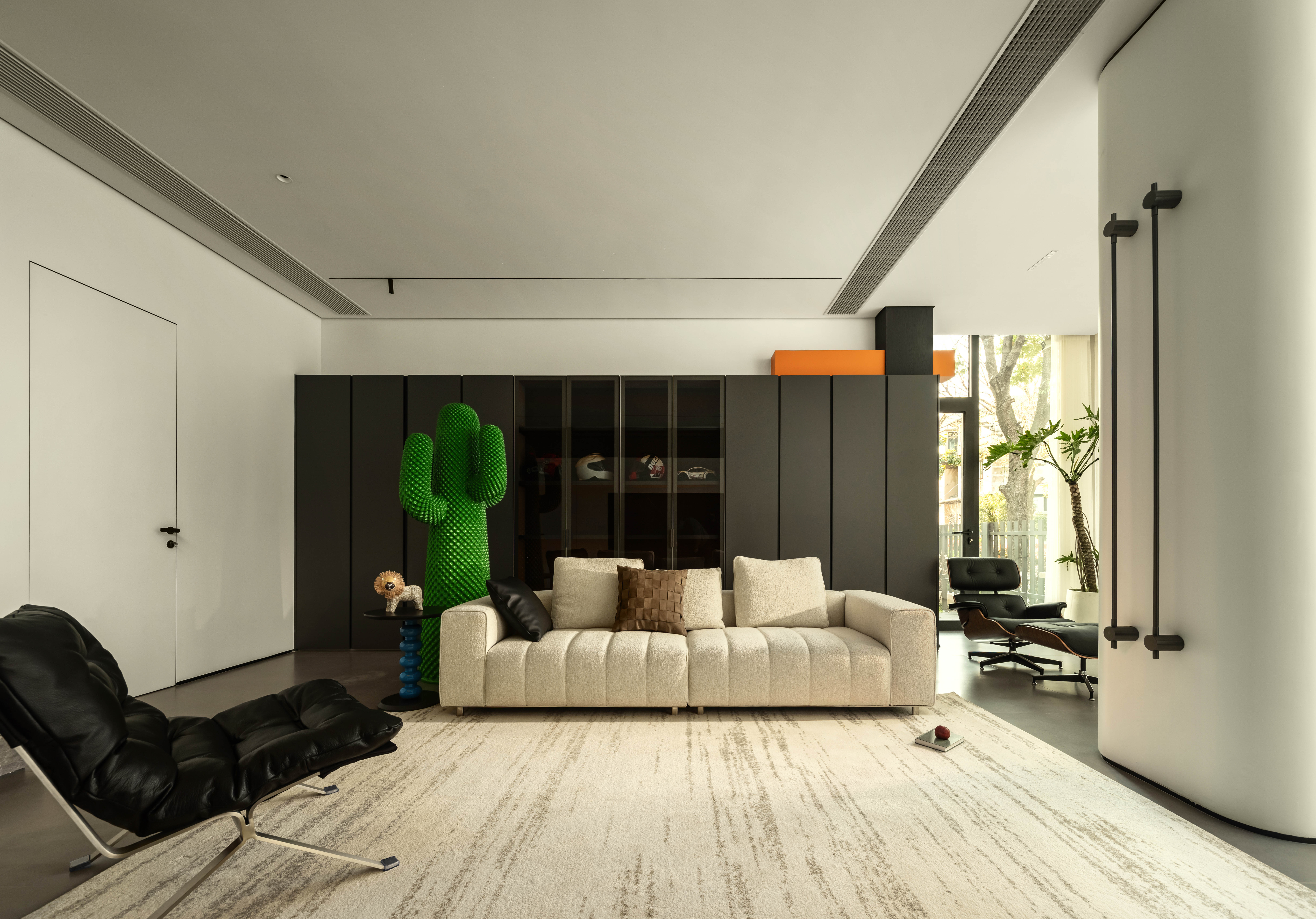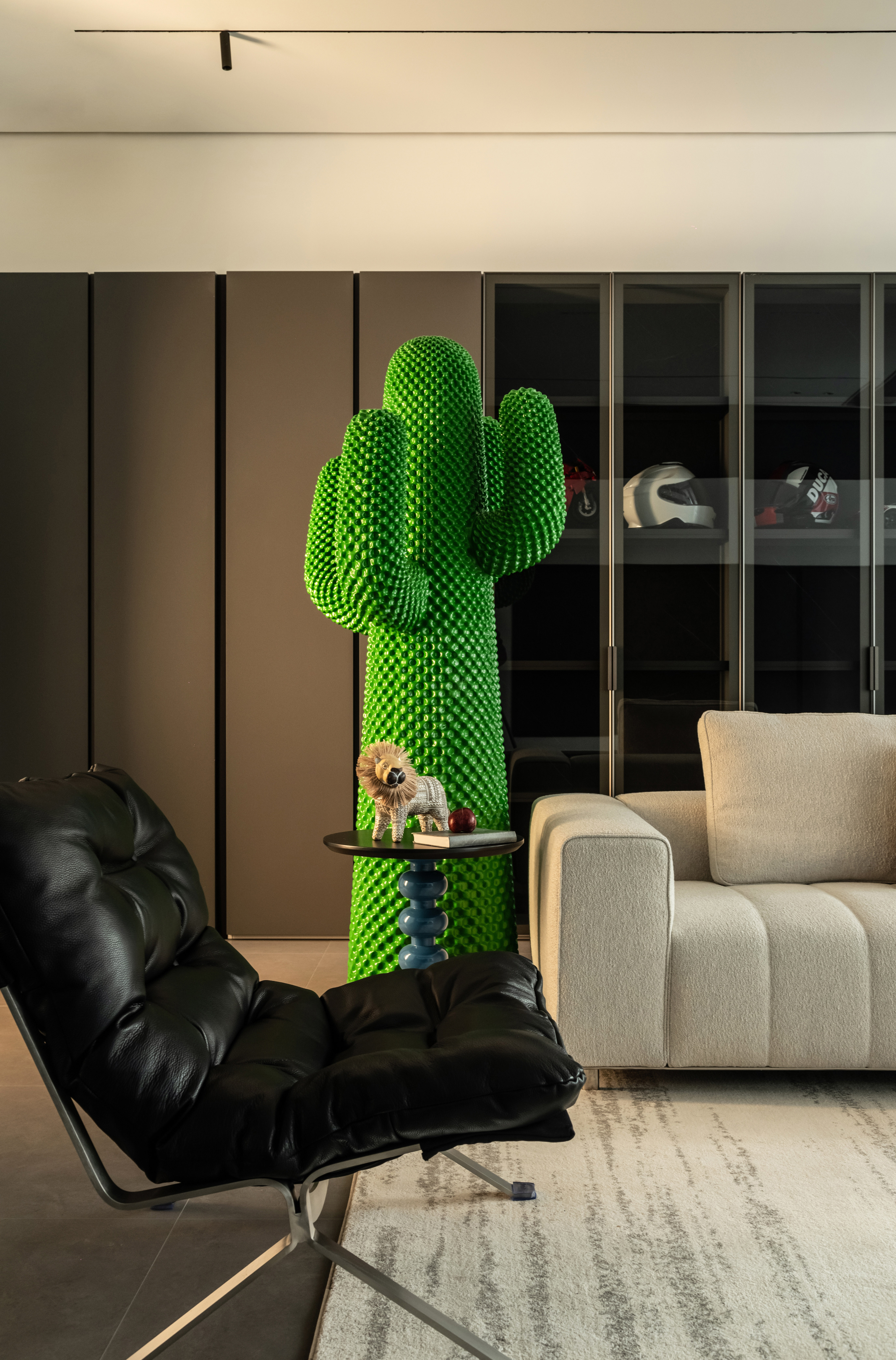 但极简并非冷漠——Gufram的仙人掌衣帽架以一抹叛逆的绿色姿态伫在沙发旁,为这片克制的领地注入一丝玩味。
