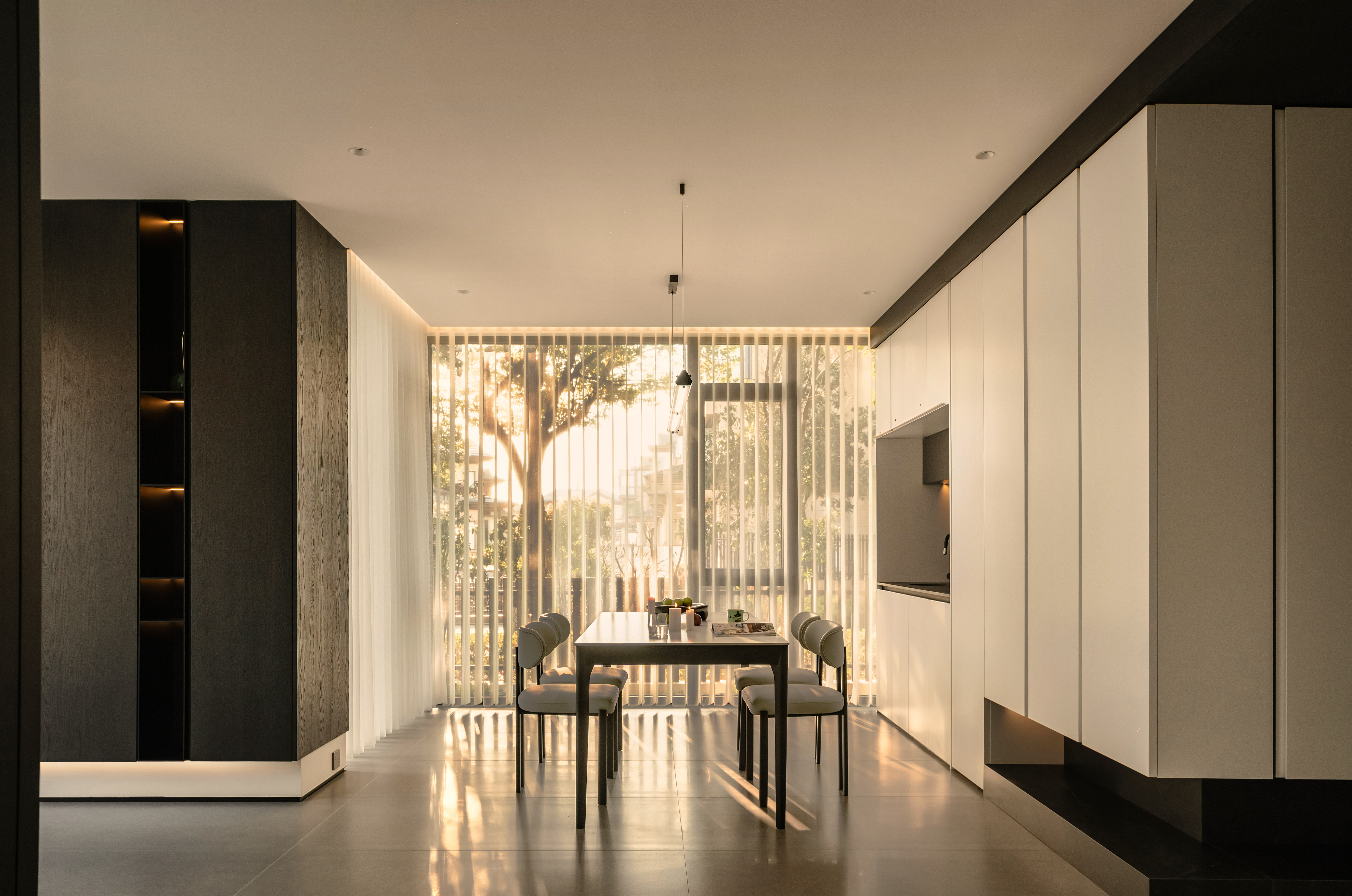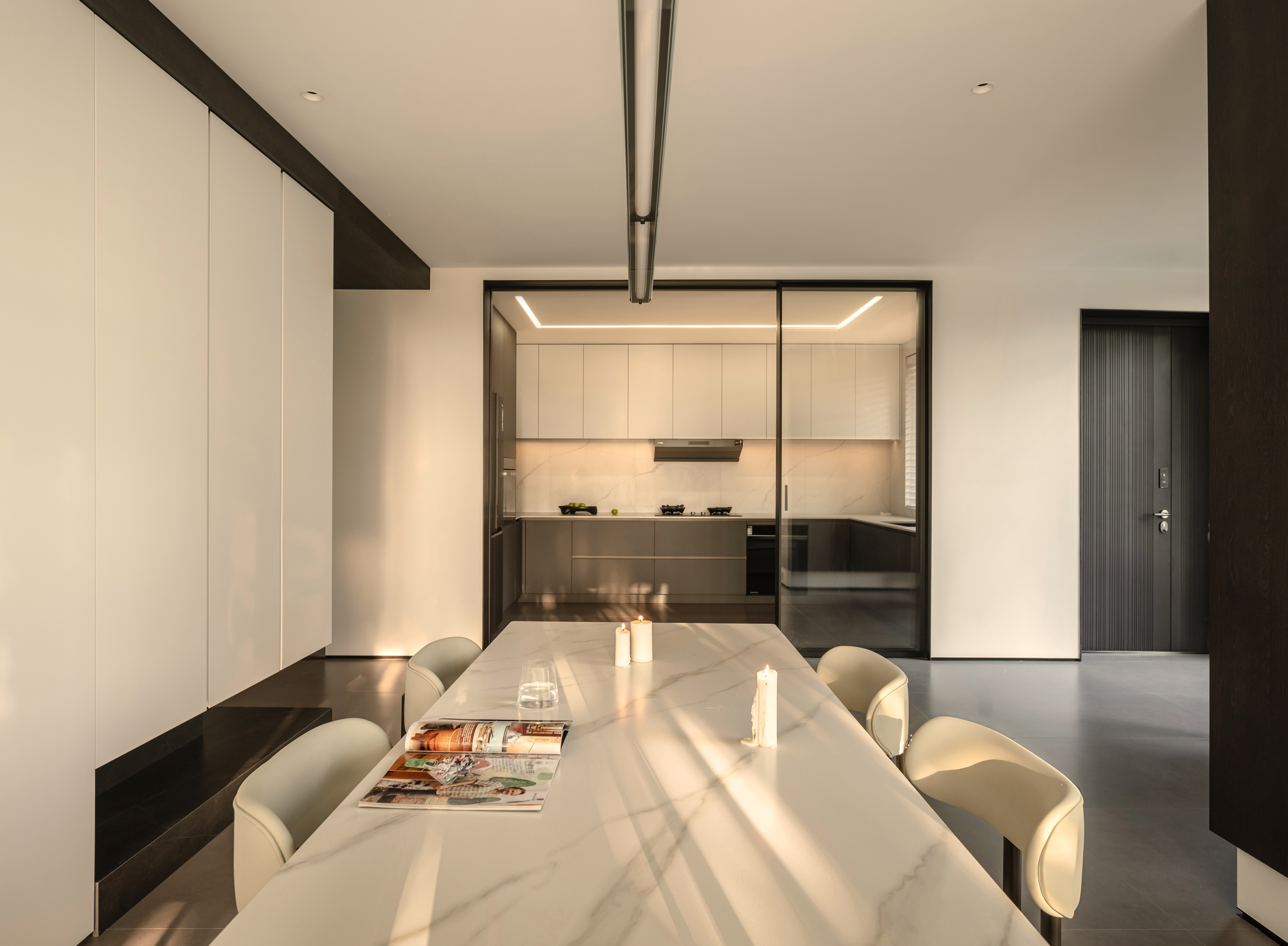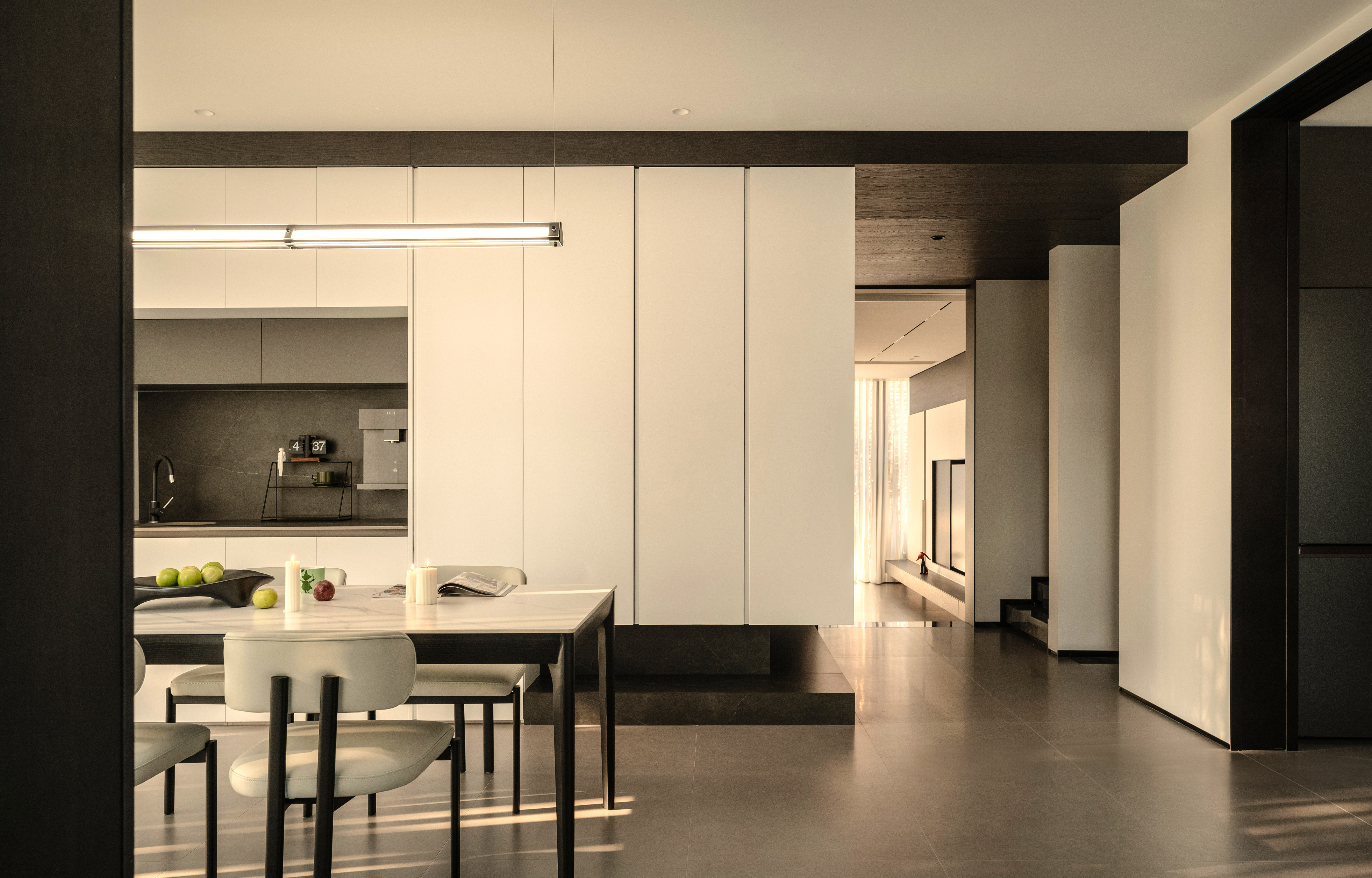 修长的日影从餐桌脚边流淌而过,横贯整个餐厅地面,最终爬上厨房的哑光地柜——仿佛在为空间丈量最后的温度。