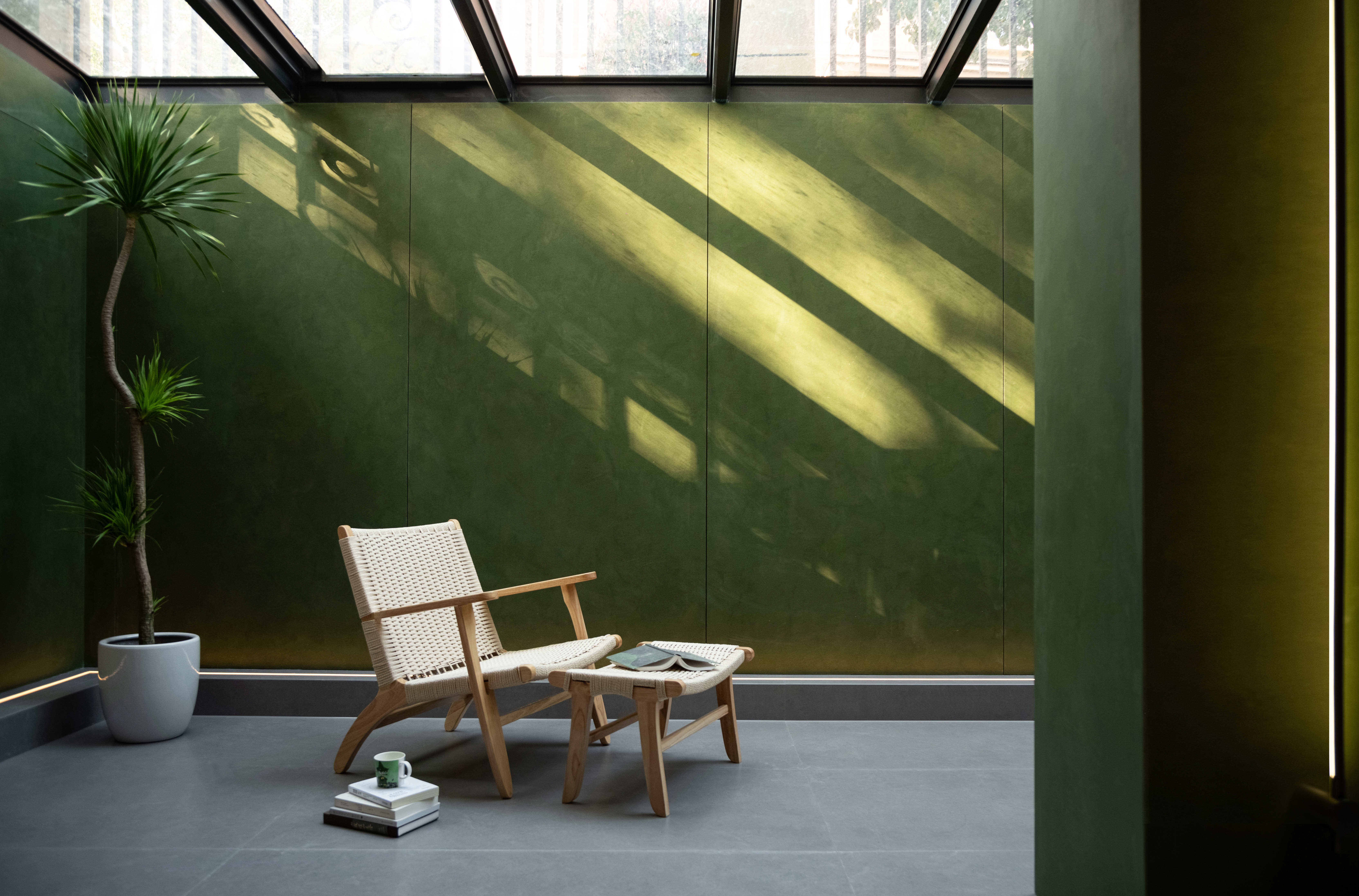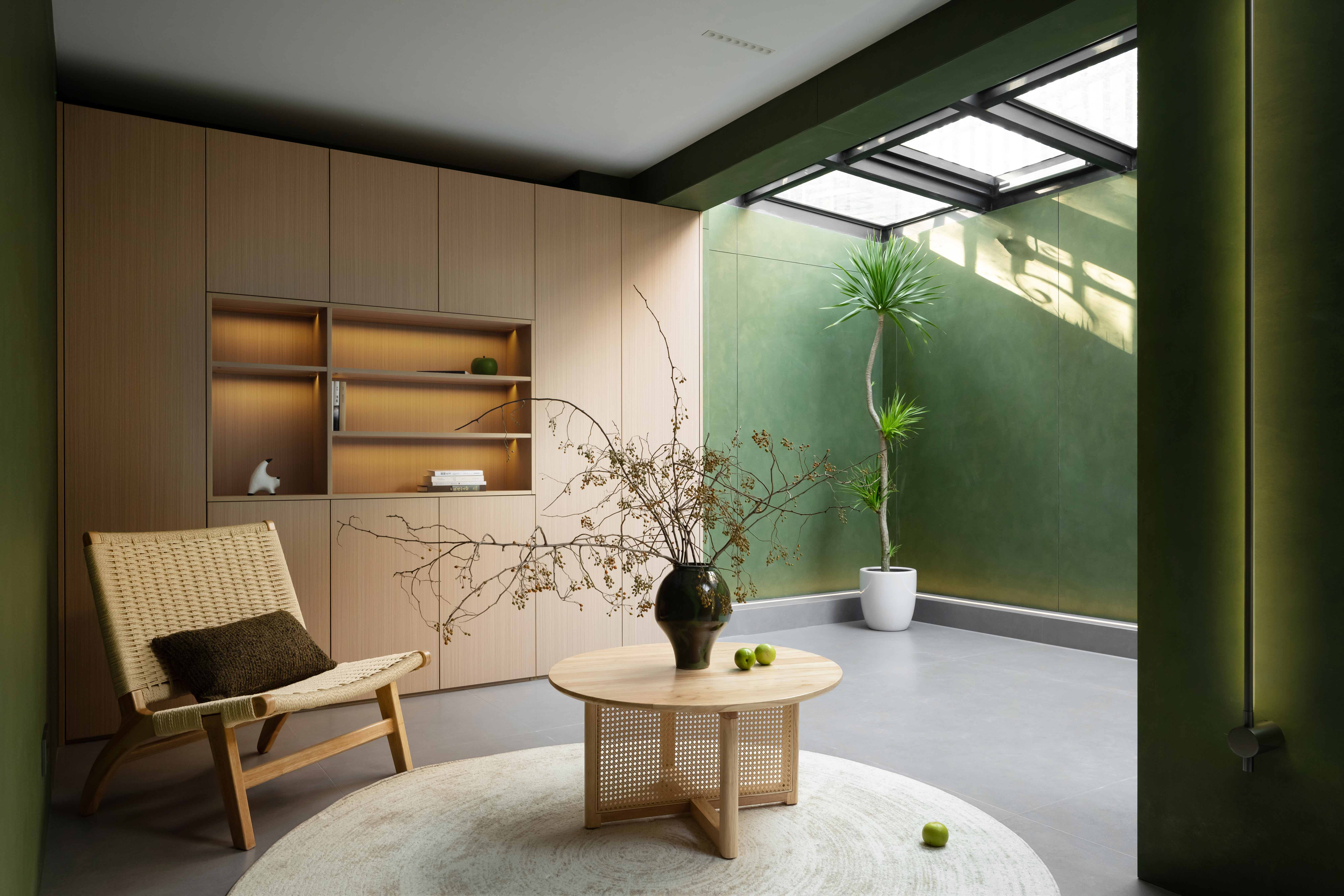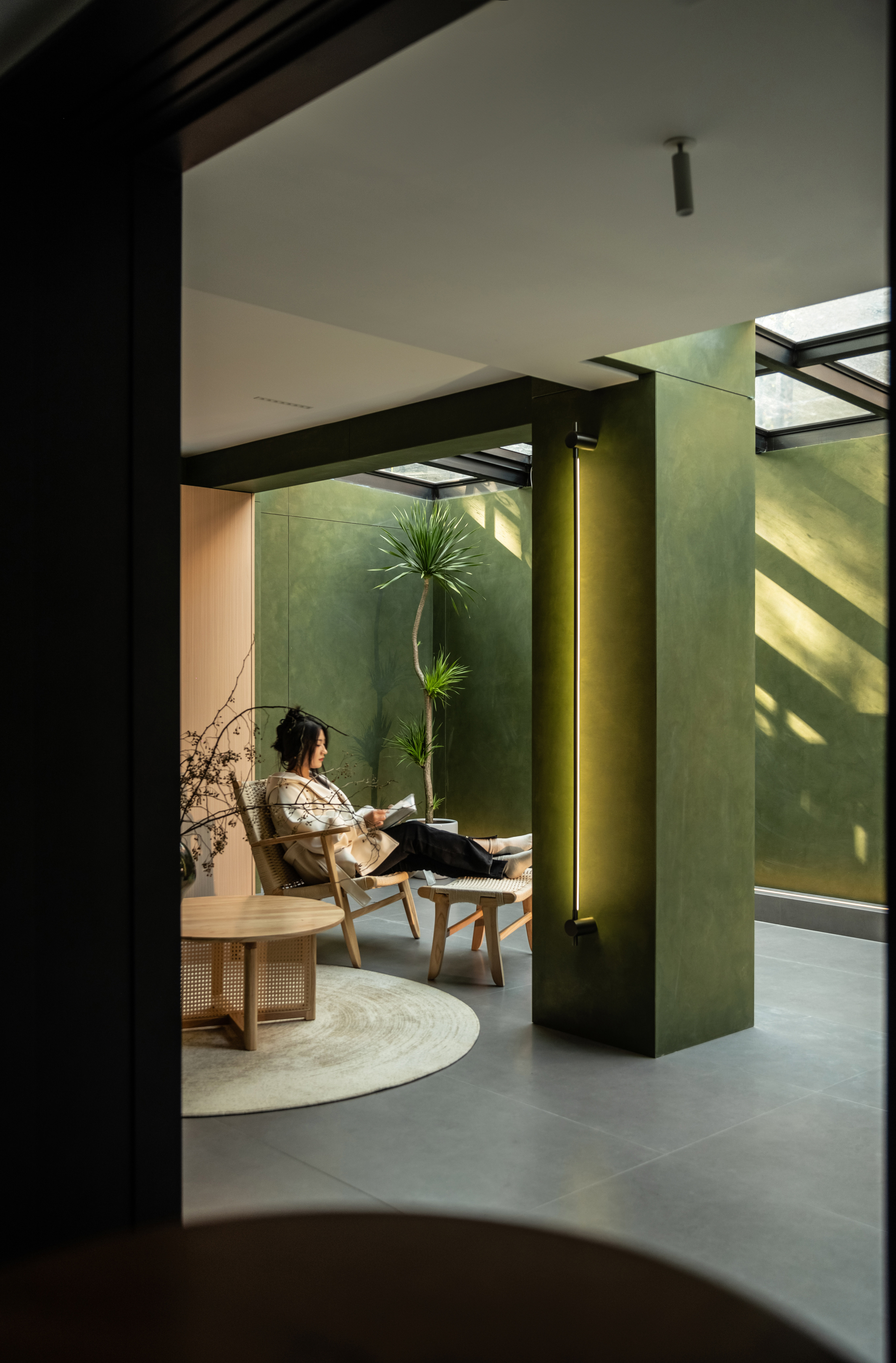 天井将阳光裁剪成阔绰的切片,斜斜地落进室内,绿色的艺术涂料像一层柔和的滤镜,将光线轻轻晕染。