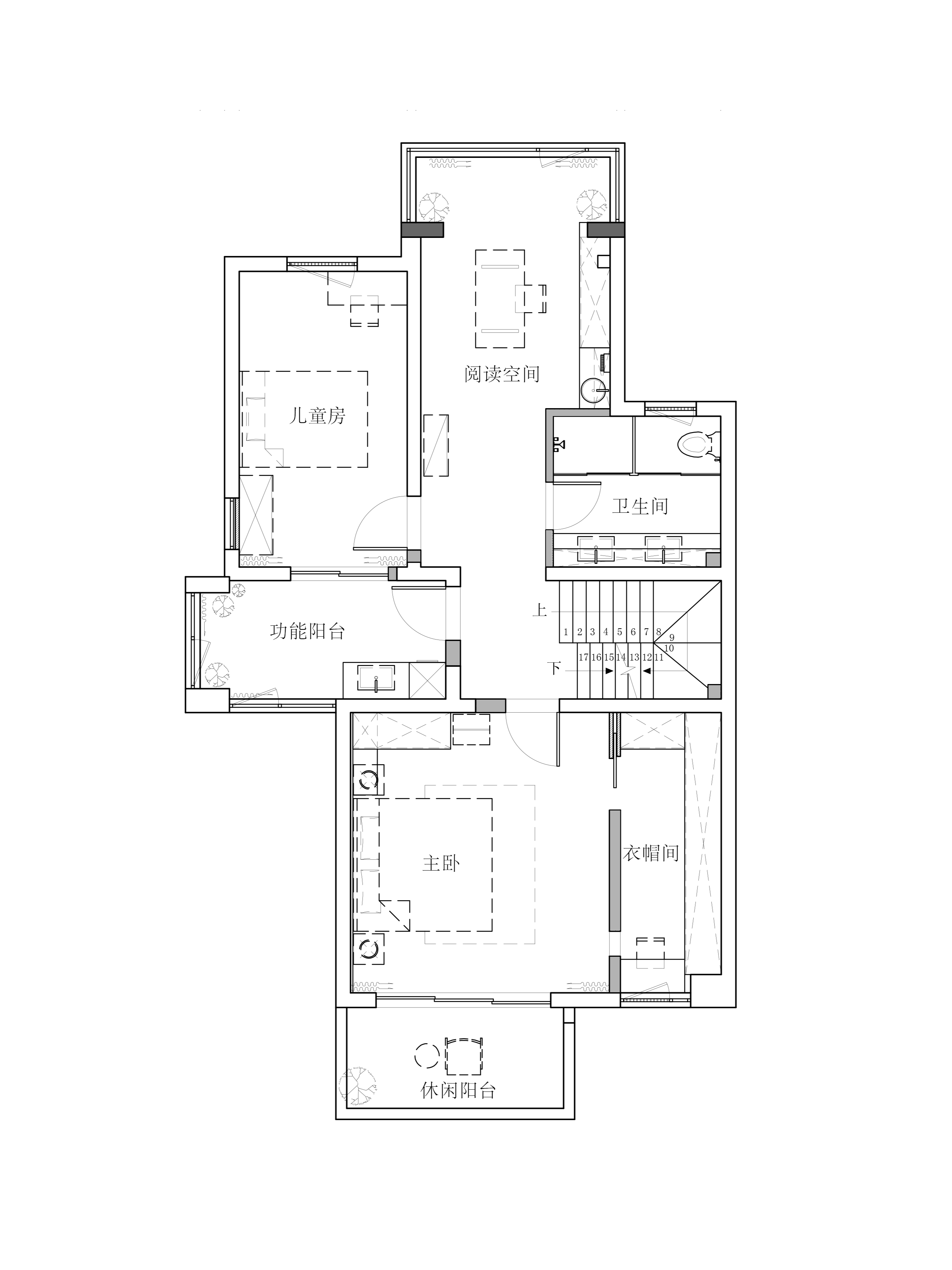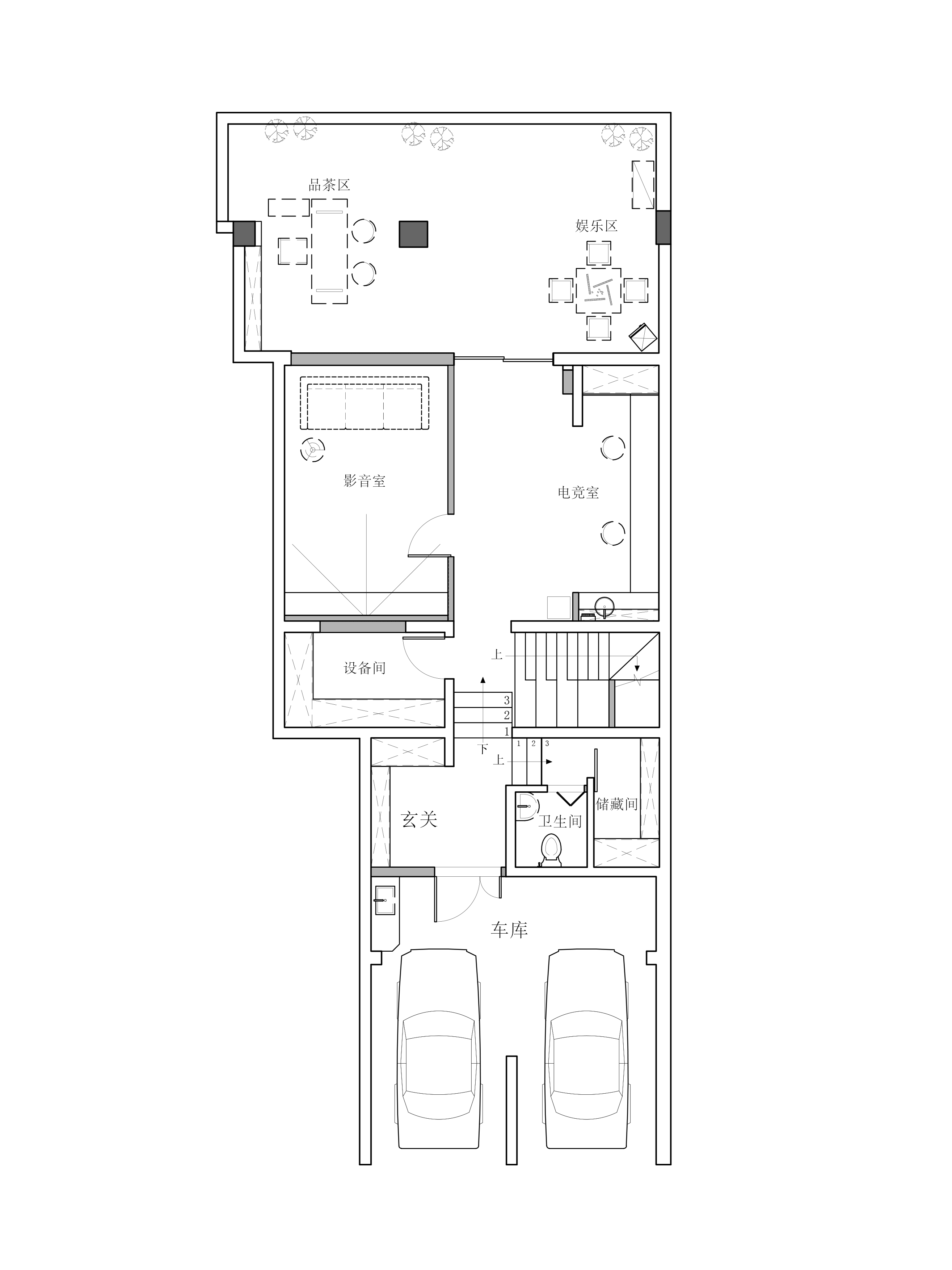 空间布局:采用“垂直动线与视觉联动”系统,在四层别墅中实现分区独立与整体连贯。地下室拓展为家庭社交延伸区;一楼公共区域融合餐厨客功能,形成开放交互场景;二楼主卧与儿童房通过书房过渡,兼顾私密与亲子互动;顶楼预留灵活客房与储藏,为未来十年生活变化留白。