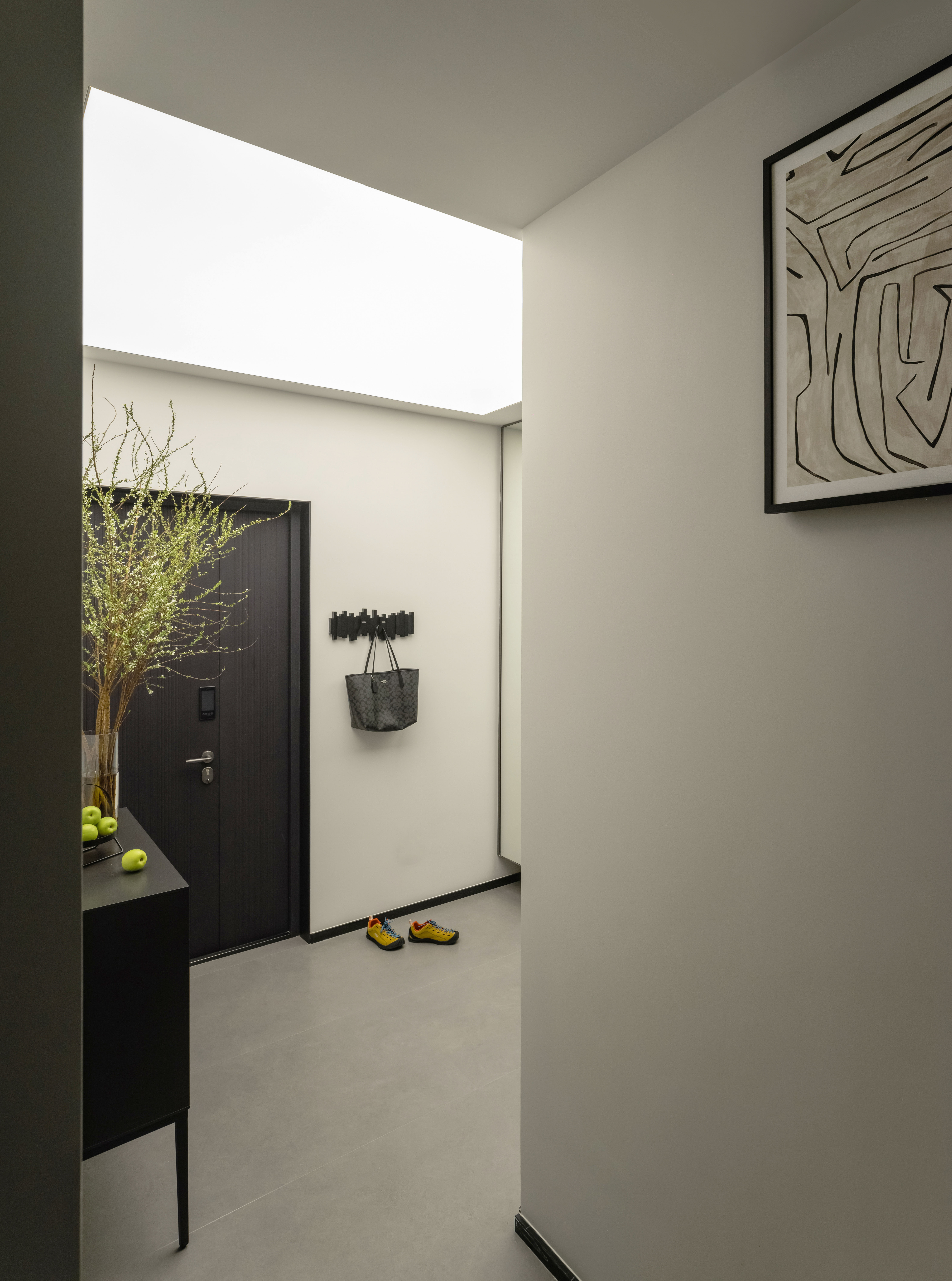 项目定位:本案定位为“静谧的极简主义”,以全案托管模式为十年老客户打造第二居所。设计聚焦于从二人世界到三口之家的功能与情感升级,通过极简线条、黑白主调与艺术软装相结合,在秩序中融入家庭成长叙事,实现“功能与情感温度平衡”的长周期生活设计。
