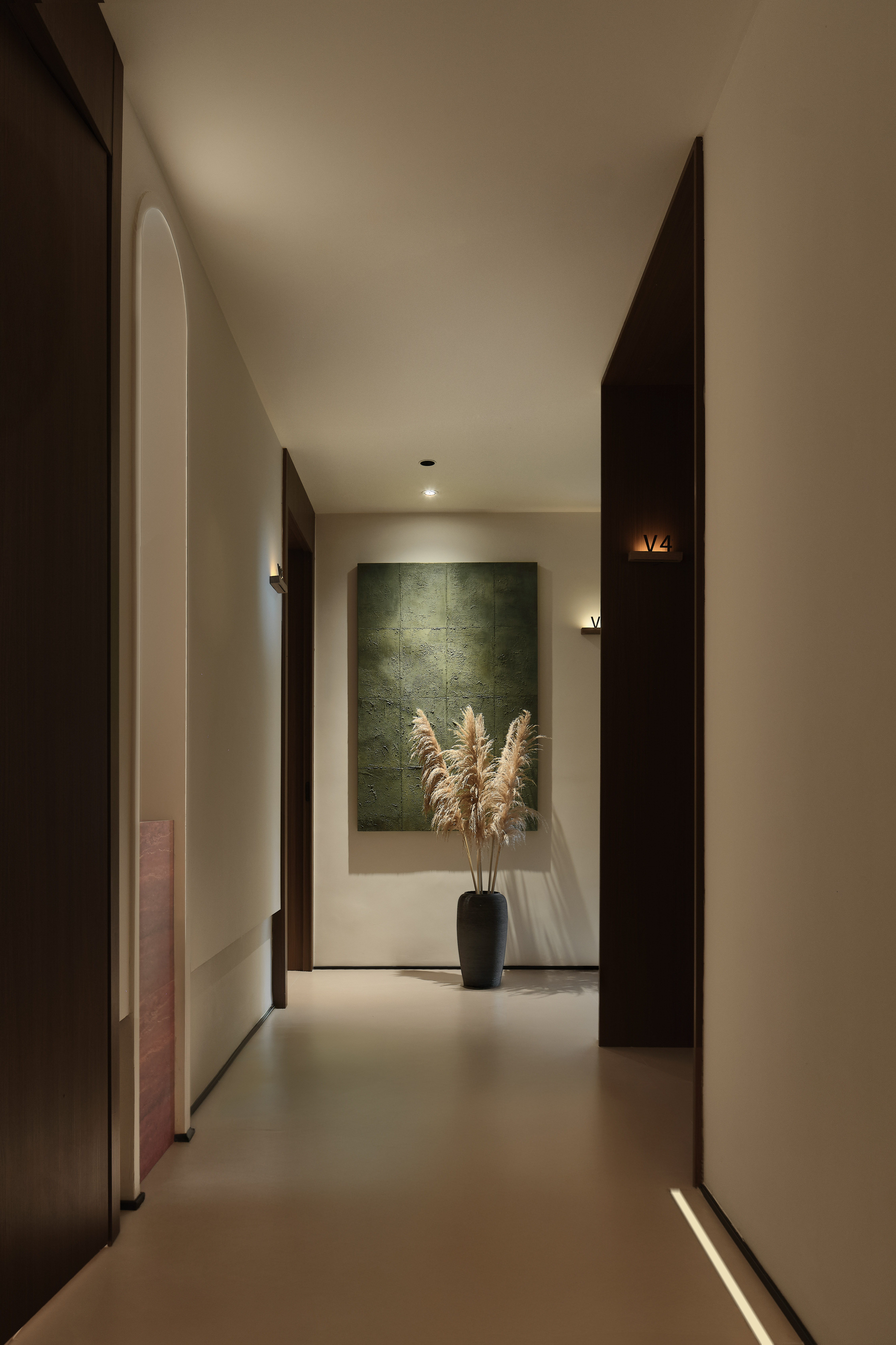 过道向内延伸,逐渐收束了公共区域的开放,沉入更私密的区域。