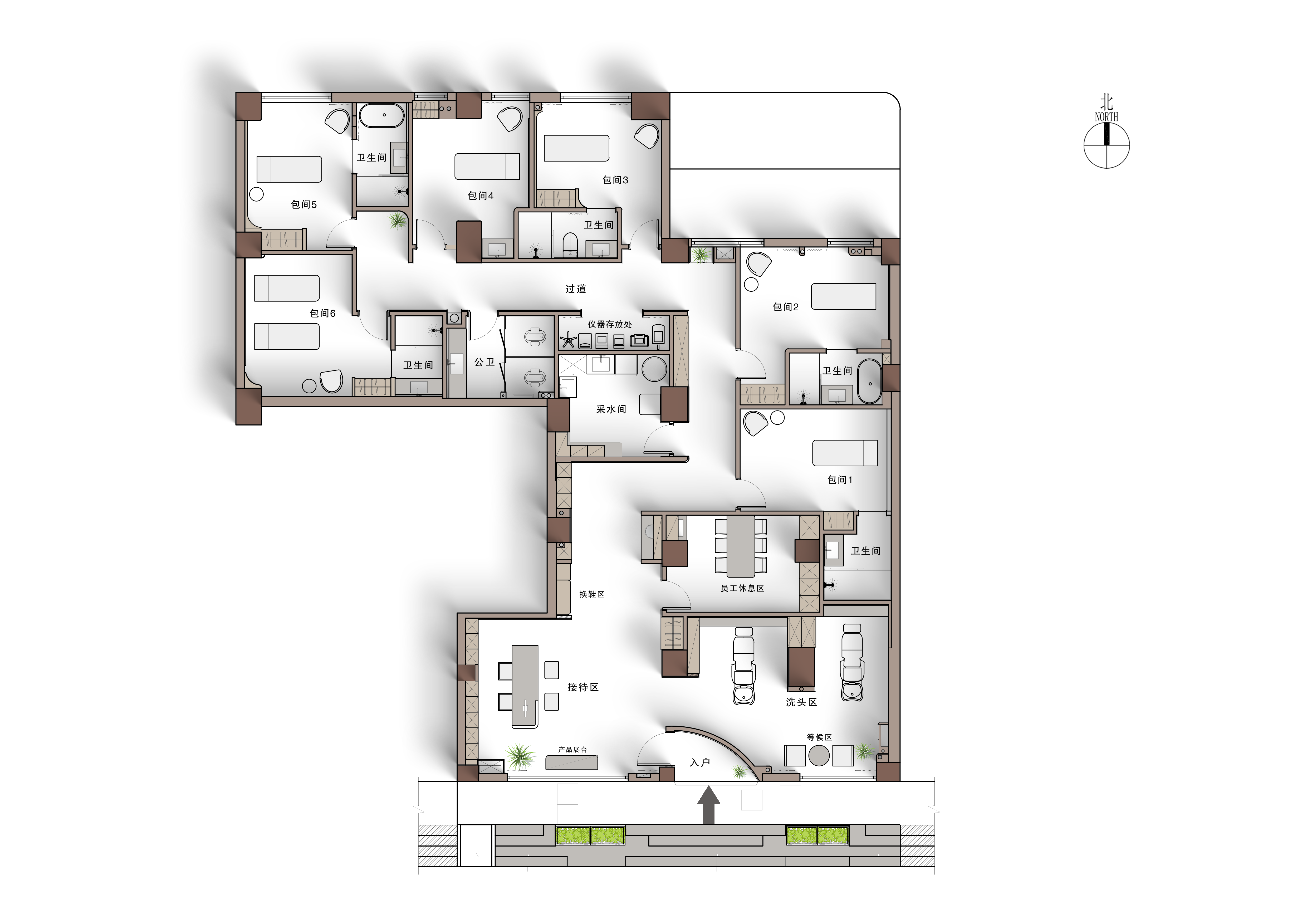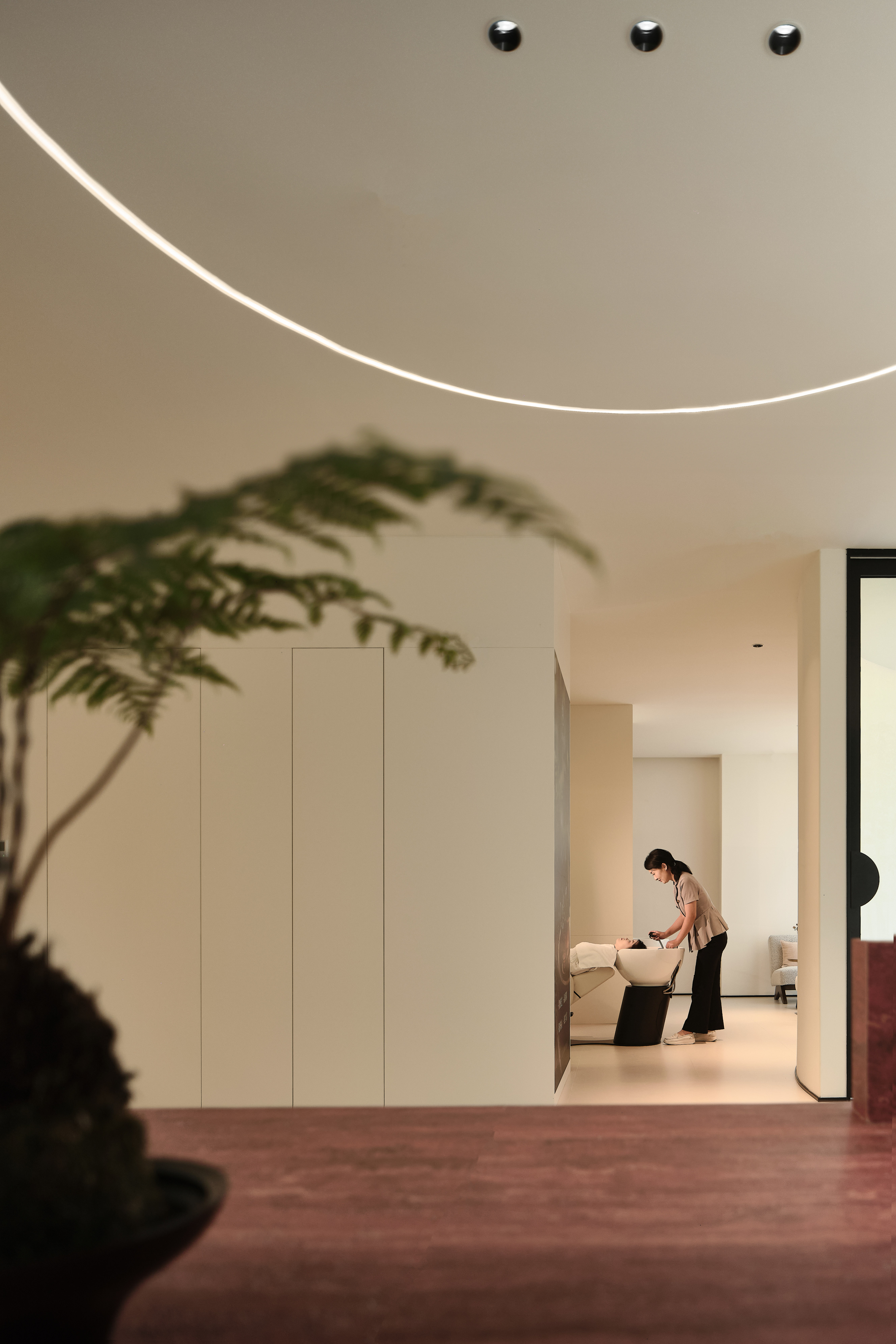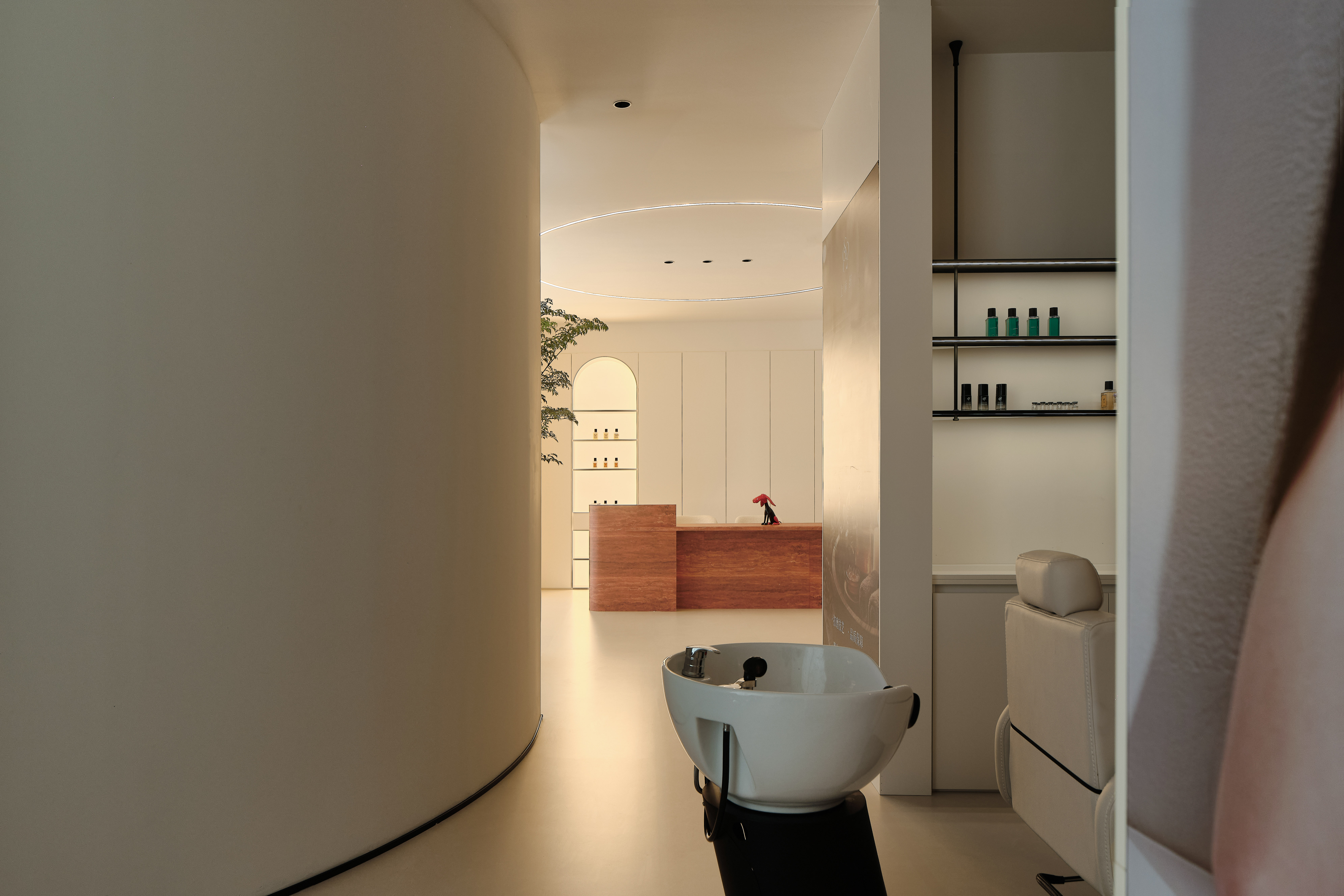 空间布局:由外至内进行整体场景规划:门头以优雅姿态融入街道生活感;内部以大厅为中心,整合前台、洗头区与包间,通过弧线与曲面柔和过渡各功能区域。布局兼顾开放性与私密性,在有限空间中实现接待、护理与舒缓的流畅衔接。