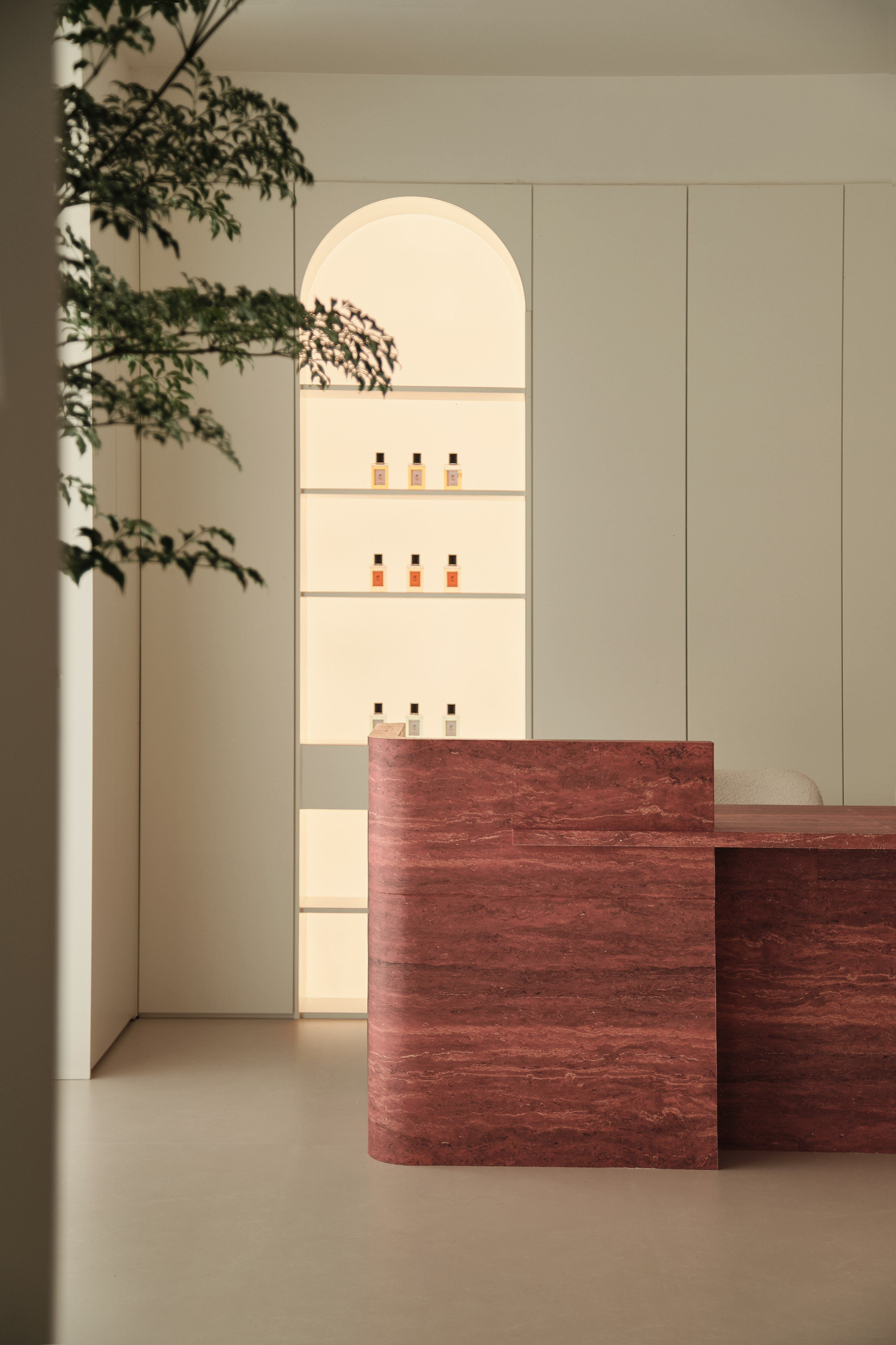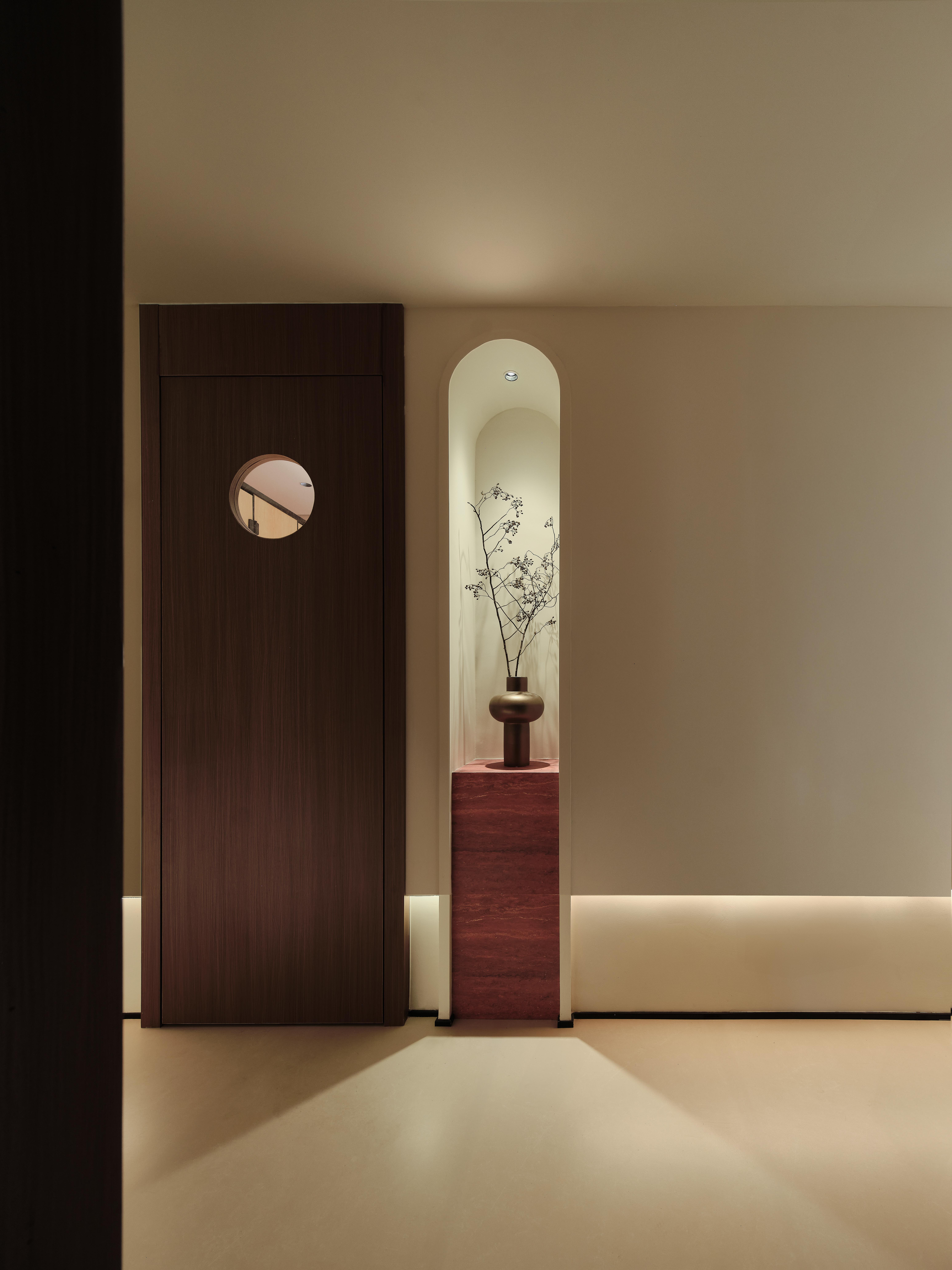 走进店面的第一条过道,光线柔和明亮。弧形的元素从大厅延伸至此,以沉静的姿态迎候每位到访的客人。