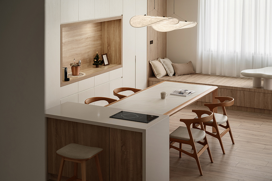 开放式的餐厨区以嵌入IH炉的白色中岛为轴心,让冬日围炉、日常轻食都能于此轻鬆完成;木质餐椅以简约线条呼应空间的无印调性,与纯白檯面形成和煦连结,围塑和谐自然之感;餐桌上方云朵般的吊灯悬浮,拂过轻柔光晕,映照一家人围坐共餐的温馨时光。