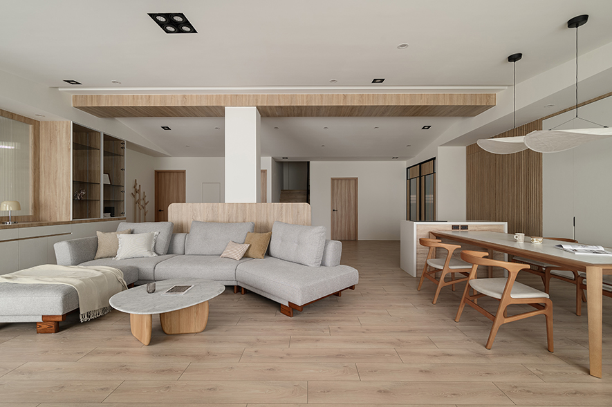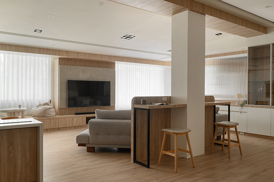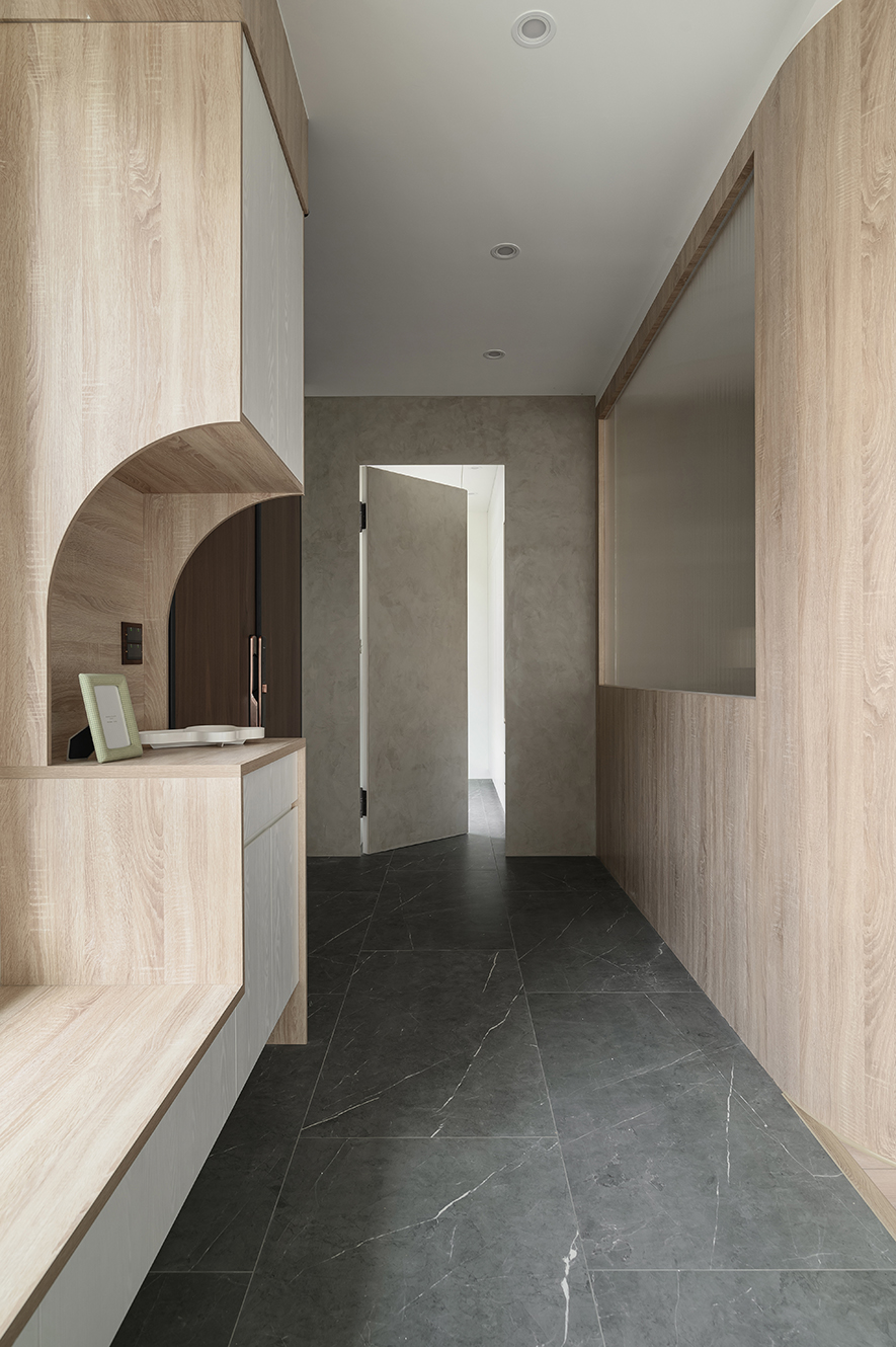 踏入门扉,曲面木作隔屏如月牙般优雅延展,巧妙勾勒出内外之界。窗櫺引入的日光洒落墨玉般的石纹地坪上,形成光律交织的迎宾序曲。弧形木作包樑与玄关柜採用相同浅木质调,从立面延伸至顶塑造连续包覆感,消解原有建筑结构的刚硬转角,犹如安稳的臂弯,静候归人卸下风尘;在这初得安稳的怀抱中,旁侧隔间牆转角的弧形导引柔化空间的转折,更进一步引领从外界喧嚣至完全沉淀内心宁静的步履,在这光线递变的过渡之境,心绪随着曲线的韵律,缓缓沉淀,回归家的怀抱。