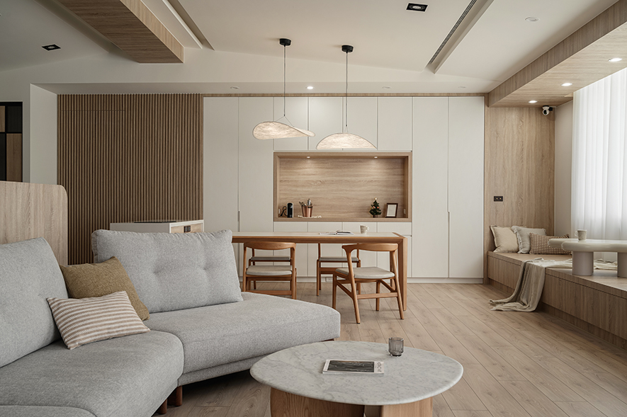 客厅灰色织物沙发低调沉稳,搭配圆形桌面的木质底座茶几,营造质朴而不失雅緻的会客场所;沙发半高背牆巧妙融入工作桌功能,既是空间的分界,亦为居者于开放格局中寻得专注一隅。对向大片落地窗将户外绿意尽收眼底,阳光透过纱帘的过滤,化作柔和的光晕洒落;而窗边长型卧榻以盈润木调材质包覆,素雅软垫相衬,恰似文人雅士的「观景榻」,供人品茗观云、静思冥想。整体细腻回应着生活的多重需求,在开阔无碍中保有各自的场域感,让日常的每个片刻都能找到最适切的安放之处。