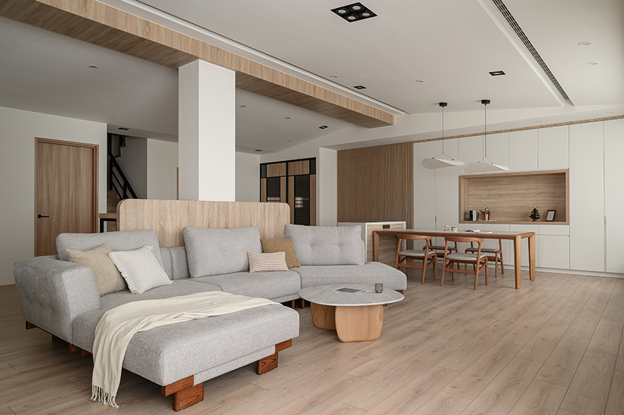 棠禾设计 设计总监 曾智和 以日式无印风格重塑老屋,将原有大樑化作斜屋顶的建筑语彙,既是结构的巧妙转化,更是「家」的意象具现;弧形木作与长虹玻璃的组合,柔化刚硬转角,让微光如流水般游移穿梭,晕染出似有若无的氤氲光氛,增添居家的诗意美感;格栅元素间或点缀于天花与牆面,编织富有韵律的视觉层次。纯白立面与浅木质调的和谐对话,辅以铁道砖的细腻纹理、圆润家具的温润触感,共同构筑开阔而温暖的生活场域。