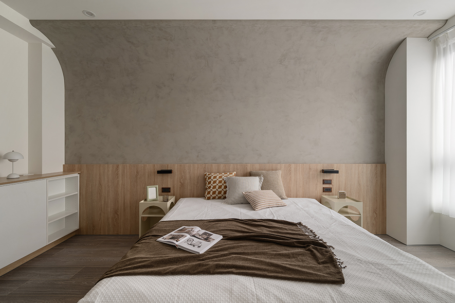 延续一室素淨的木质调性,主卧以轻盈曲线开展空间序章,巧妙化横樑的突兀感为优雅的曲面语彙。天然的木纹床头板如大地般沉稳厚实,衬托灰白色调牆面,造就宁静致远的休憩氛围。两侧的圆弧造型床头柜,以几何线条勾勒出柔美轮廓,上方搭配黑色壁灯,更显静雅沉稳,编织出一方安适的梦境之所,伴随居者夜夜好眠。