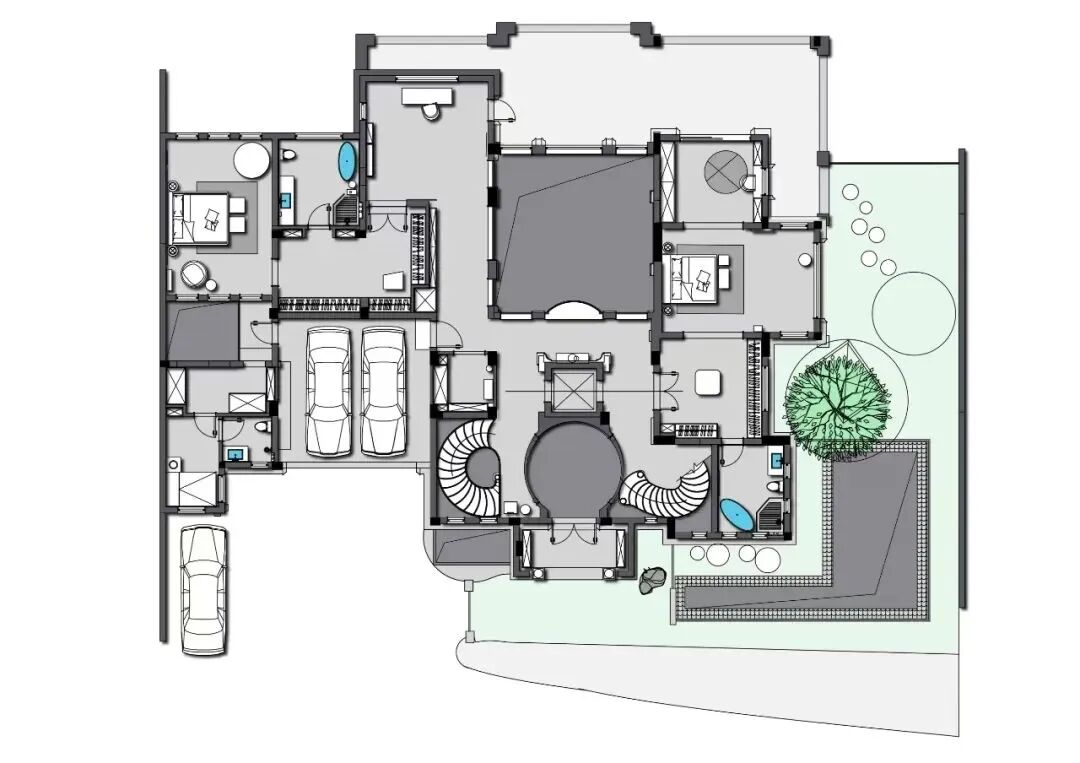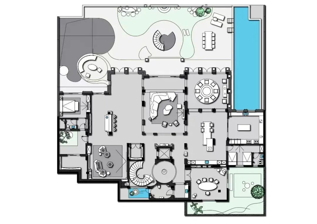 项目定位:当代大宅别墅设计中,大多都面临着如何兼具家人间的互动性与独立性的现状。在该项目里,设计师张国良选择以「融」的态度,将家人间的交互性与代际间的独立性具象化。