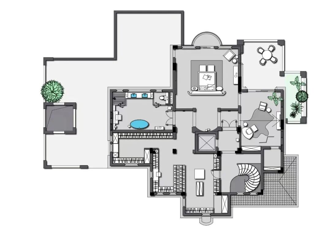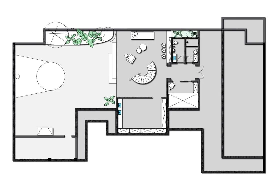 空间布局:作为典型融合了古典与现代元素的建筑,设计师决定让内部空间与外部建筑保持统一性,在空间多处细节中塑造欧洲古建筑的语言符号。为丰富空间层次,设计师以半圆石材线条柱上墙,并以疏密变化形成空间律动。