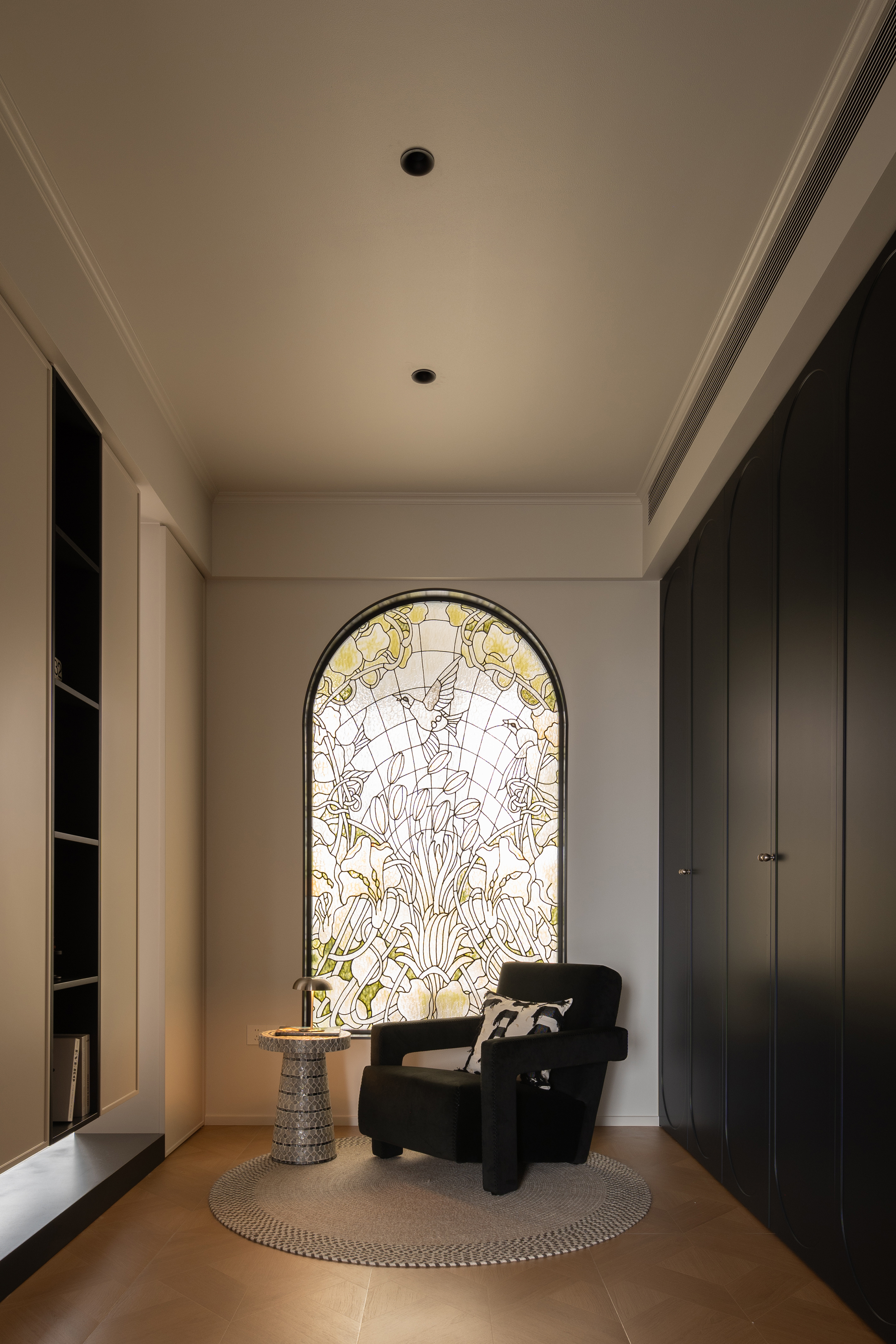 空间意境:主卧空间的透景增添了空间的趣味性,尤其是打开那扇弧形门,被那花鸟玻璃所吸引,当阳光洒进来,花鸟好像活过来了。