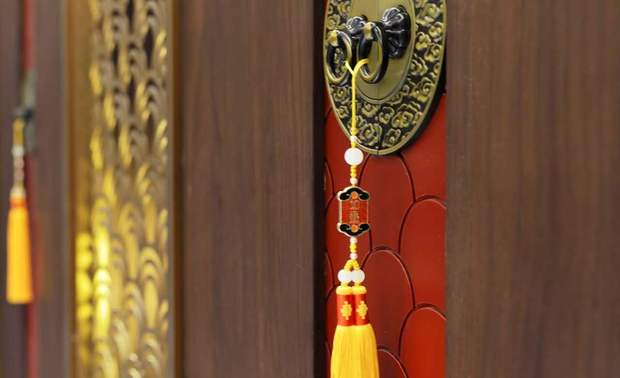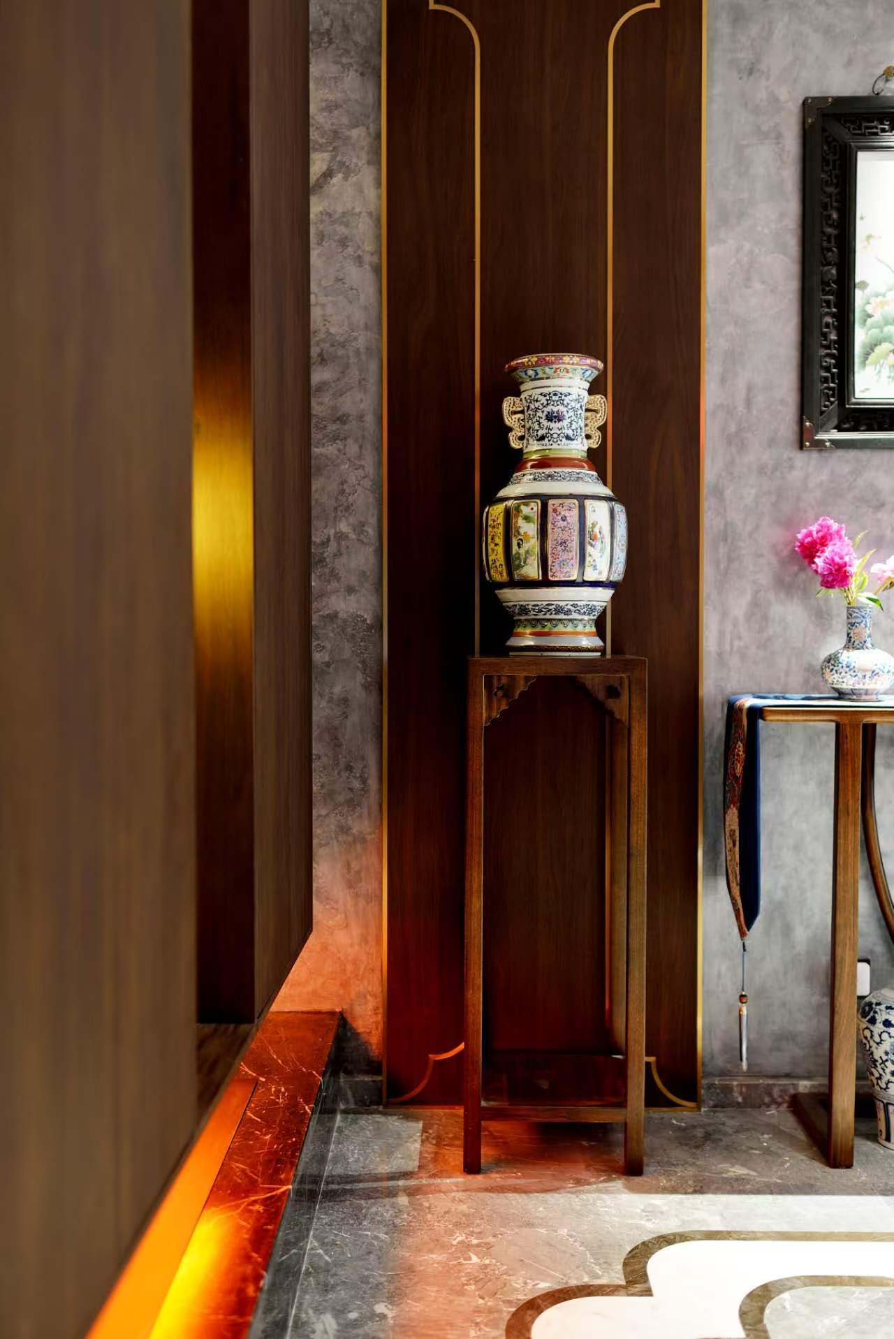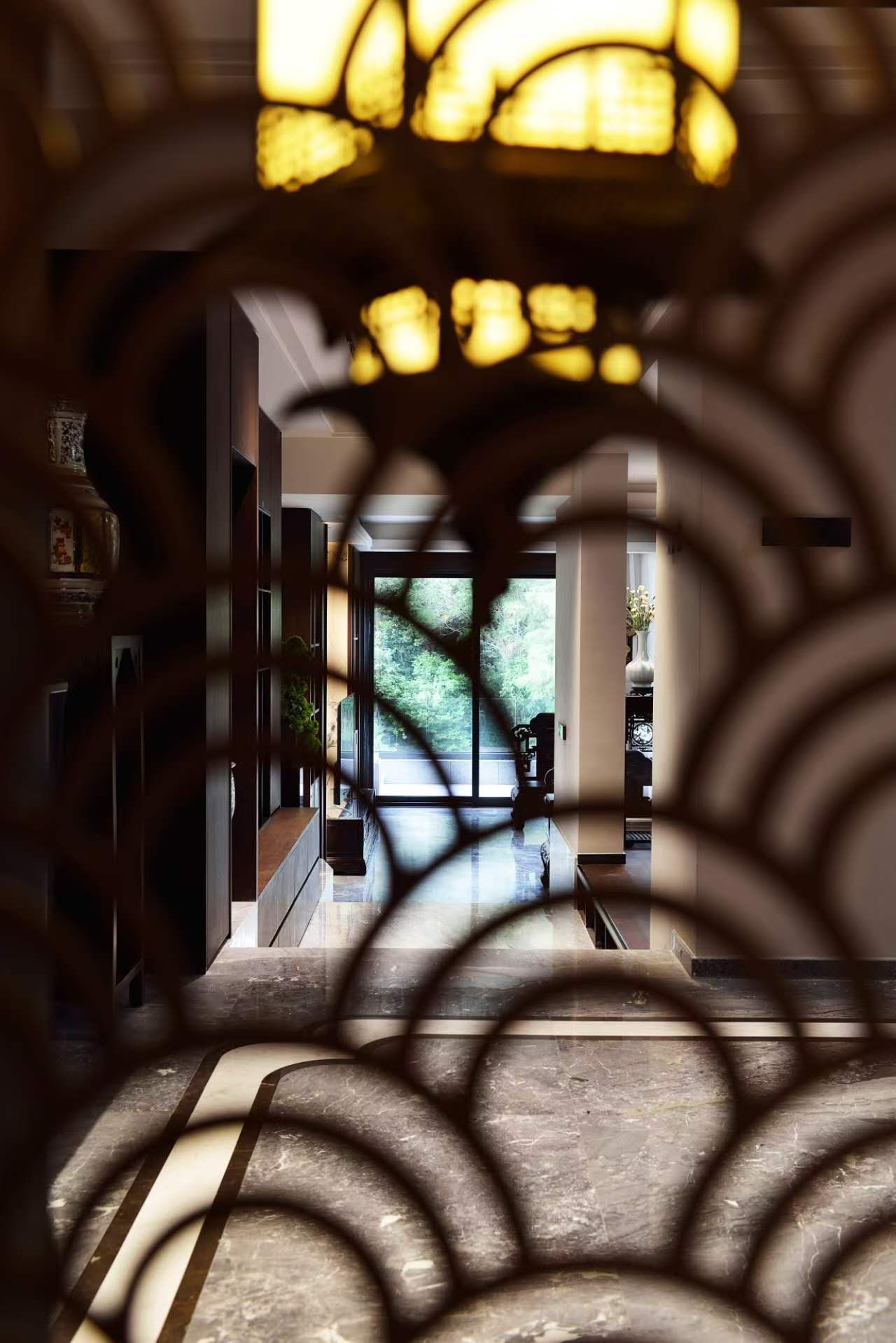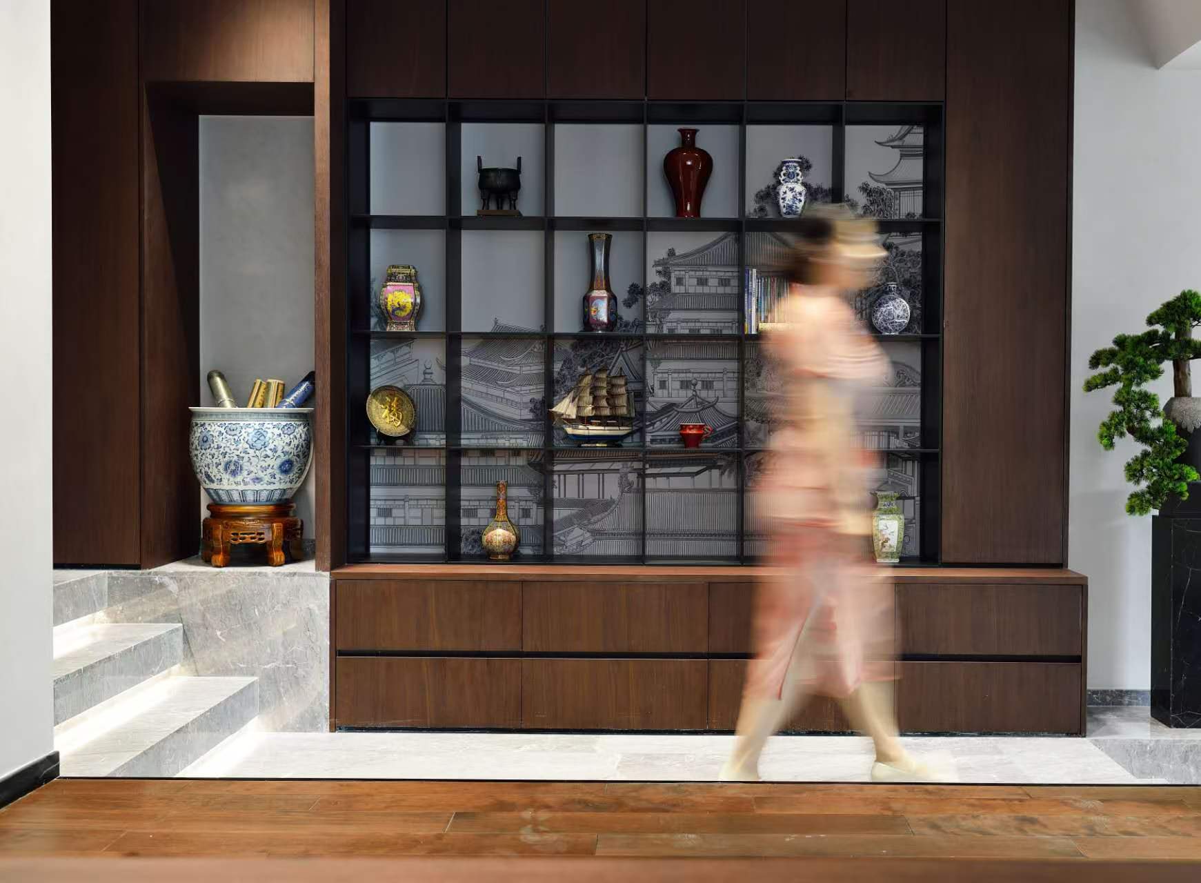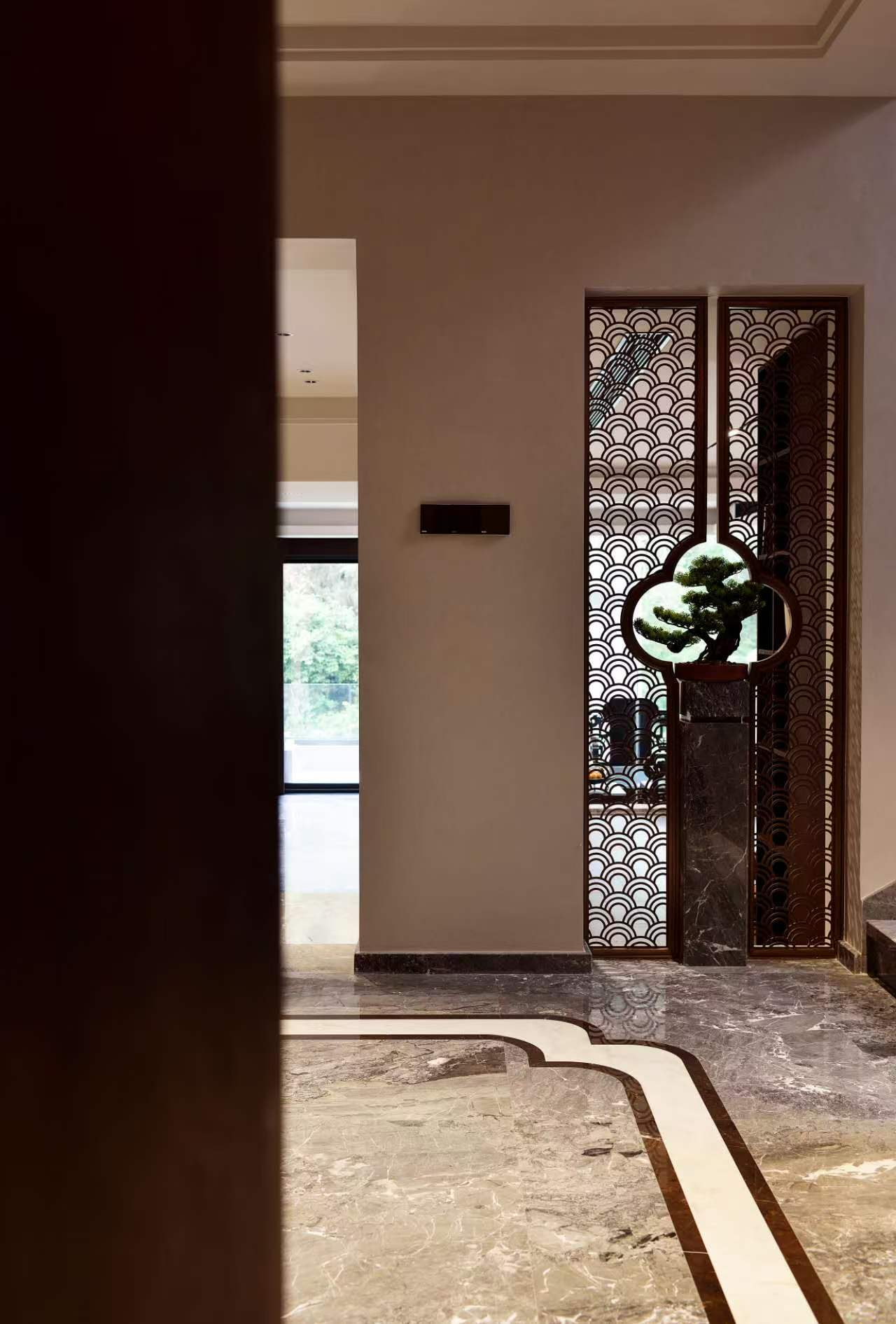 阅读区的随性设计,可以让我们席地而坐,一边喝喝咖啡,品尝水果的同时一家人聚在一起玩玩游戏聊聊天,或者小孩子也可以在这里看看书,写写字。旁边的书柜背景中亭台楼阁的图案结合一些瓷器的摆件,让这个空间更富有书香门第的韵味从庭院进来,打开入户门的那一刻,我们就希望财气和好运都能带进来,不同工艺的鱼鳞纹造型与壁炉之间营造出了高贵丰富的玄关处所,从进门的那一刻起中国制造的这种独一无二的东方韵味便感染到你的灵魂深处。