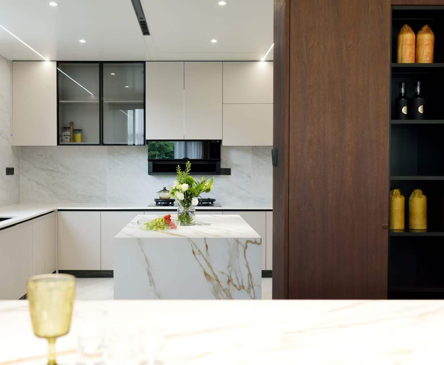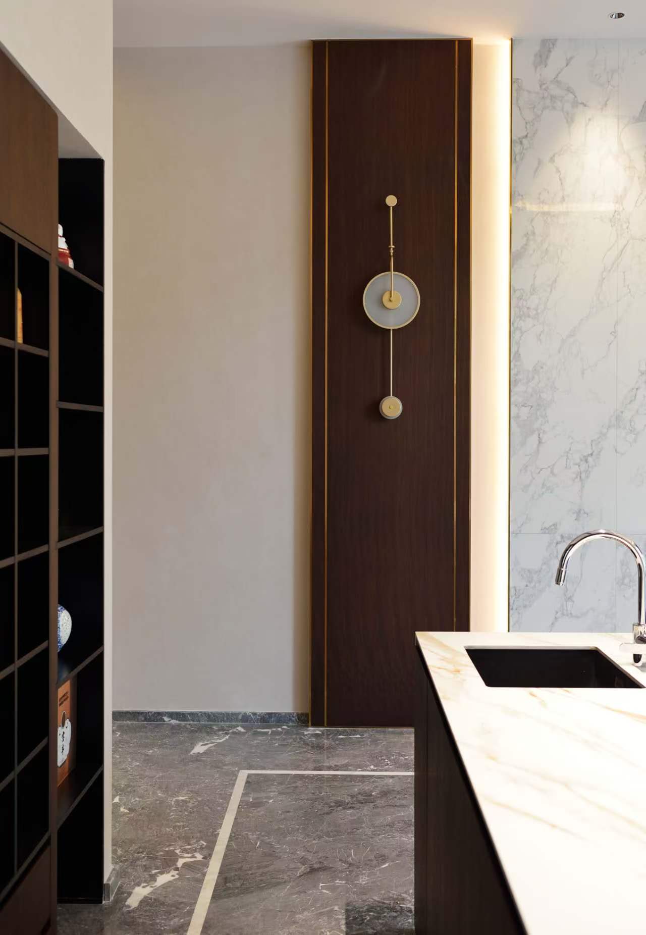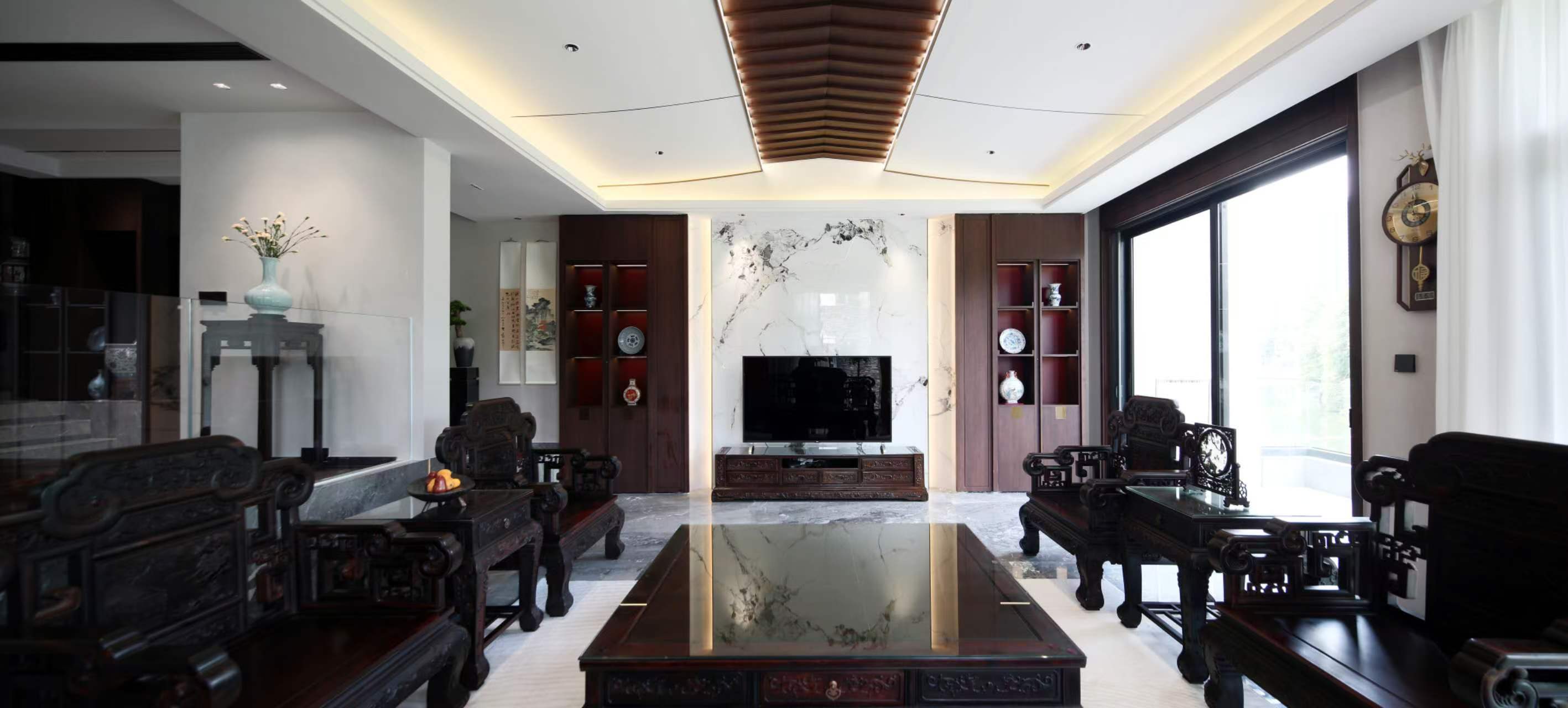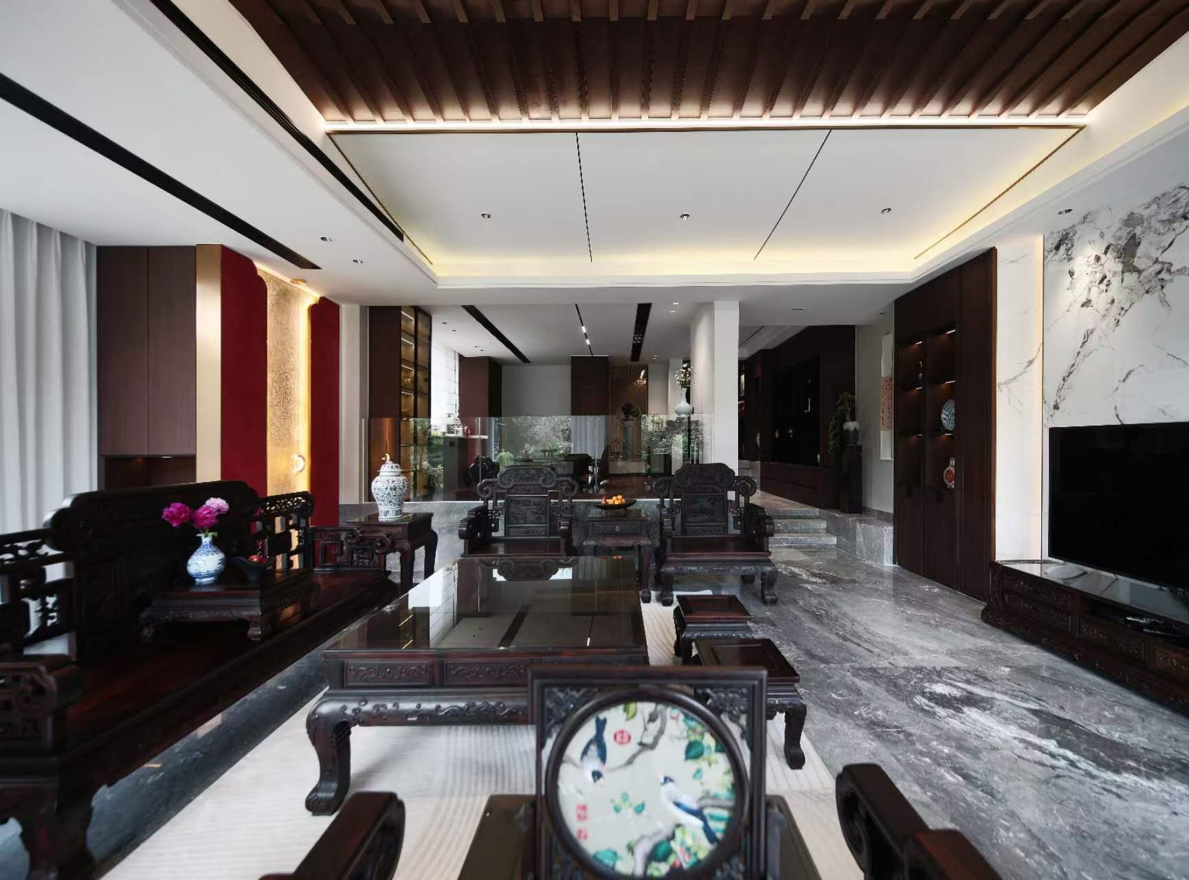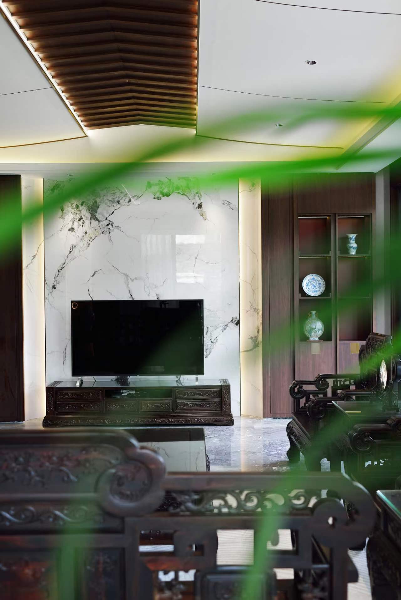客厅的中式斗拱结构的木质天花结合飞燕的屋檐天花设计,让空间变得不那么深沉,从而很灵动,把中式的建筑美引向室内。地面大面积的大理石结合电视背景的一些岩板元素,把自然的元素与科技的元素相融合,彰显大气的同时,我们又要精致。