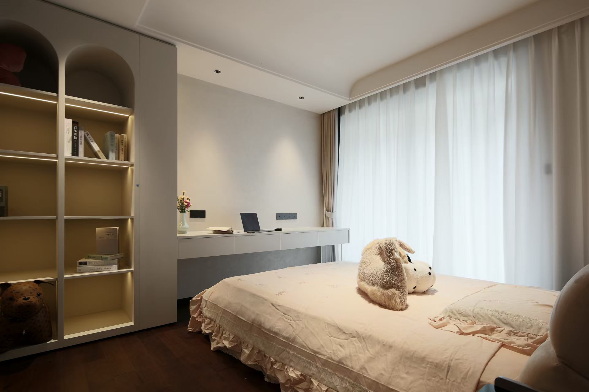 阅读区的随性设计,可以让我们席地而坐,一边喝喝咖啡,品尝水果的同时一家人聚在一起玩玩游戏聊聊天,或者小孩子也可以在这里看看书,写写字。旁边的书柜背景中亭台楼阁的图案结合一些瓷器的摆件,让这个空间更富有书香门第的韵味 -
