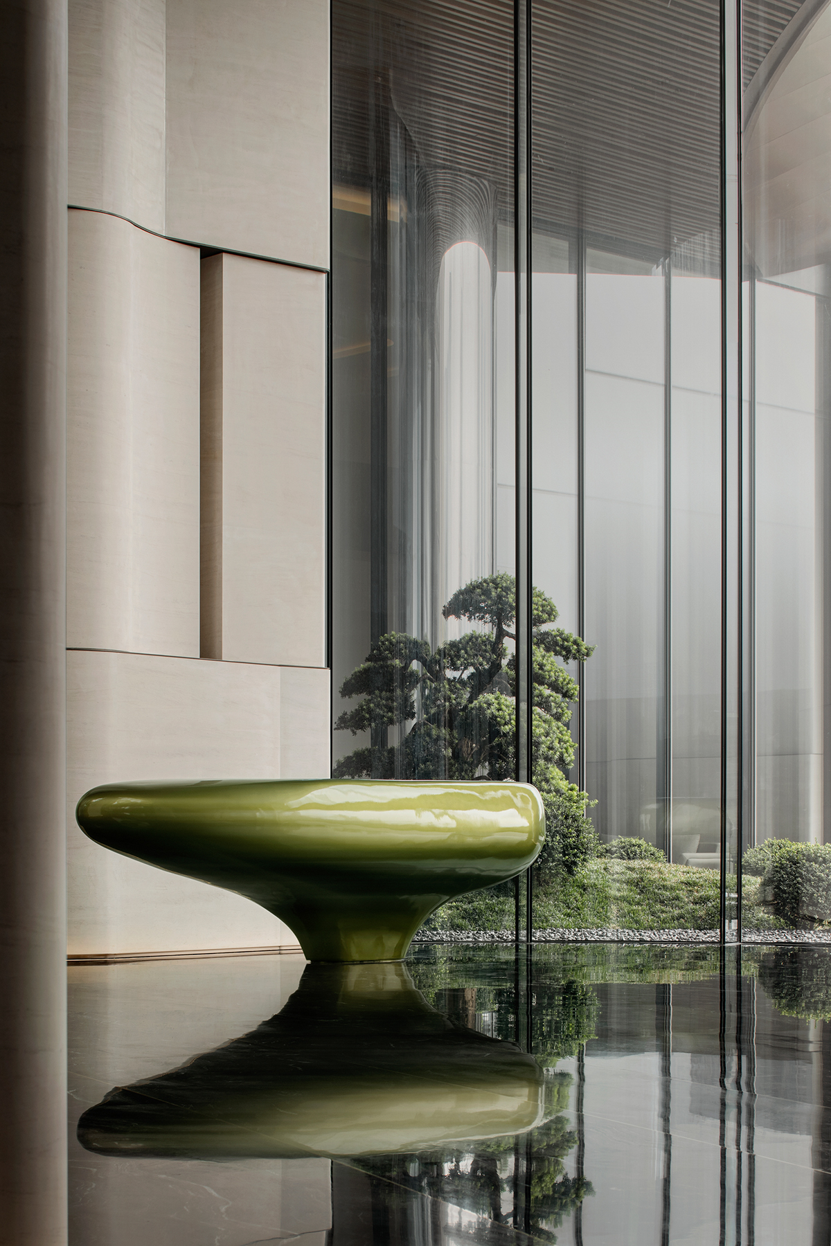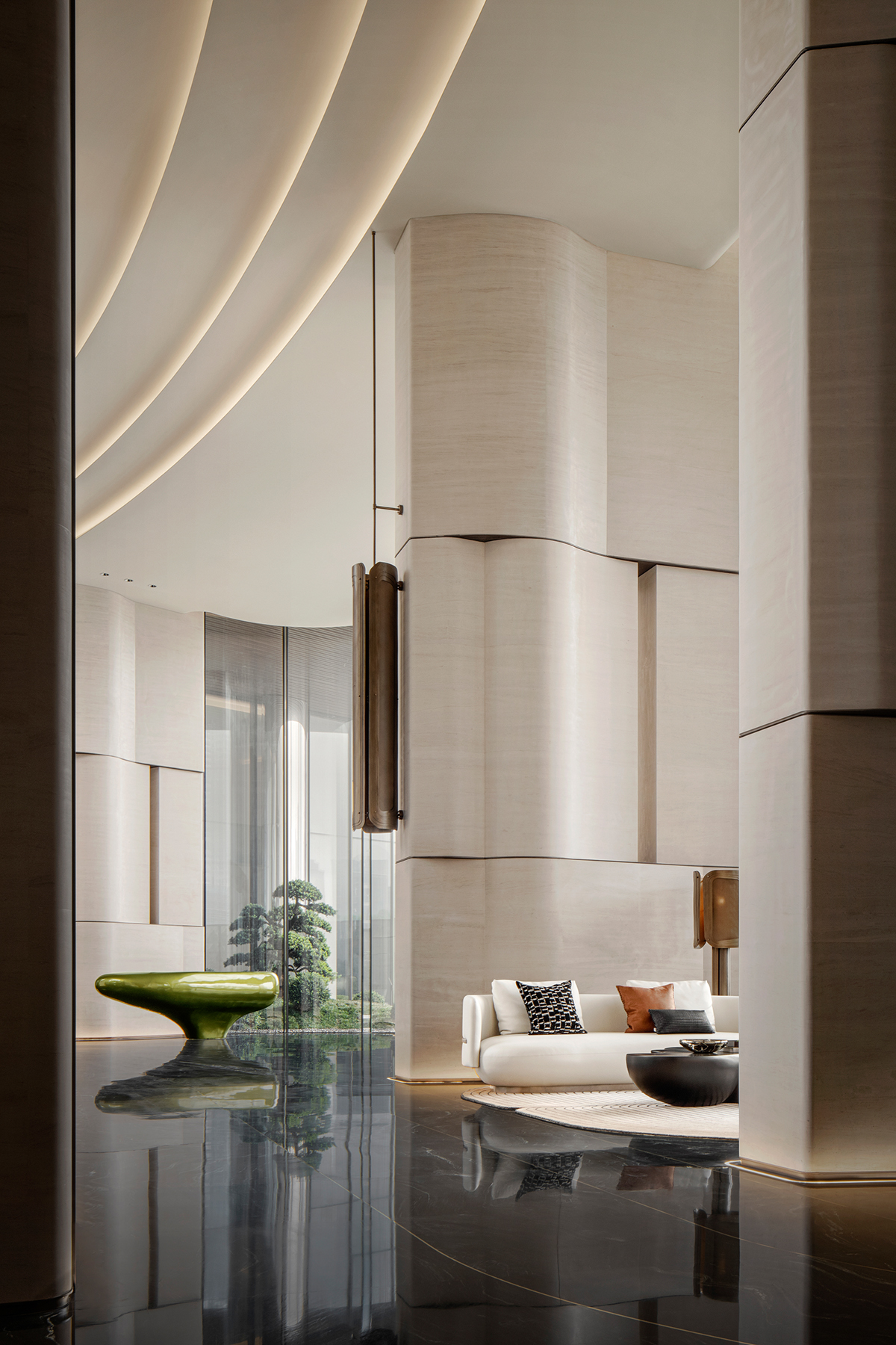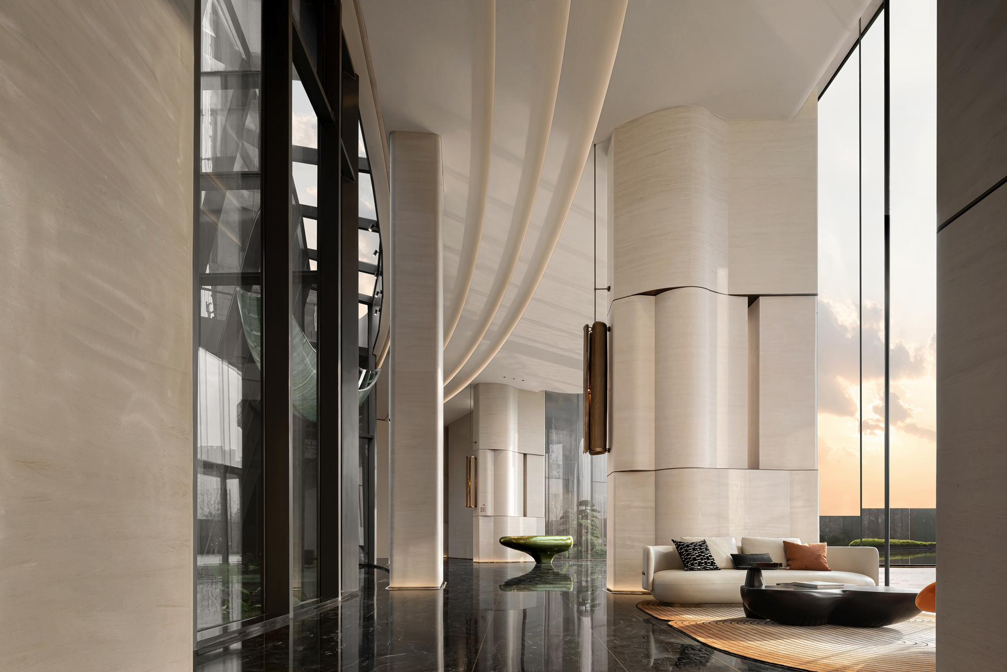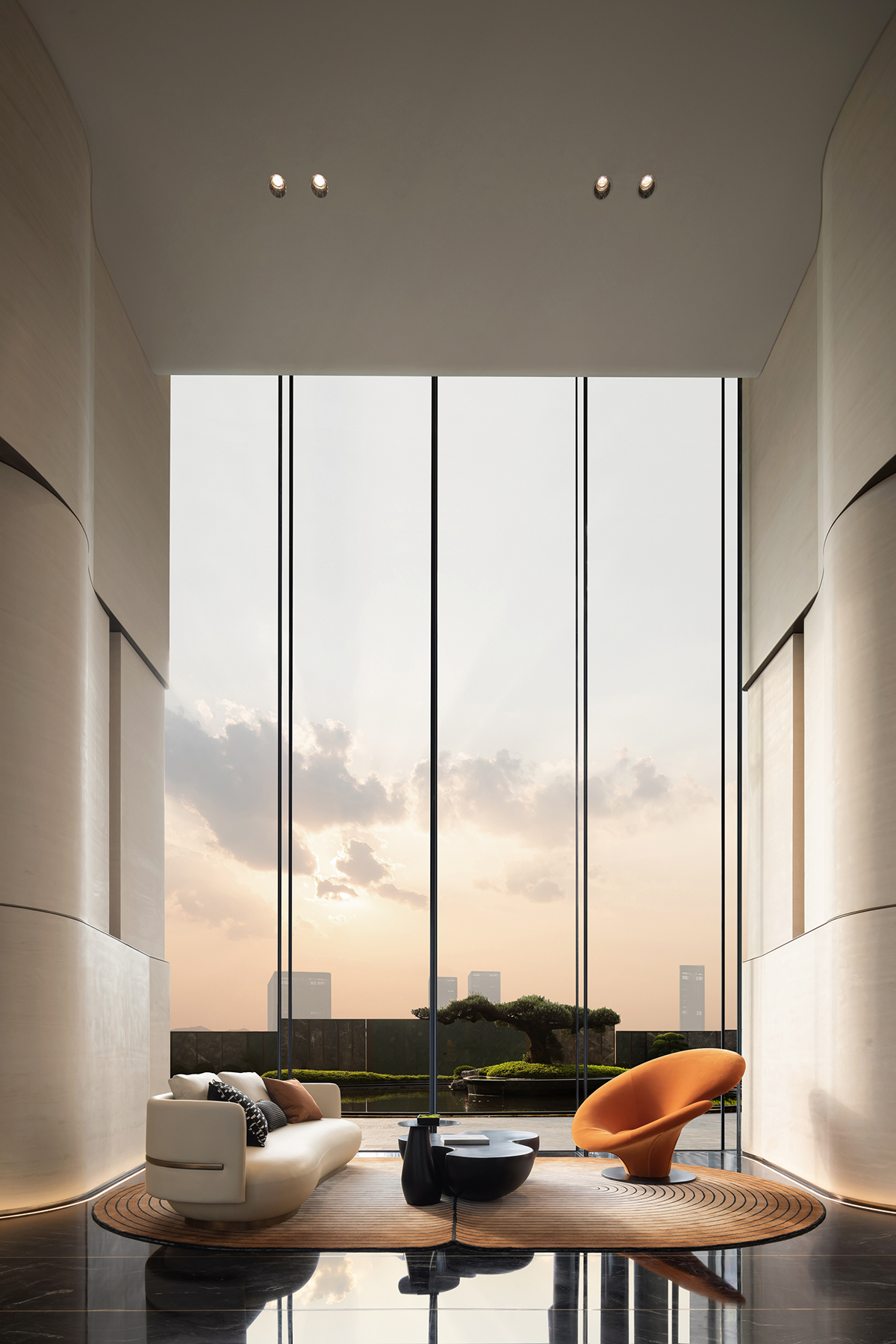 空间布局:大面积留白构建东方诗意,超尺度落地玻璃将室外自然景观与室内空间无缝衔接,营造浑然天成的和谐之美,绘就四季更迭、日月轮转的绝美画卷。光影在自然的空间错落有致,交织出无限生动与灵气,细腻地勾勒出静谧而奢华的人文魅力,丰富着空间的层次与深度,在不经意间流露出对生活品质的极致追求。