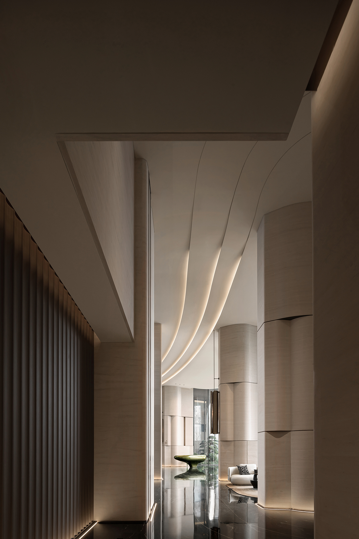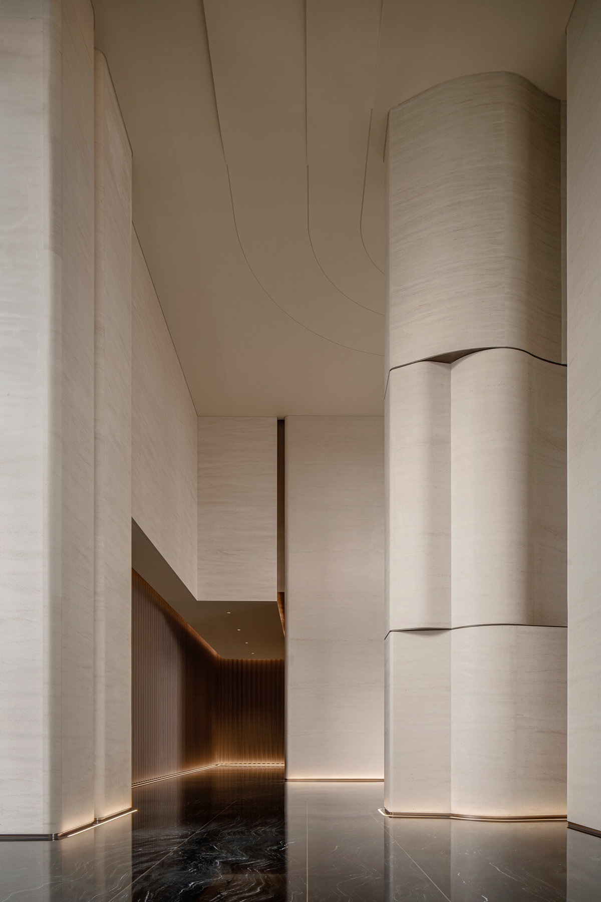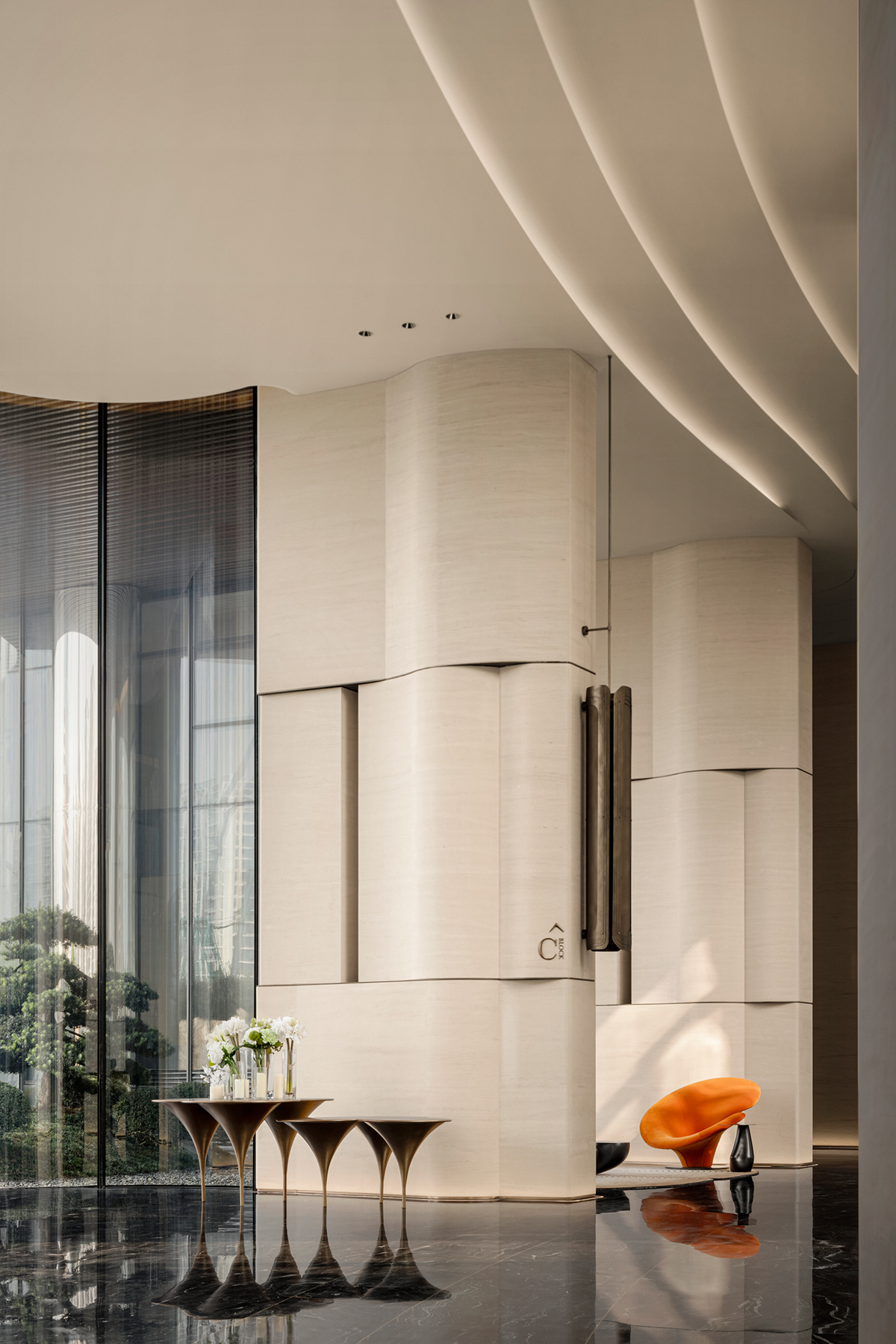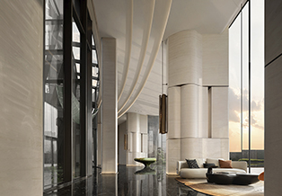 设计选材:柱体立面以淡雅洞石铺陈,家具则巧妙汲取自然界的延伸色调,宛如山水云游间自由流淌的韵律,引领着人的心灵步入一个静谧而深远的世界。内外光线自然穿透,注入了空间变化的戏剧性,展现出一种难以言喻的闲雅趣致,更让细微的肌理艺术在光影变奏下愈显灵动。