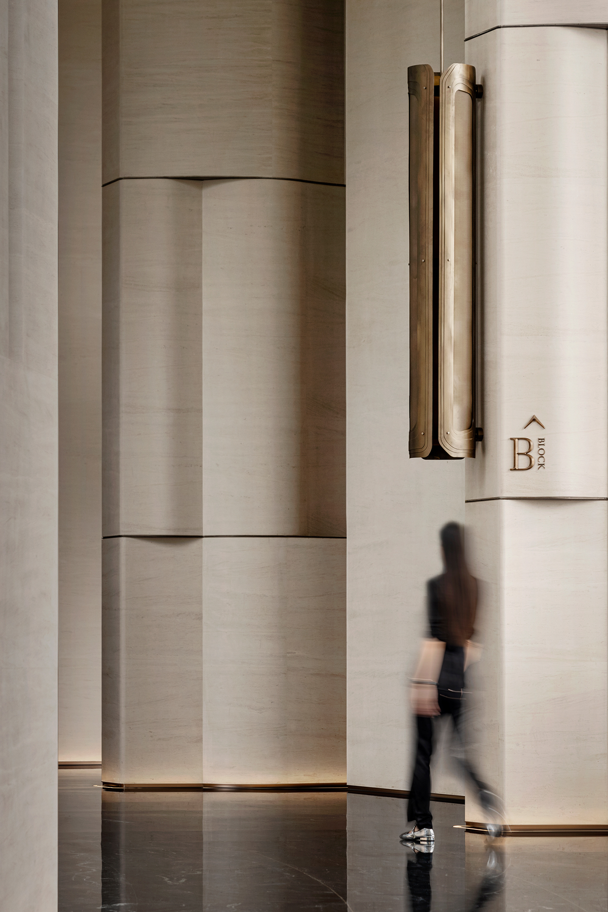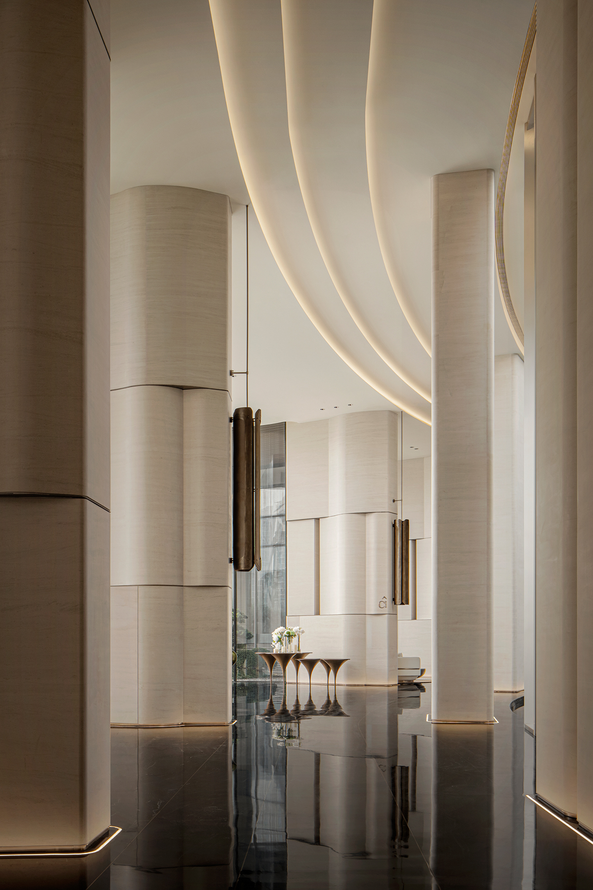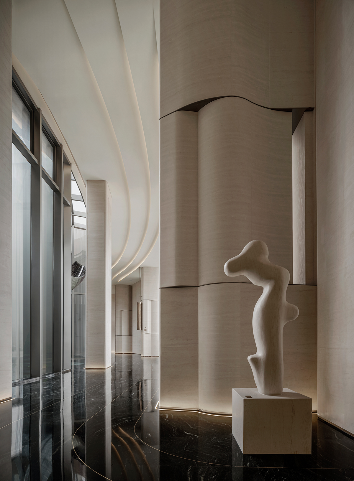 设计选材:柱体立面以淡雅洞石铺陈,家具则巧妙汲取自然界的延伸色调,宛如山水云游间自由流淌的韵律,引领着人的心灵步入一个静谧而深远的世界。内外光线自然穿透,注入了空间变化的戏剧性,展现出一种难以言喻的闲雅趣致,更让细微的肌理艺术在光影变奏下愈显灵动。