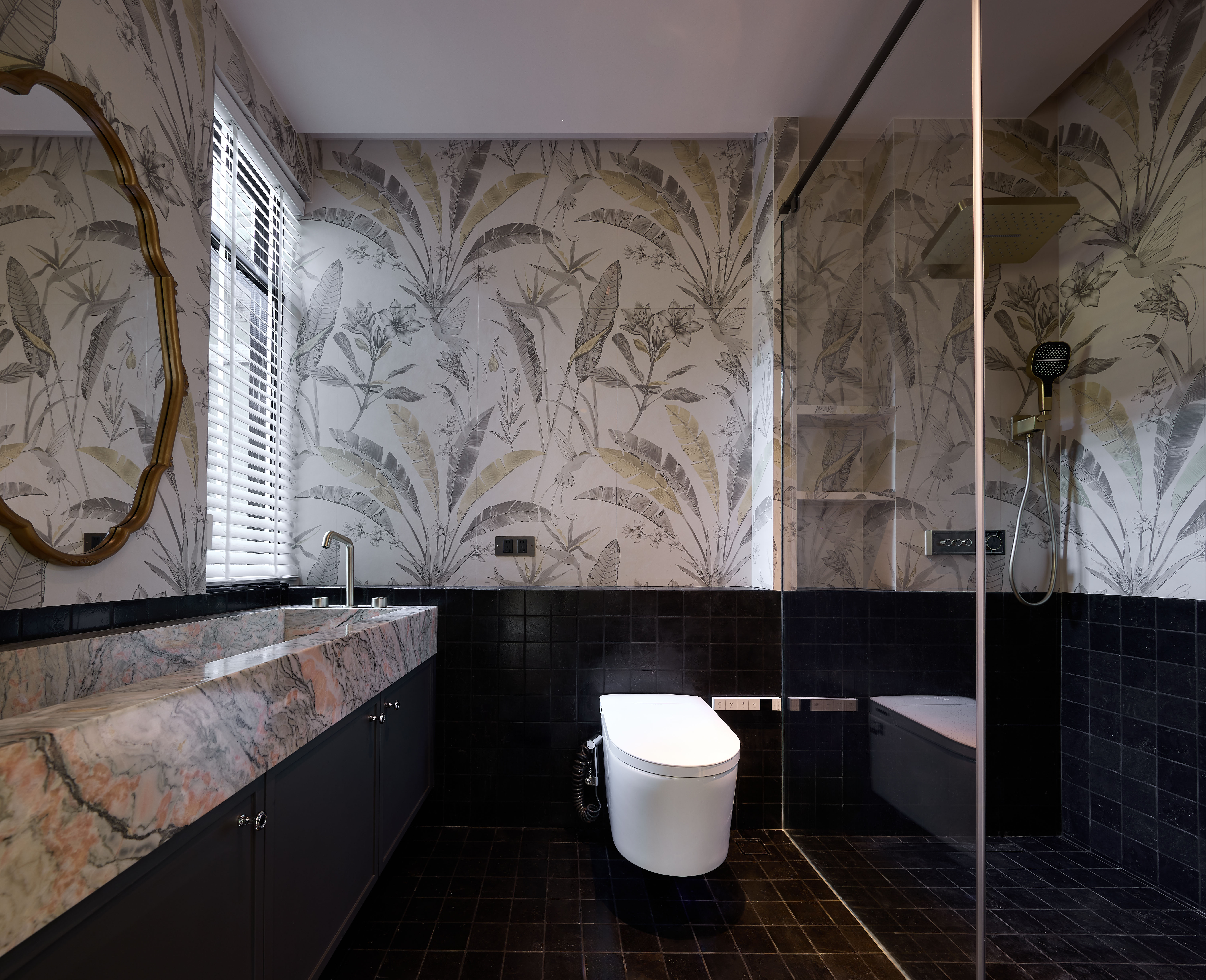 极繁造就极致浪漫,花砖和石材材质的碰撞让主卫空间非常有灵气,黄铜和老木头为空间塑造出一种精致、复古情调,下降高度的梳妆镜满足女主人坐着化妆、护肤的需求,这矜贵的一幕总能让人联想到电影里的女主~