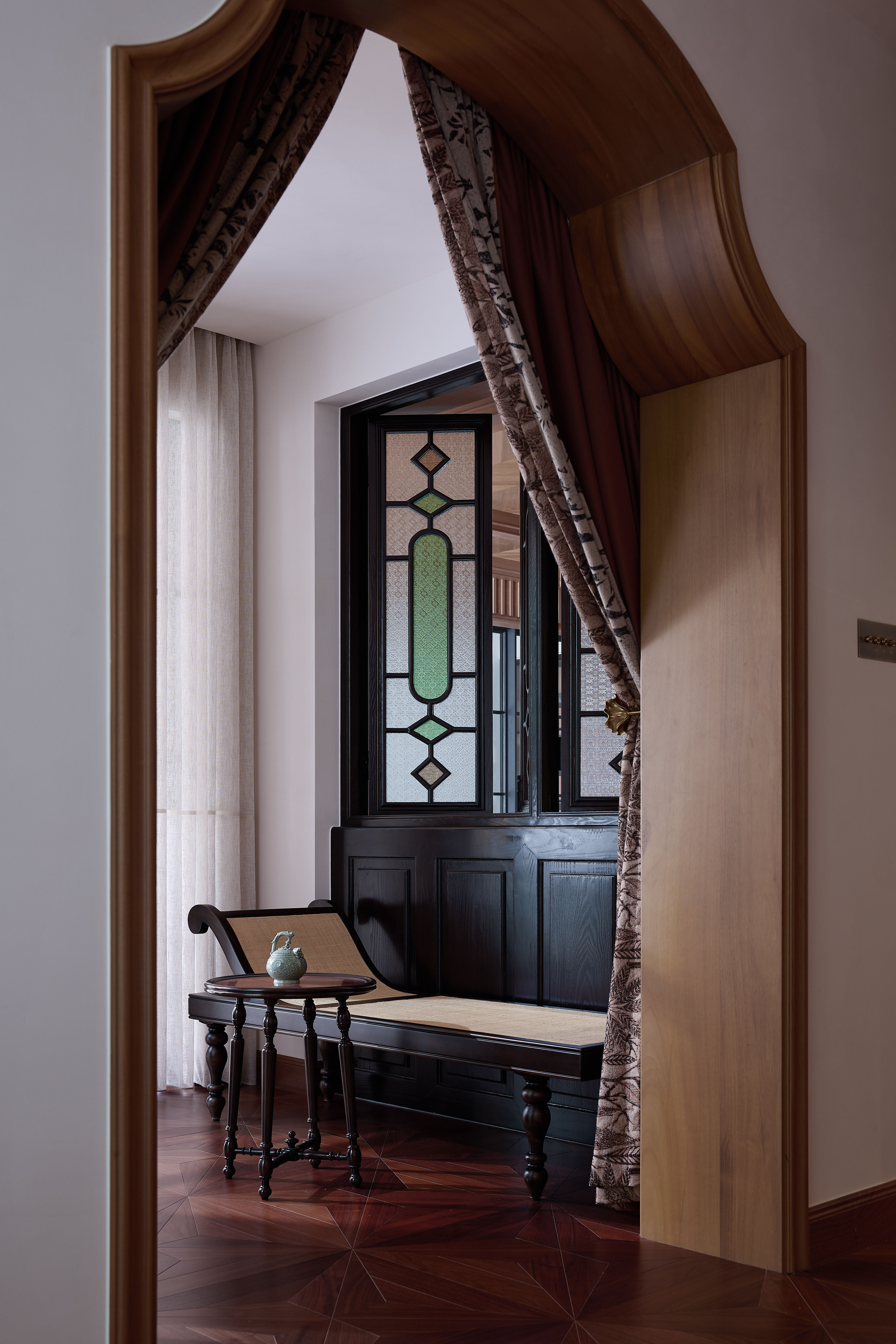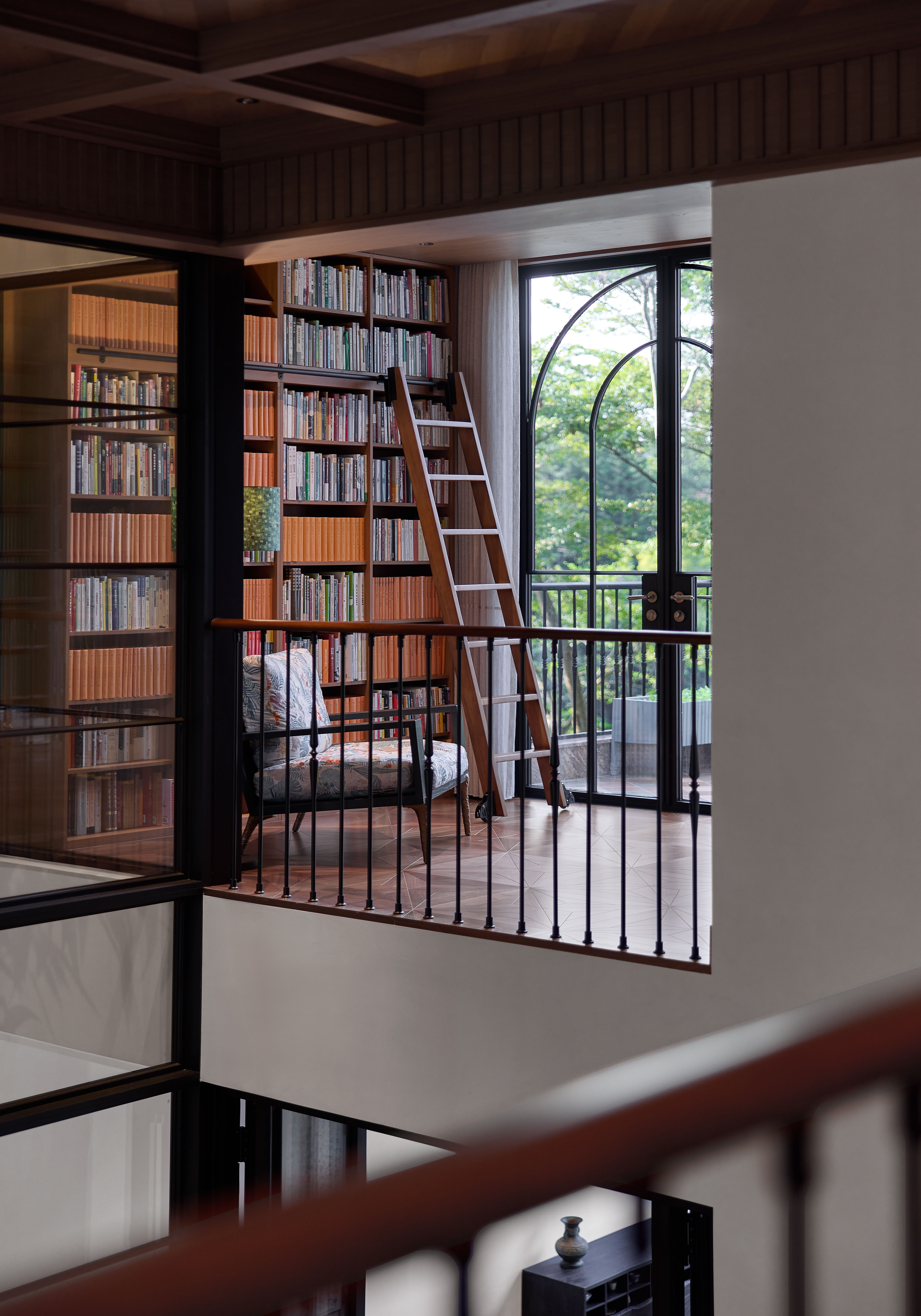 二楼摈弃传统的客厅起居室,转变为一个舒适的读书区和家庭互动区。黄先生和家人有一个很好的习惯就是,看书大家会聚在一起看,不可以把书拿进卧室,所以学术氛围的营造在家里也至关重要。 这个空间连接茶室和儿童房,在这个空间里,家人可以共同阅读,相互交流,增进感情,馥郁的木质调,字画、陶瓷、艺术品、成堆的书籍,为家庭创造了一个与世隔绝的宁静环境。
