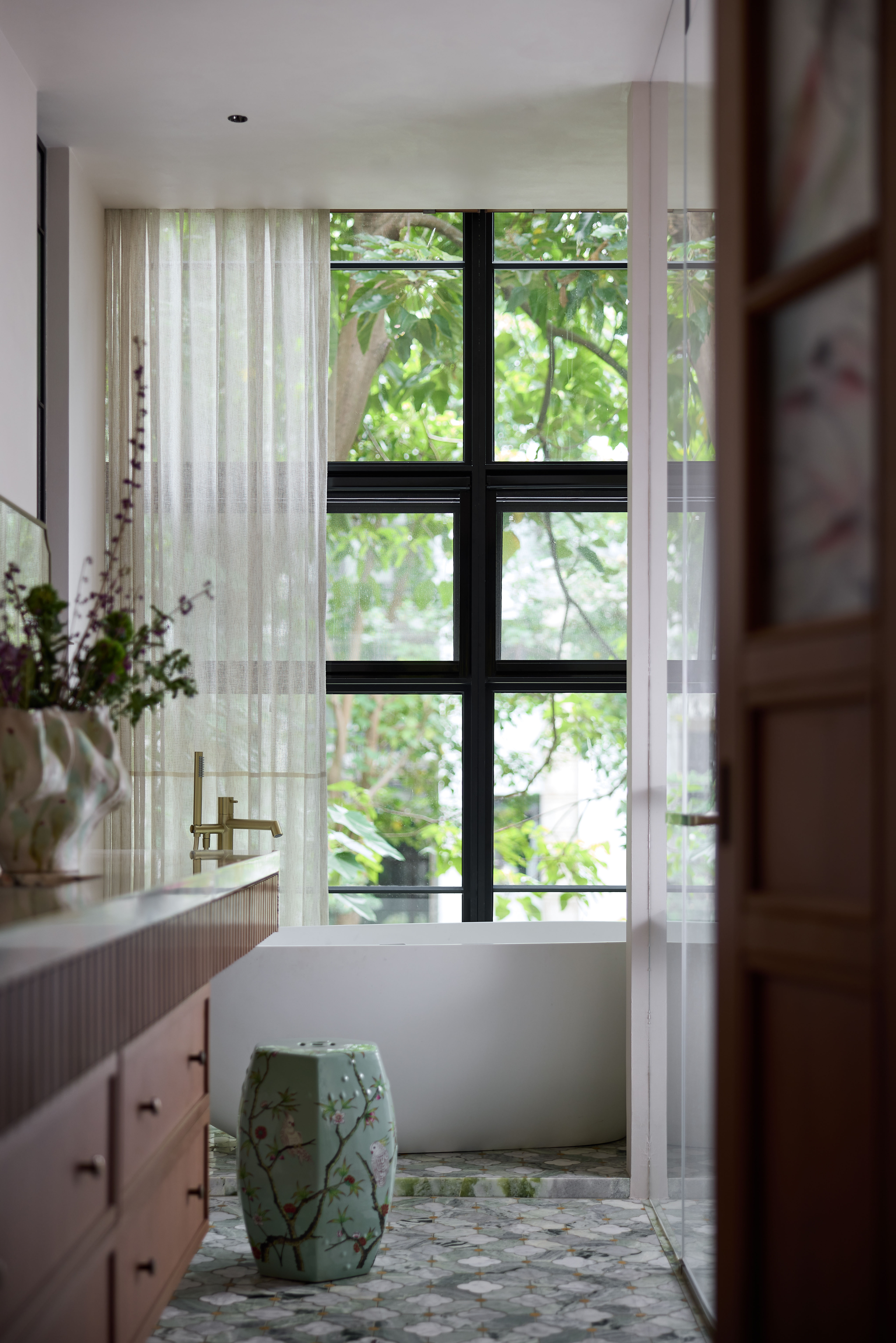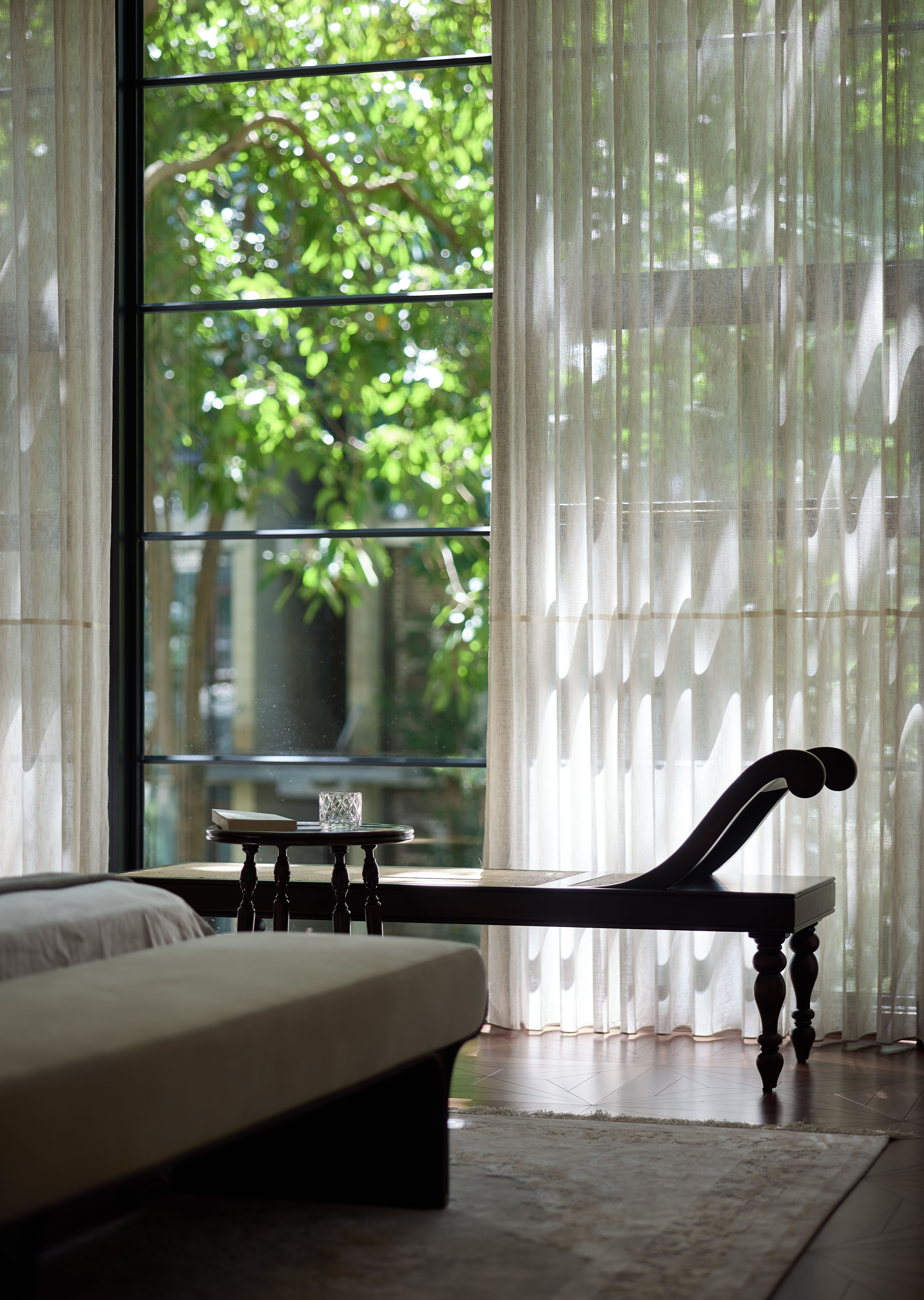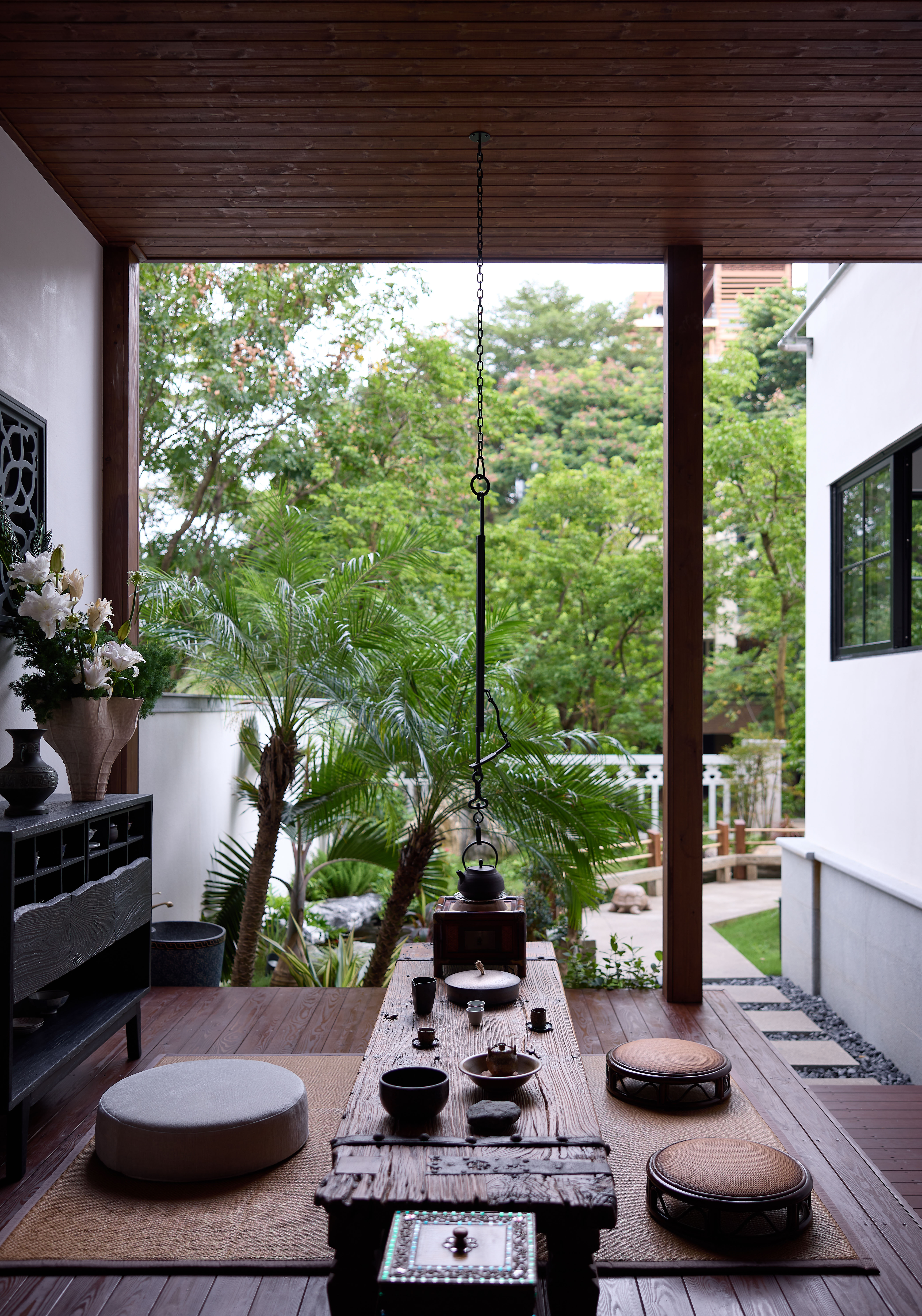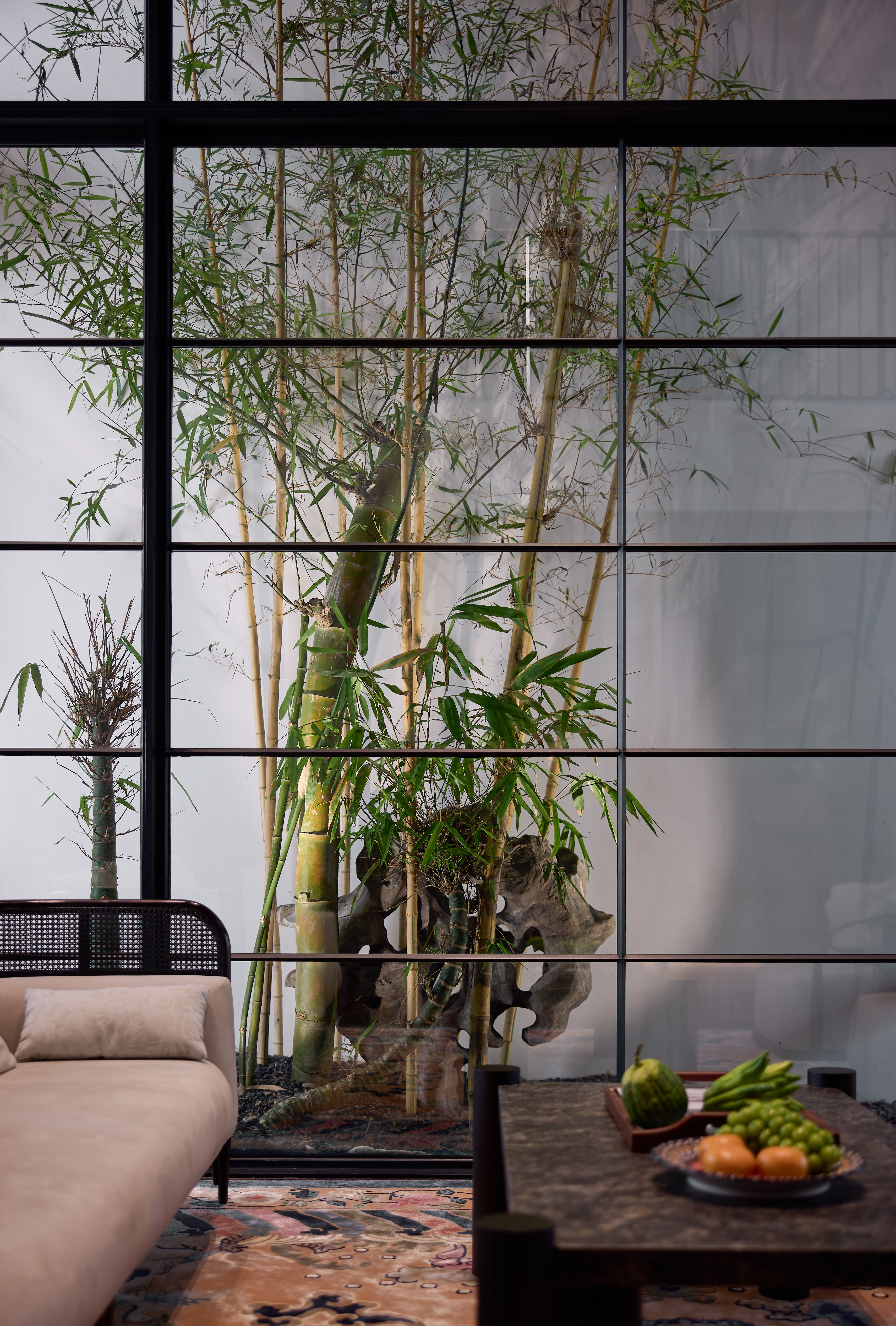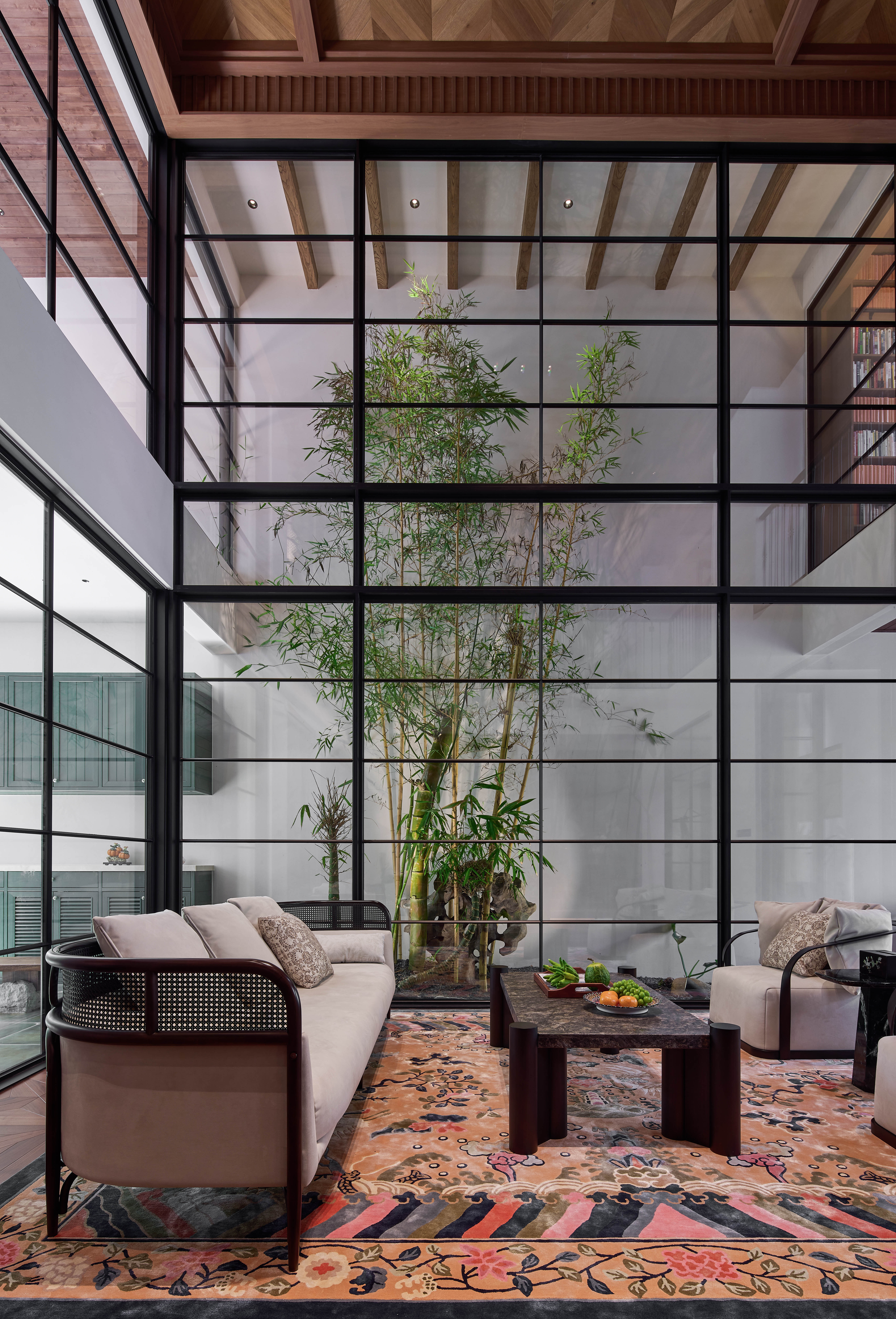 南洋传统木门窗相对繁复,不适合深圳的气候环境,难以维护,所以室内外用的是经典的格子窗钢窗,经久耐用,搭配室内木质元素,依然沉稳质朴。宁可食无肉,不可居无竹。竹子作为一种富有东方文化底蕴的植物,在这里也被设计师巧妙地运用。