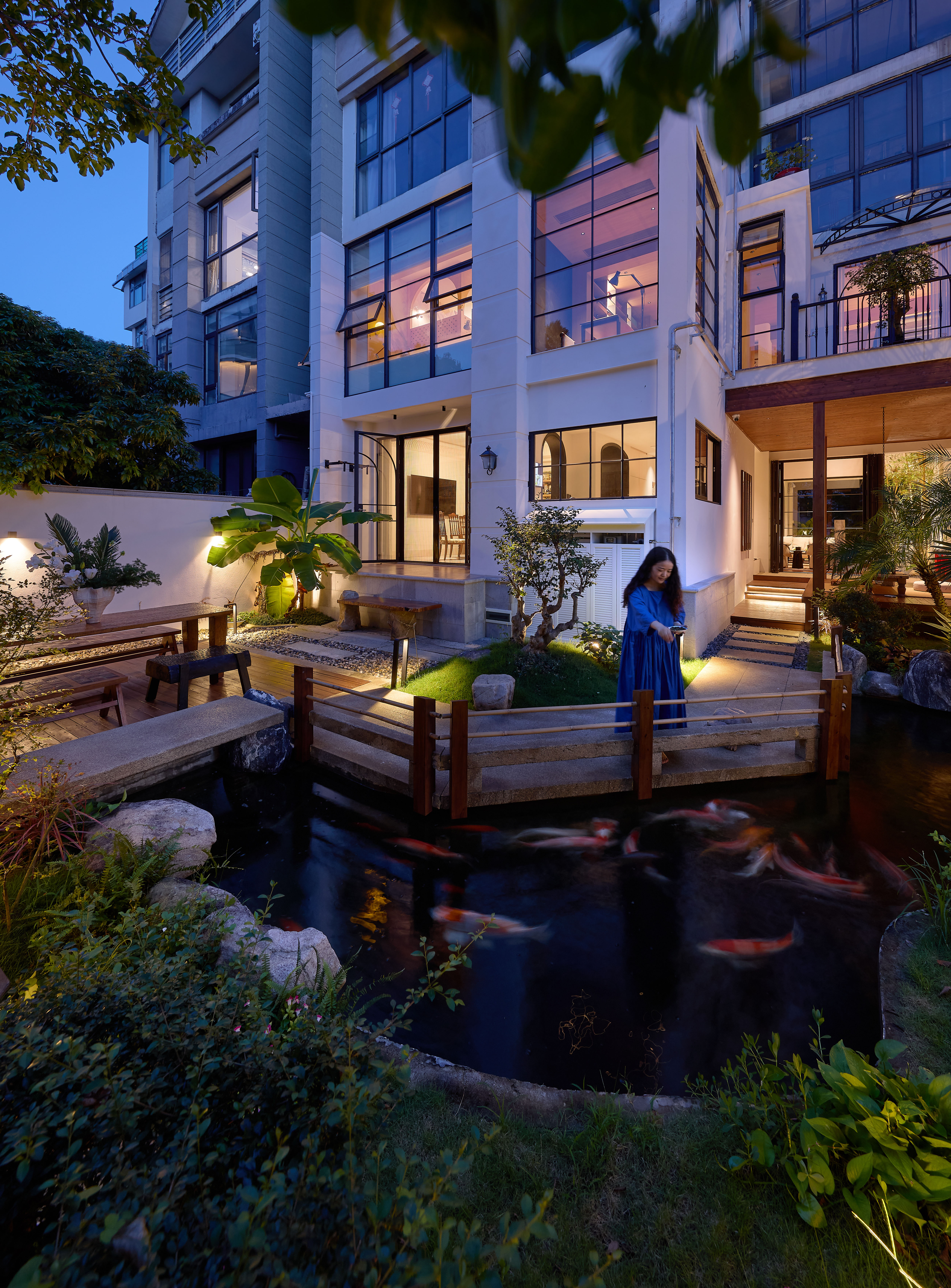 沿着北面通过茶室,或者通过餐厅可以进入后庭院,院内设有休闲区、景观区、户外茶室;曲桥蜿蜒、芭蕉叠翠、点缀太湖石、古建石制构件……勾勒出一幅悠然的生活画卷。 有次屋主发来信息,坐在餐厅里听雨打芭蕉,真的妙极了