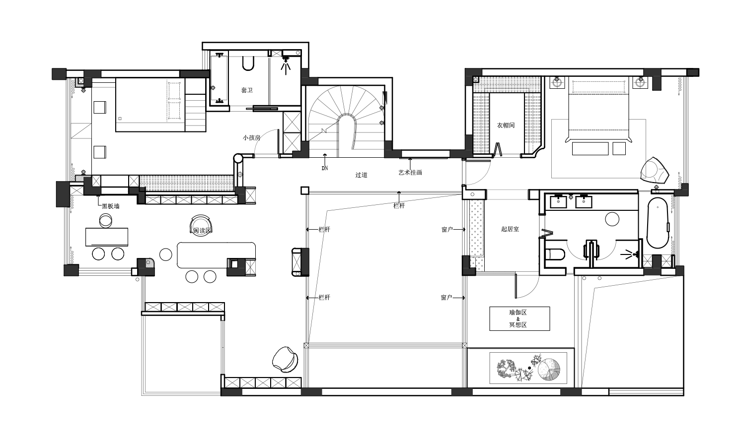 起居室连接瑜伽区和主卫,也是一个过渡区,窗户可以打开,倚在边缘,与一层的客厅形成视觉上的互通,可以和楼下进行互动,有时黄先生在那里接待朋友,有时候孩子会在那里玩耍,阳光从窗户迎过来,生活的重要内容一目了然。