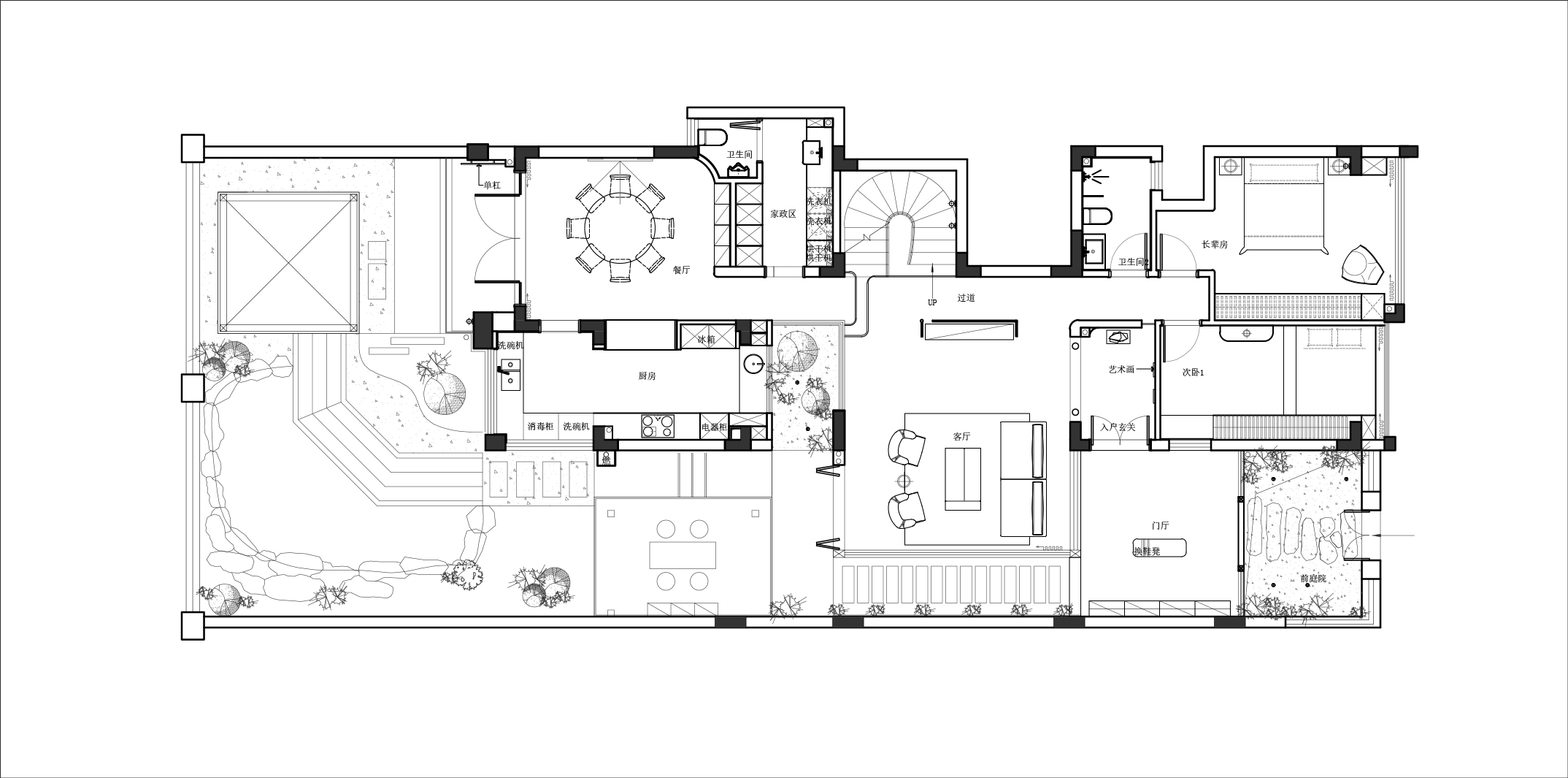 空间布局:摈弃传统的形式,以“空间交互”的形式将这个家铺陈开,大面积的玻璃落地窗元素模糊空间边界,人的视线可以从前院穿越至客厅,客厅至茶室,茶室至餐厅,厨房至客厅,除了私密空间,不管站在这个家里的哪个角度,人的视线都是可以无限延伸的,空间非常通透。