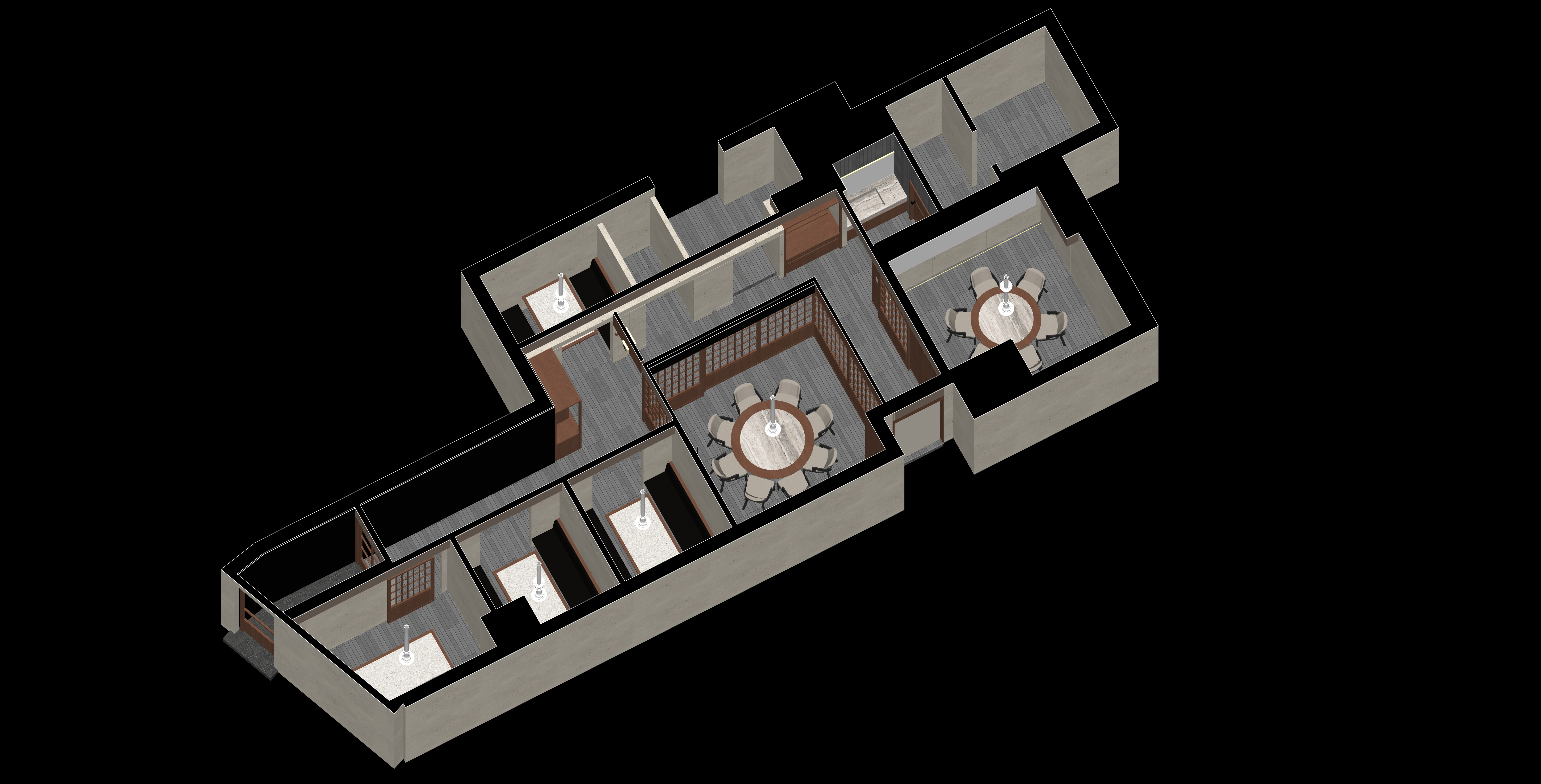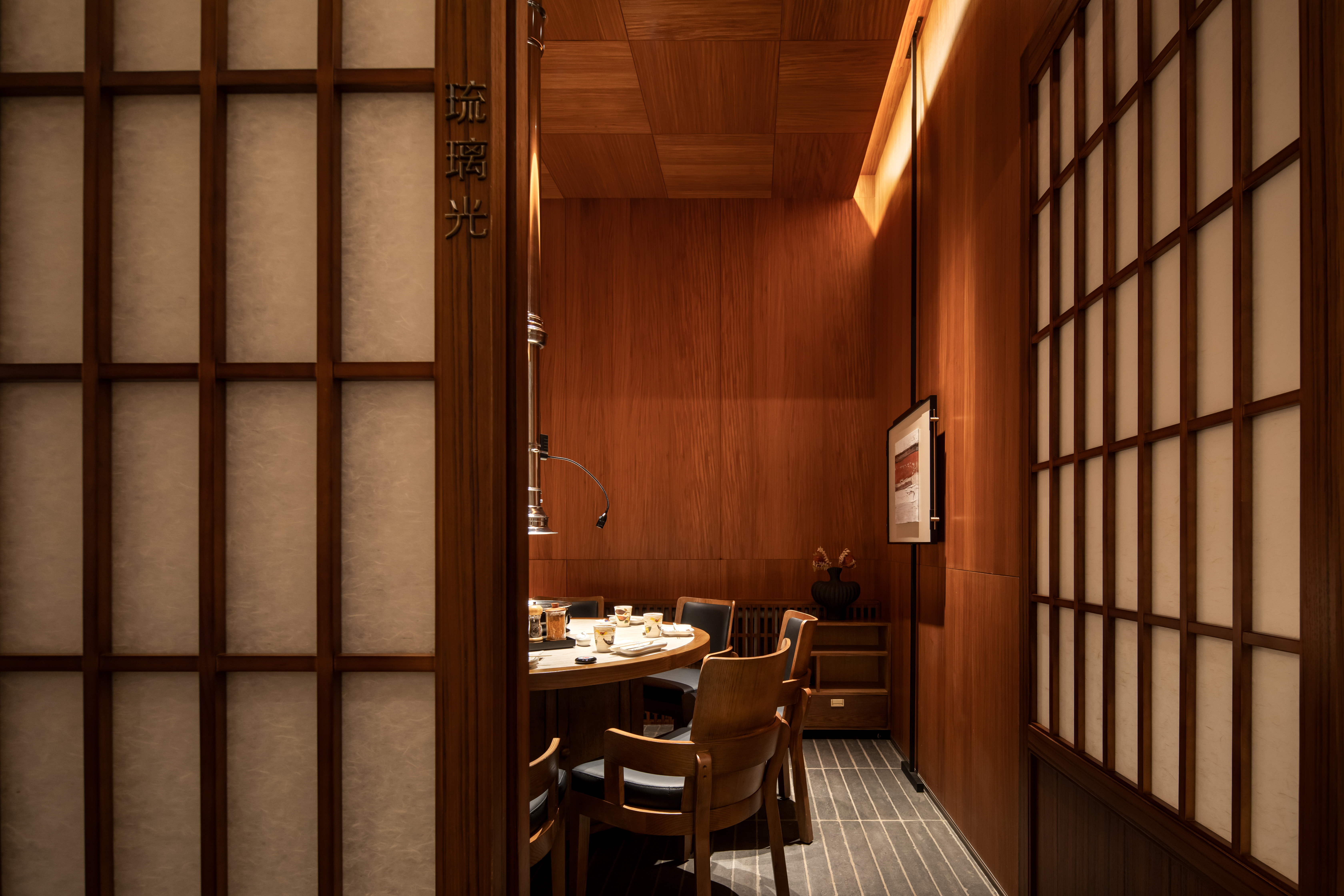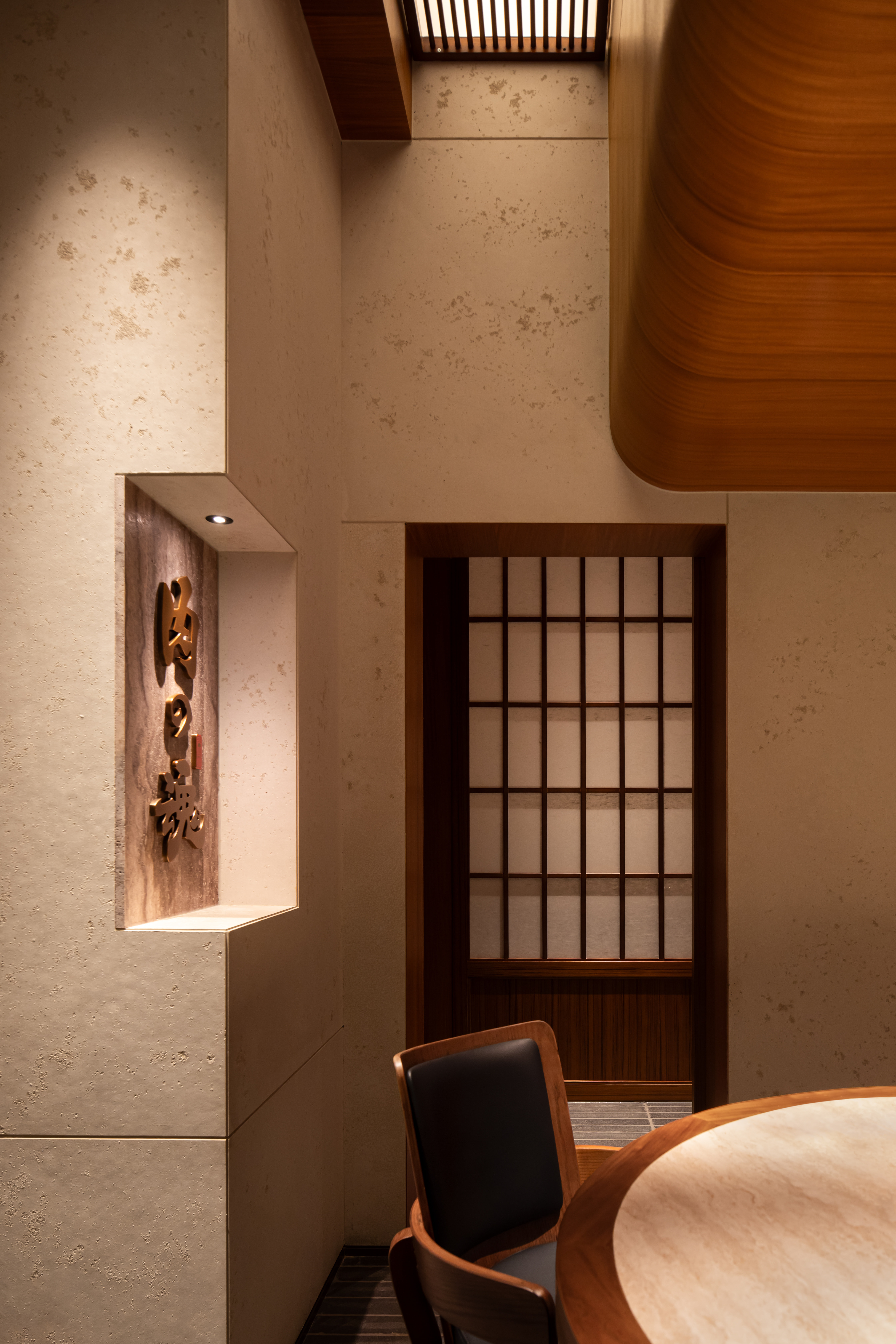 设计选材:在坚守传统精髓的同时,创新之光在其中熠熠生辉,赋予其深邃而丰富的质感。墙面上,虚实交错的墙面与栅栏设计营造出一个既神秘又迷人的半透空间,充满了东方独有的含蓄之美。在这里,阵列的秩序、重复的韵律、对比的张力、抽象的意境、围合的私密以及虚化的朦胧,共同编织出一场直仪式盛宴。这些元素不仅为原本静默的空间增添了层次与深度,更将日本及东方的仪式之道展现得淋漓尽致。当每一位宾客落座其间,从视觉的表层触及心灵的深处,无不感受到一种被艺术化的生活,让人沉醉于这份独特的东方韵味之中。