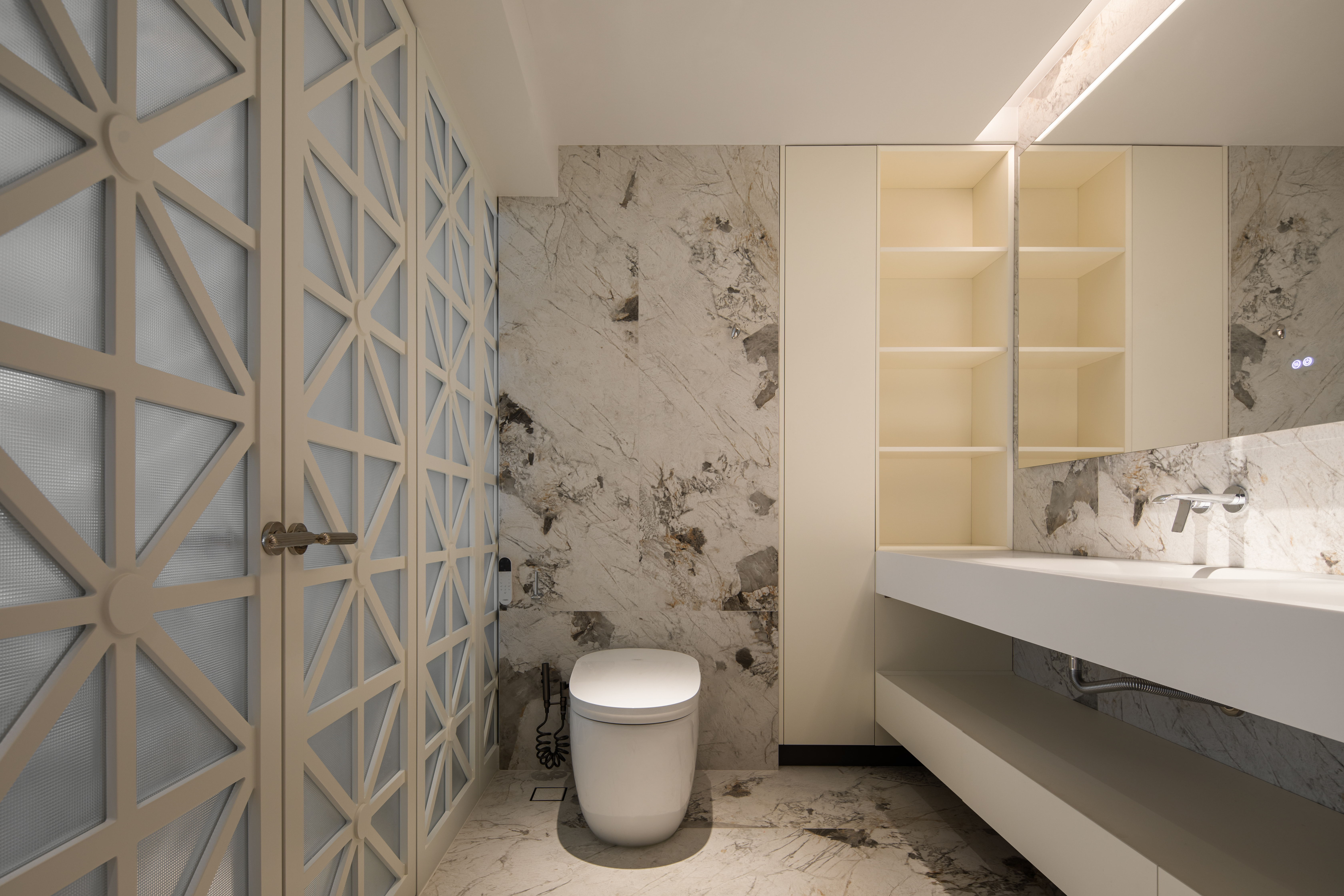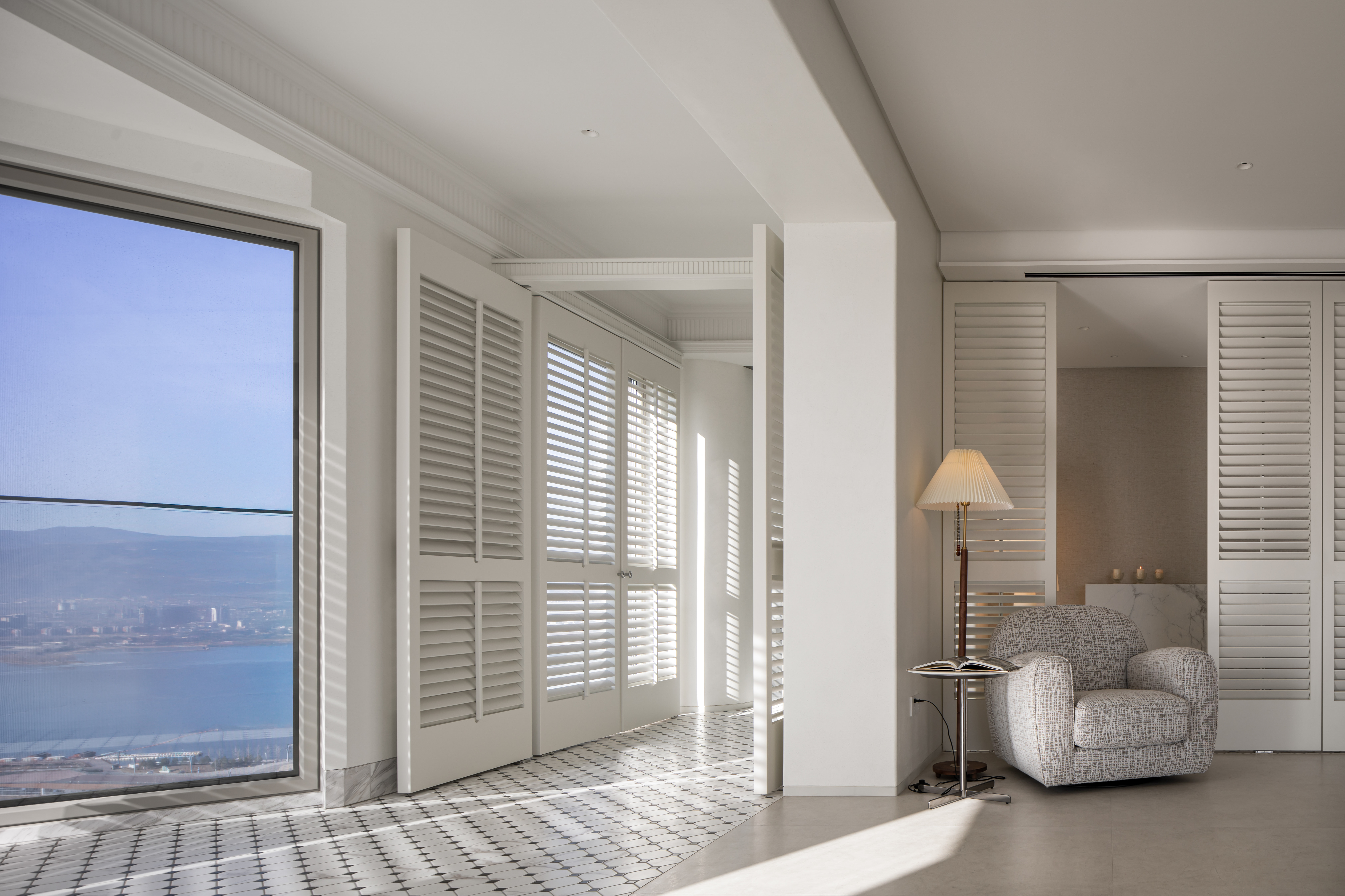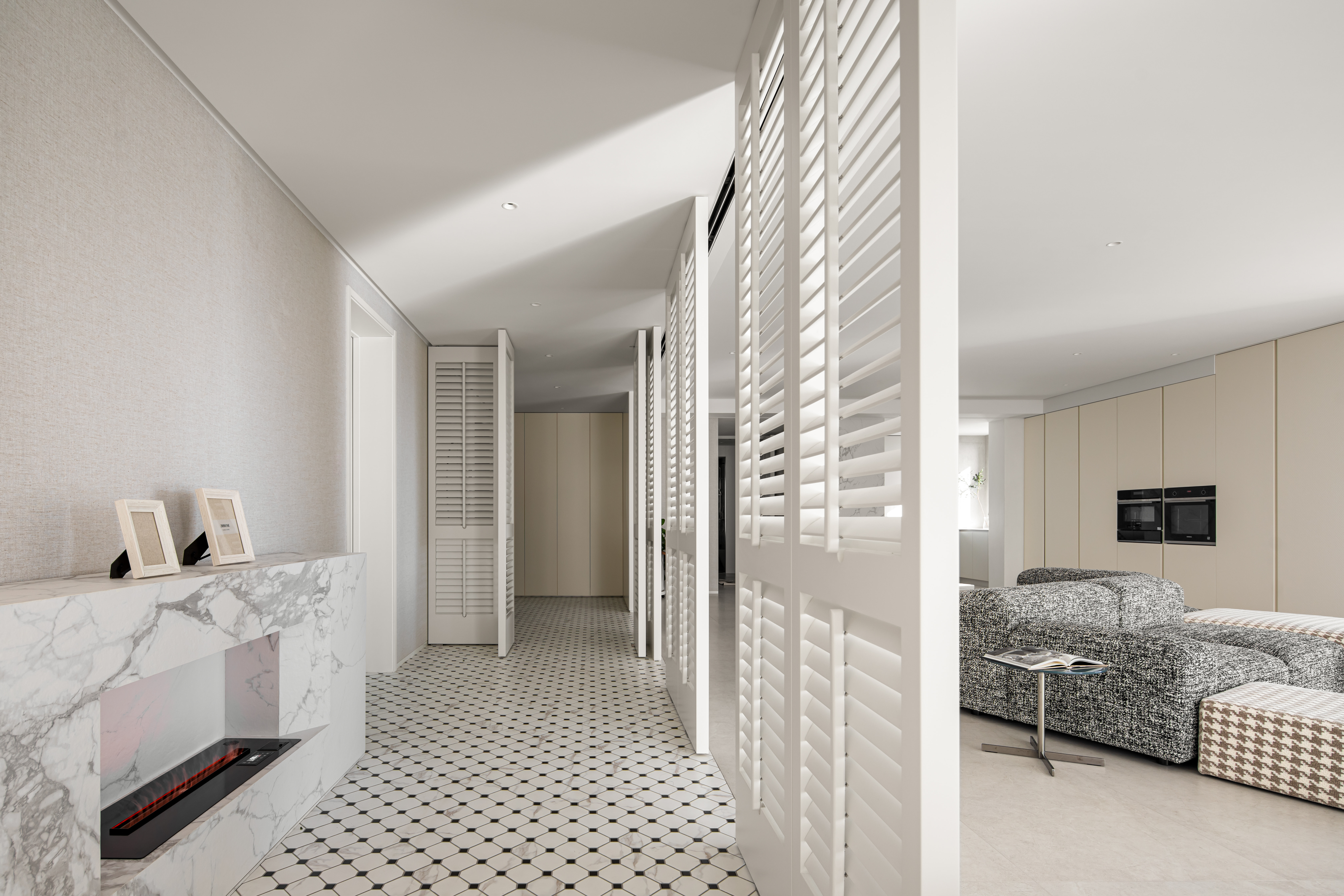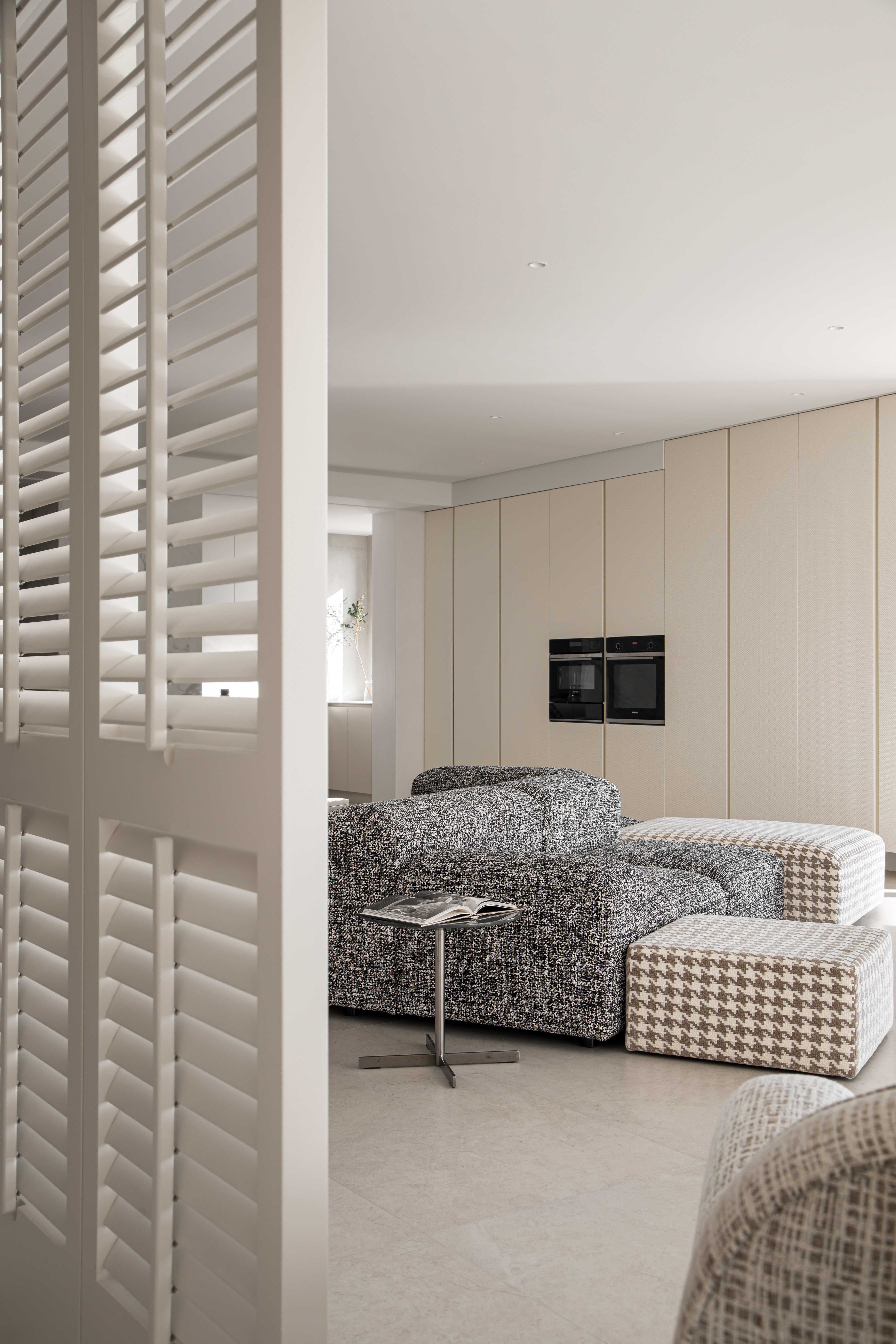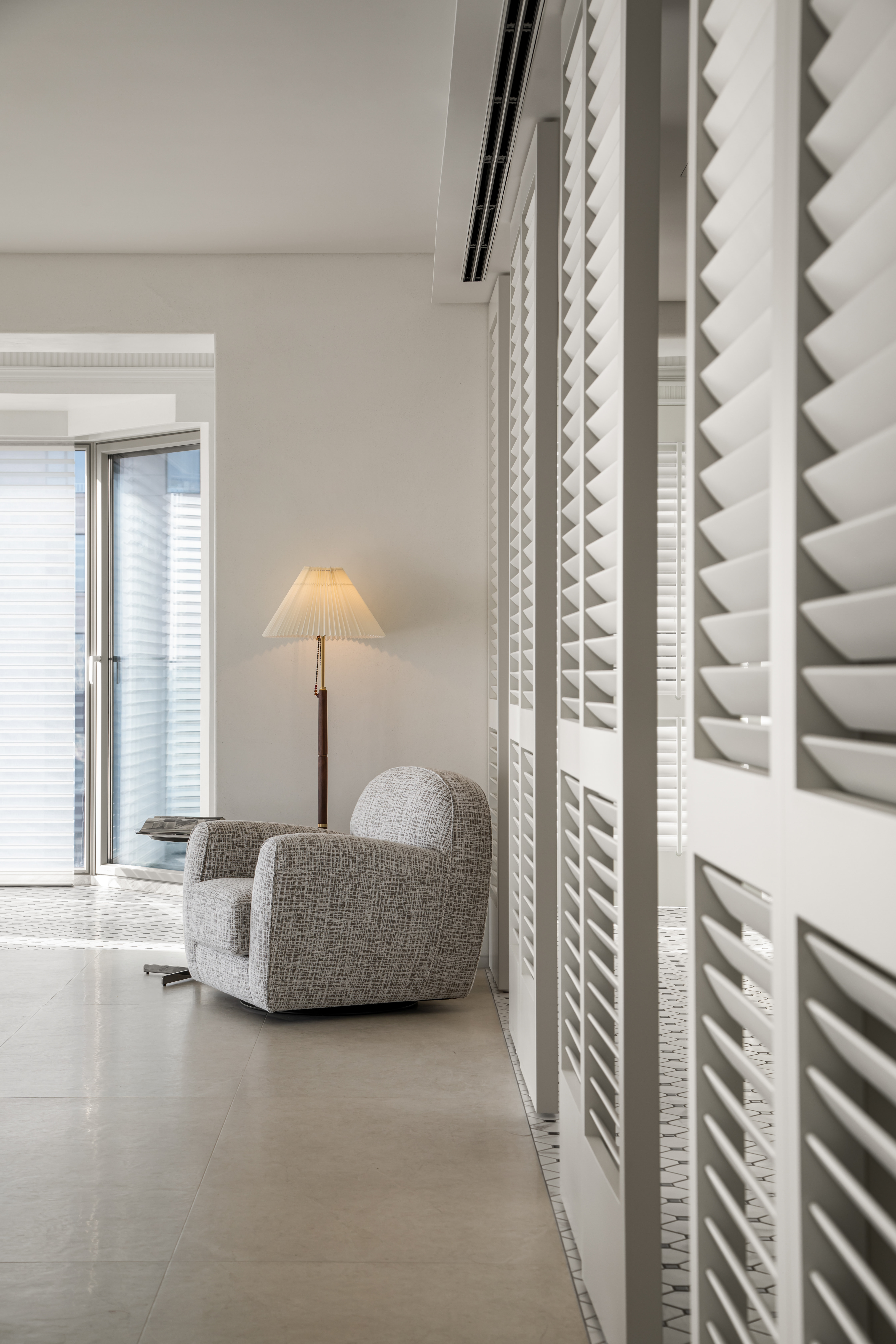 空间意境:用百叶作为玄关与客厅的隔断,空间区域在门扇开合之间自由转换,空间属性随性切换,整体格局井然有序。玄关处的百叶引入光线,若隐若现中即起到隔断作用,又彰显简洁高级的秩序美。该项目的设计虽然是极简主义,但从不给人冷漠的感觉。相反,设计师通过精心的工艺和对细节的关注,营造出一种潜在的奢华。空间中使用高品质的材料与简单的线条结构搭配,精简到保留最基本的元素,创造出平静而正解的空间。