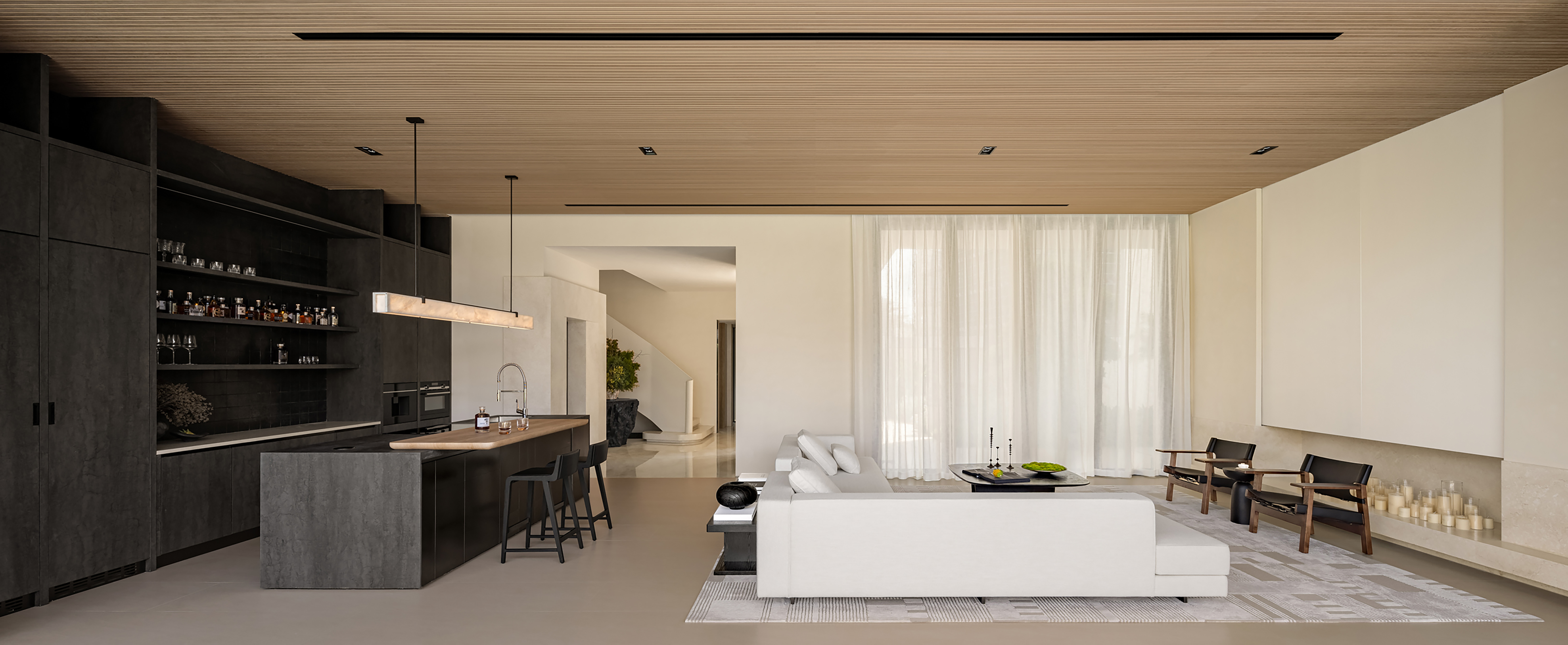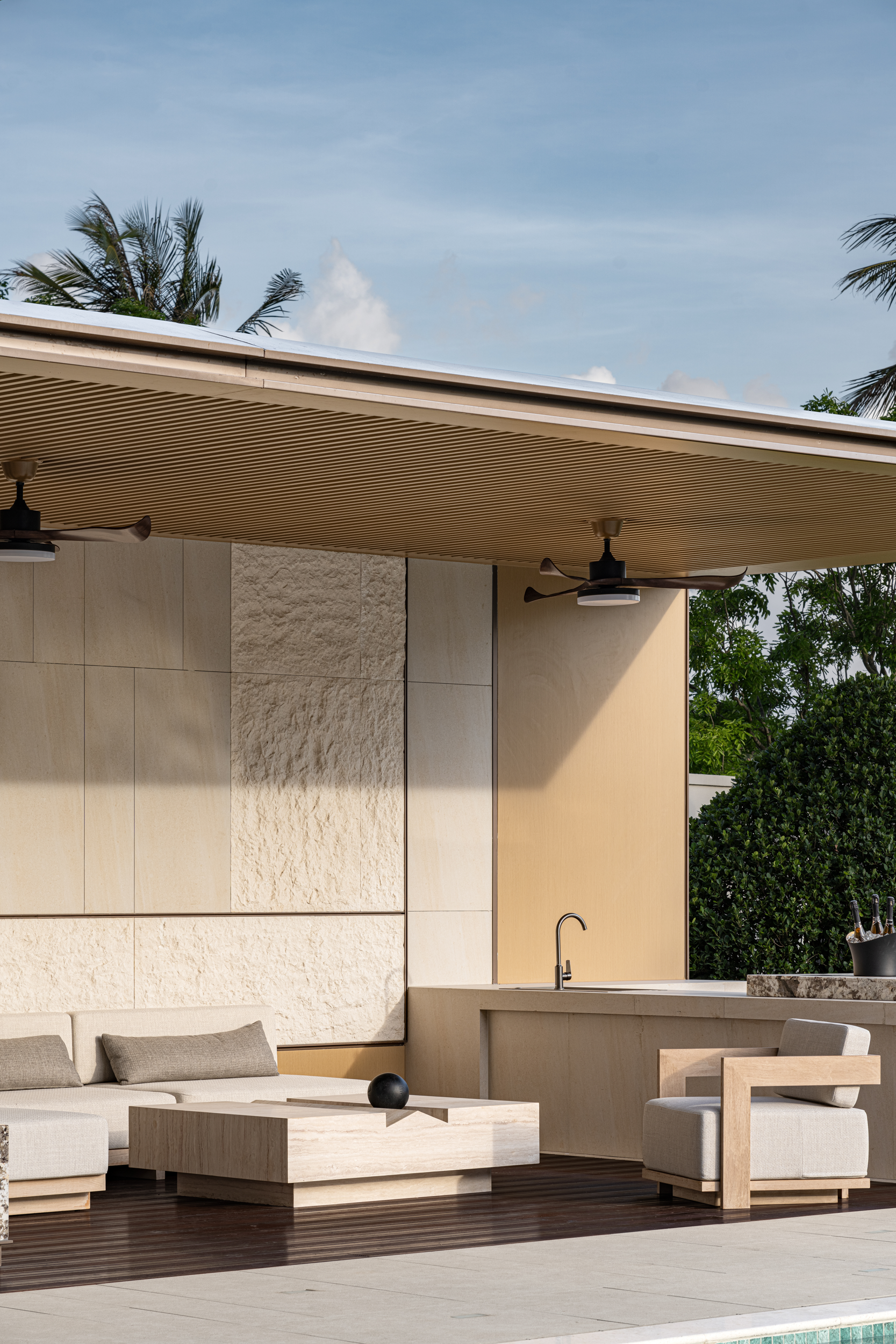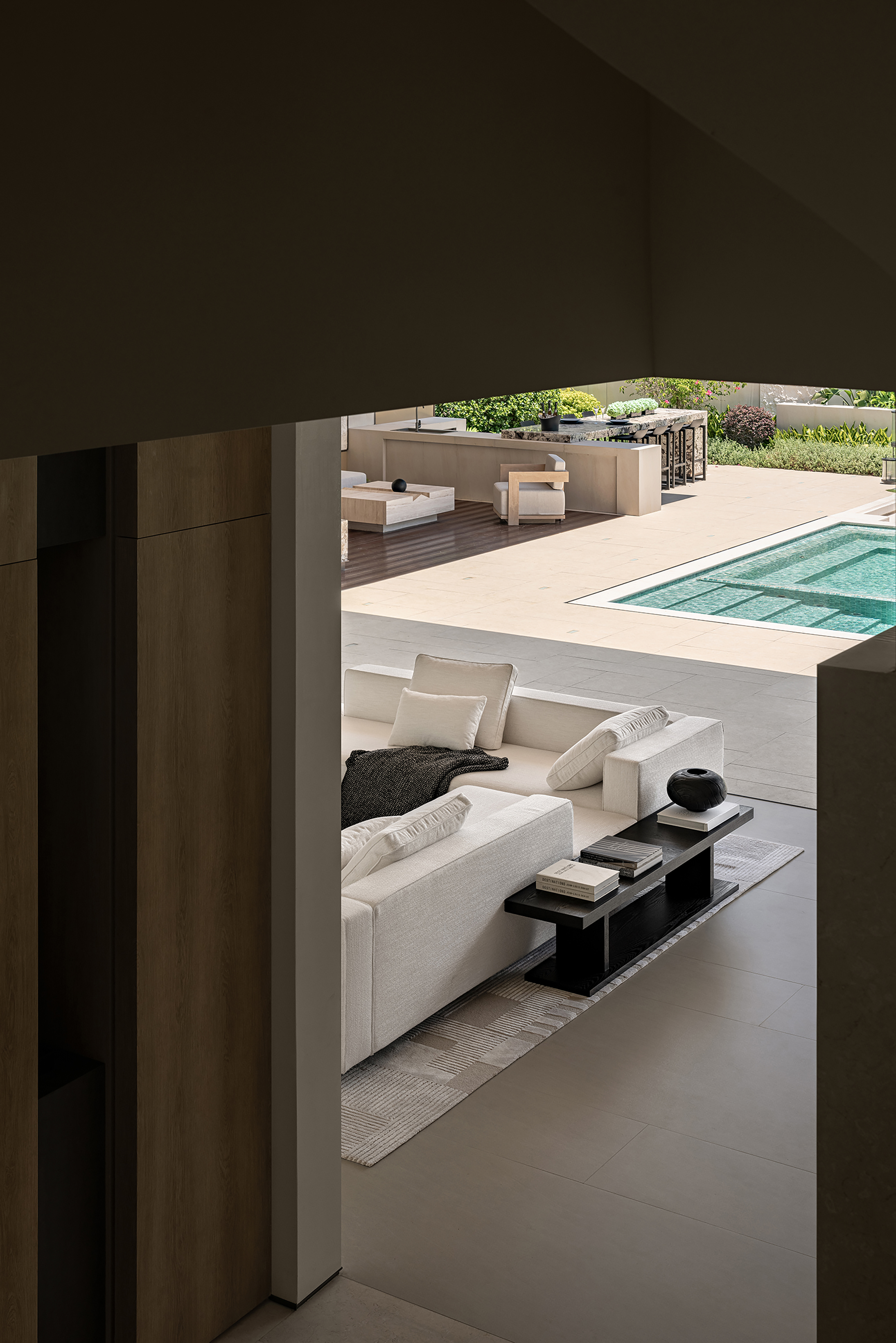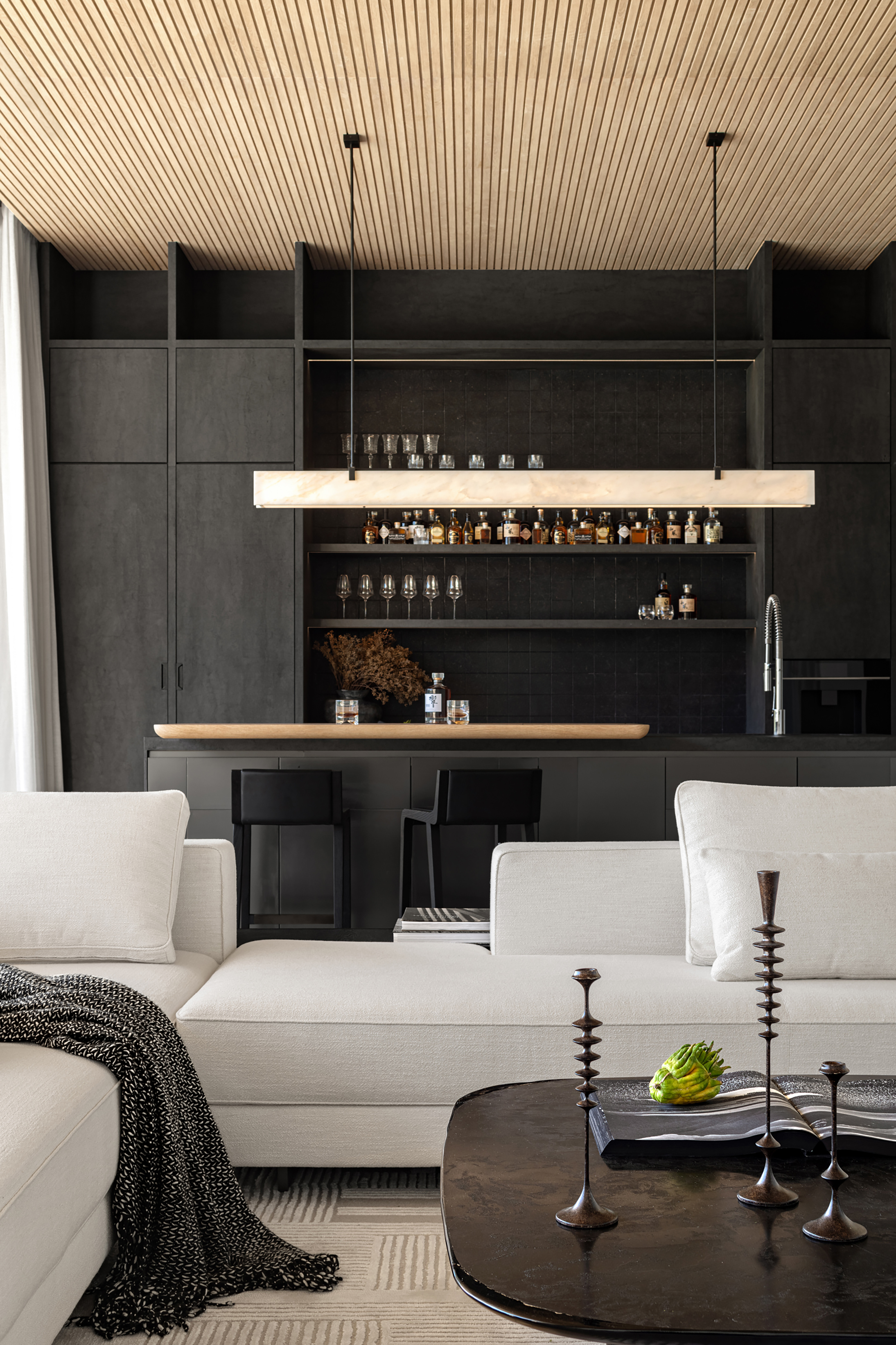 空间意境:室内无界延伸到户外休闲场域,碧海蓝天交织成画,原木天花的深浅层次,为场景注入更丰富的韵律感,温润色泽被巧妙融入其中,营造出自然休闲风情的度假奢享之境。一旁的水吧空间,是从休闲节奏中生长而出的诗意角落。在这里,慢品一杯咖啡,轻酌一杯美酒,时光仿佛都变得柔软而悠长。