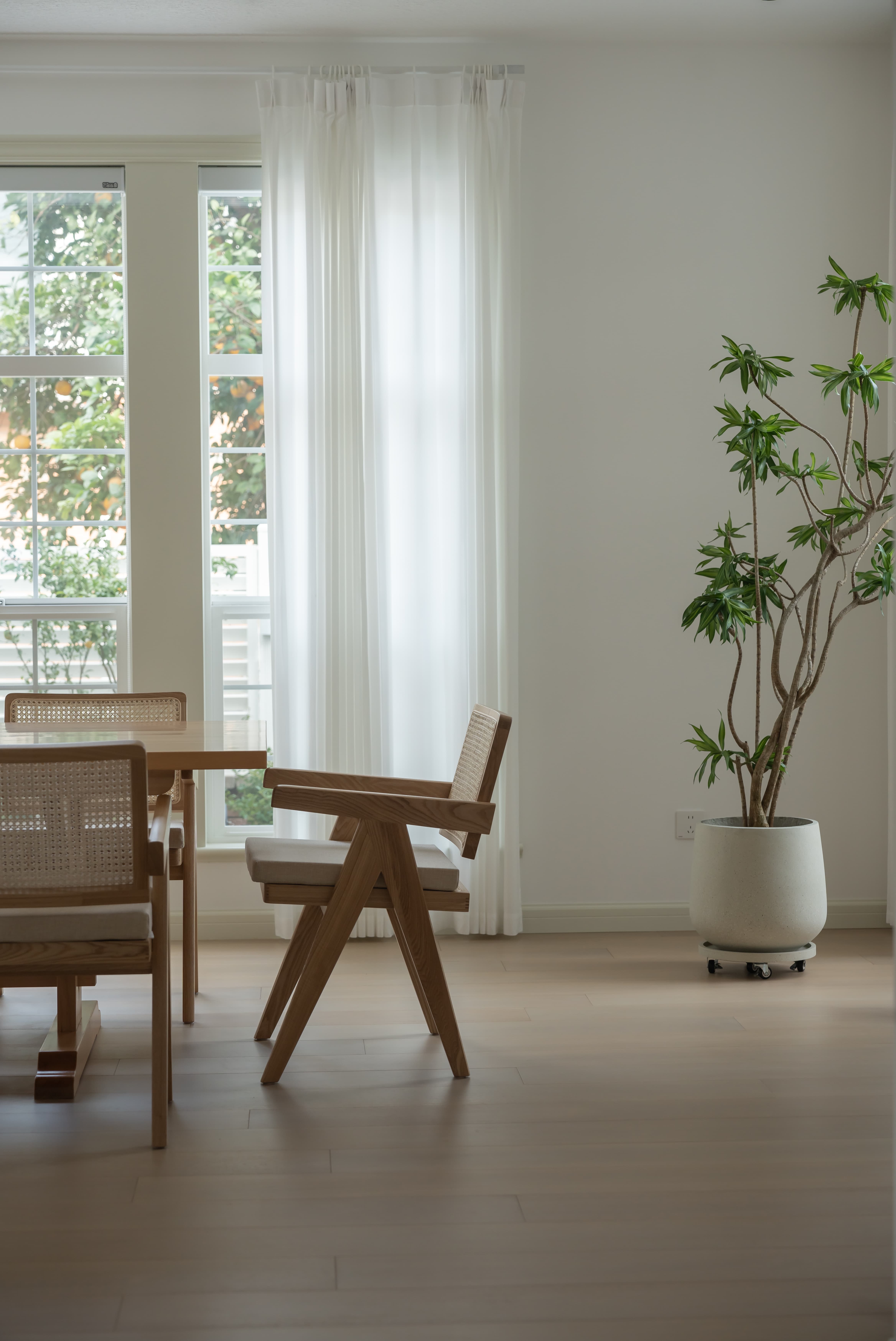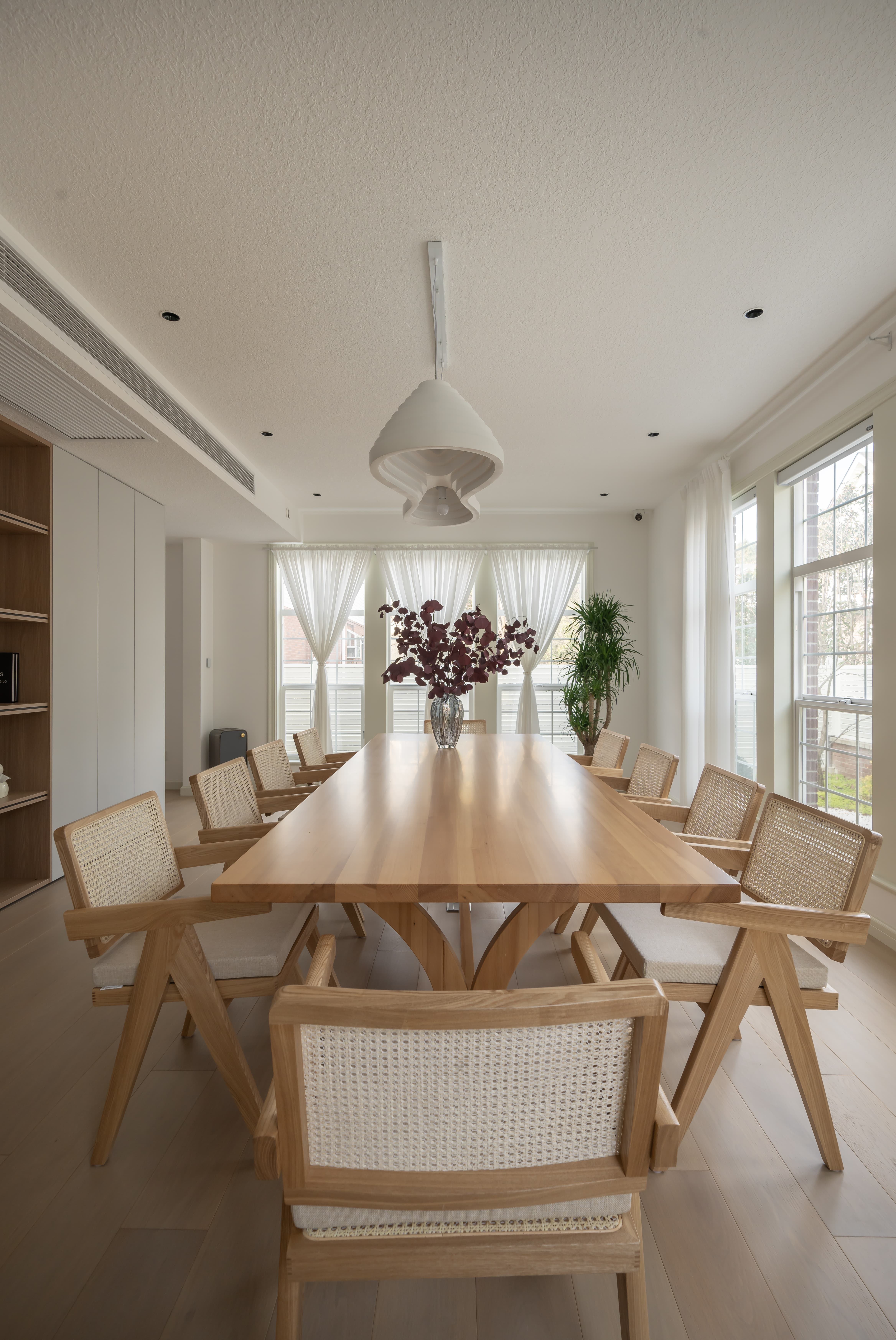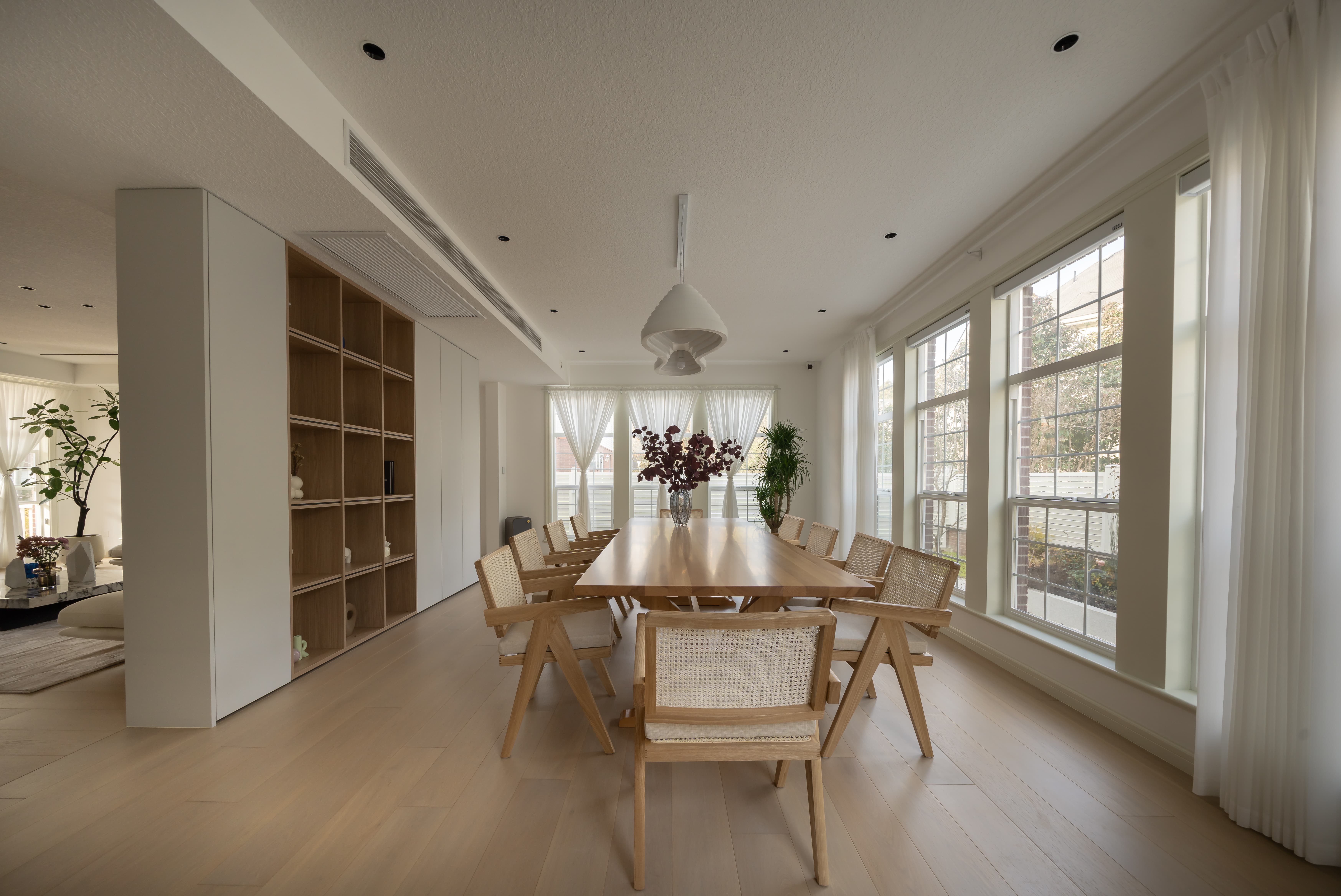 一层几乎都是留给家人的公共活动区域,白色的墙面为底,不同材质的家具穿插其中,空间氛围质朴又宁静,符合一家三代人的审美需求。为了提升采光度,窗户都开得比较大,在墙体的遮蔽下,形成一个有趣的光影流动空间。