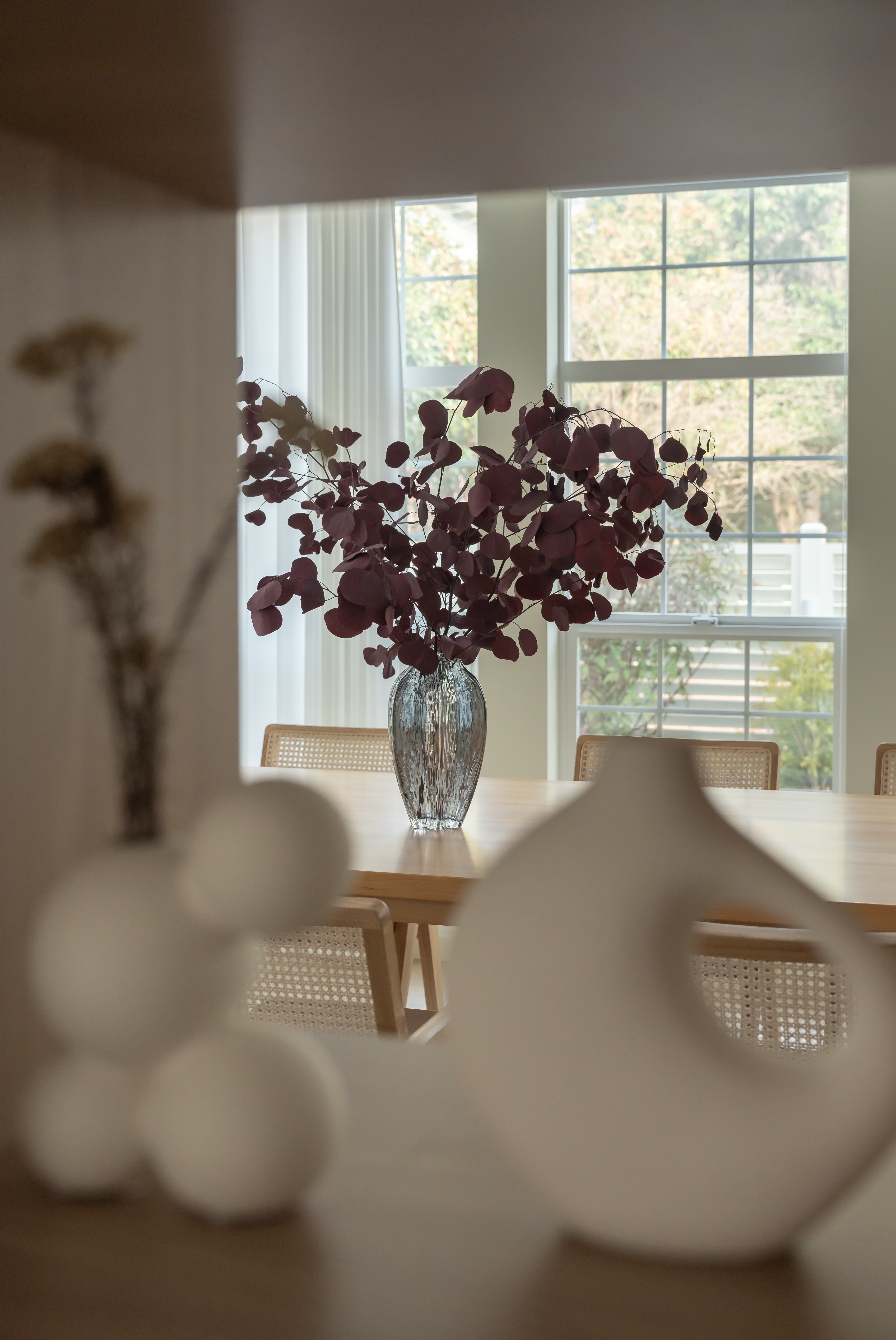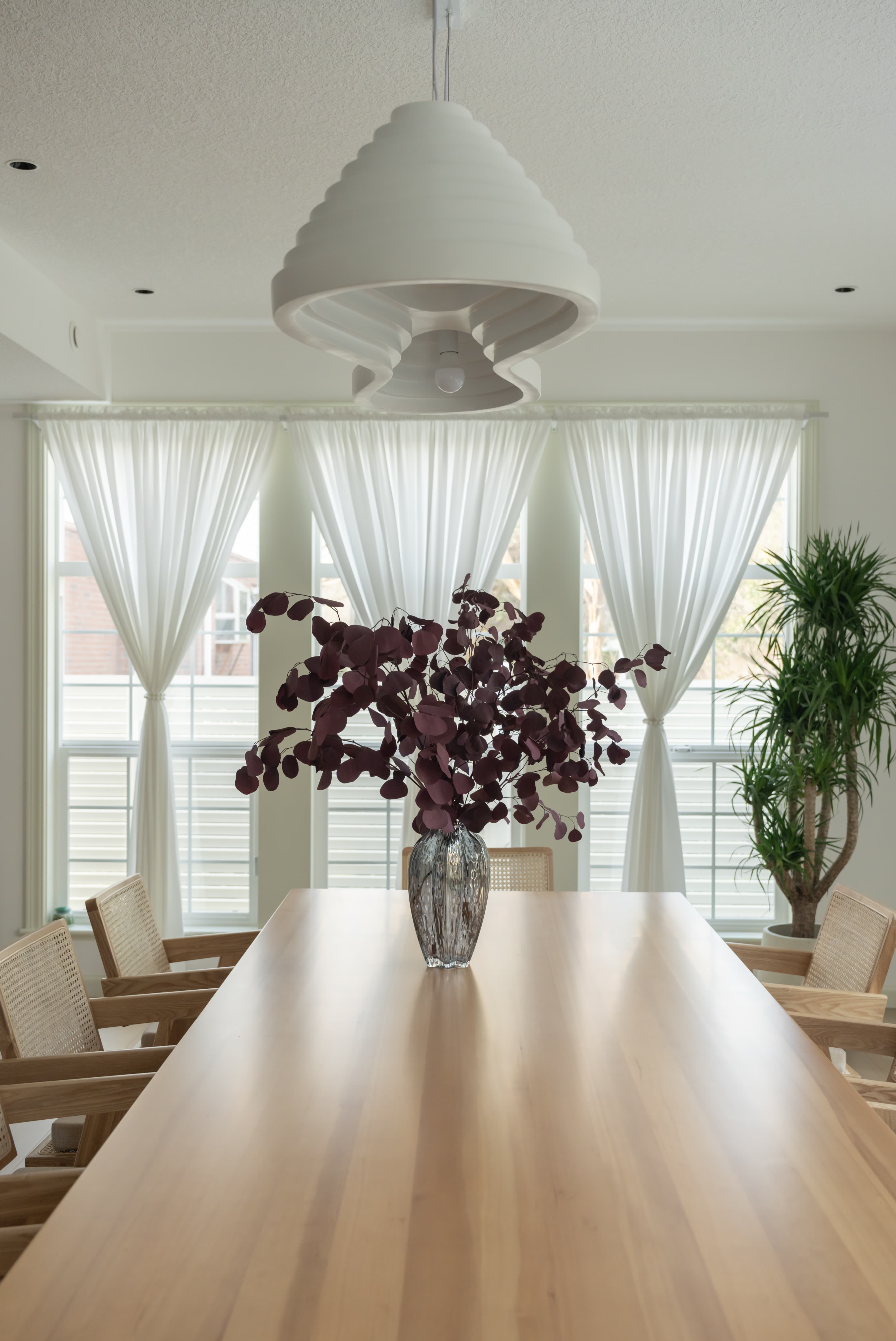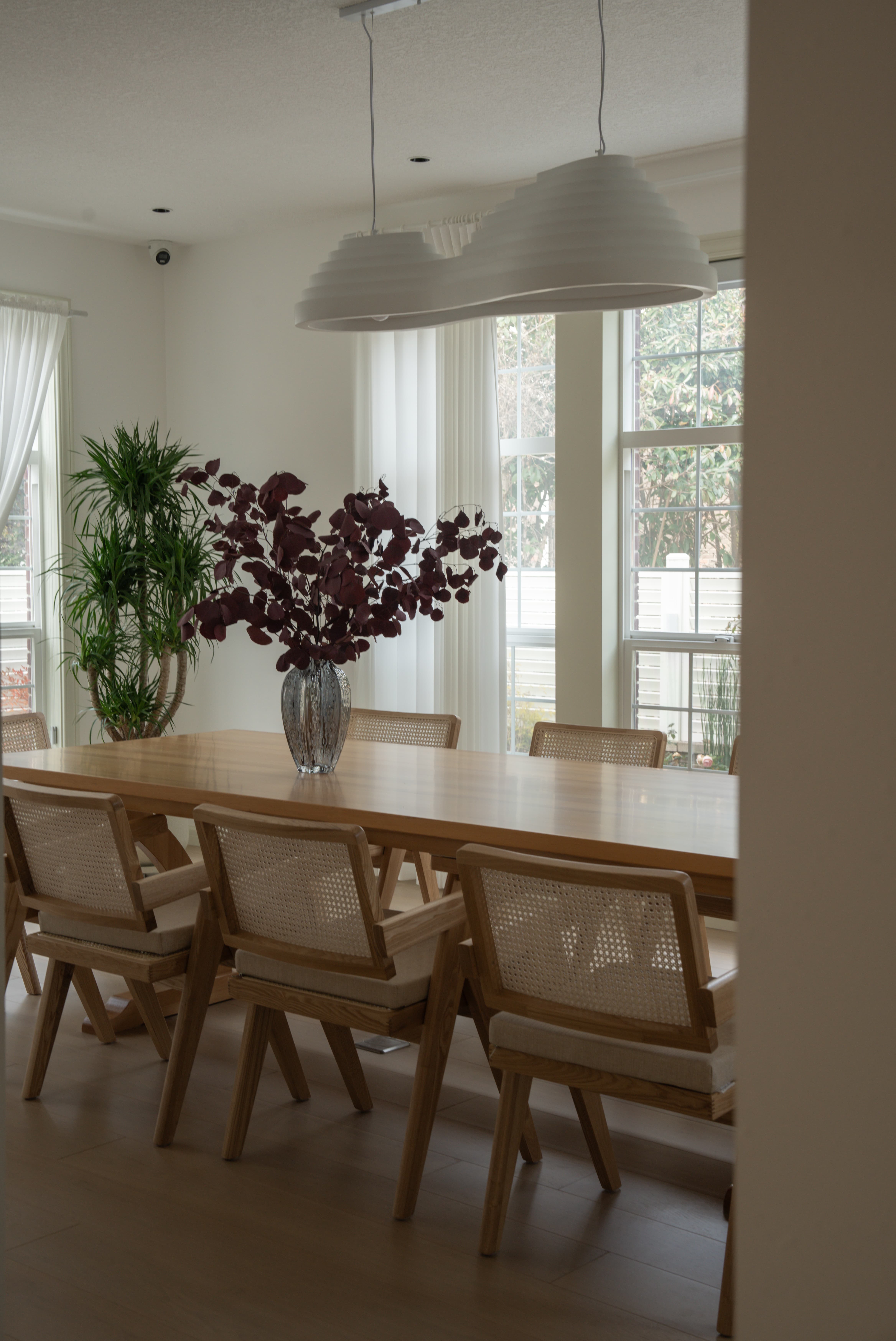 一层几乎都是留给家人的公共活动区域,白色的墙面为底,不同材质的家具穿插其中,空间氛围质朴又宁静,符合一家三代人的审美需求。为了提升采光度,窗户都开得比较大,在墙体的遮蔽下,形成一个有趣的光影流动空间。