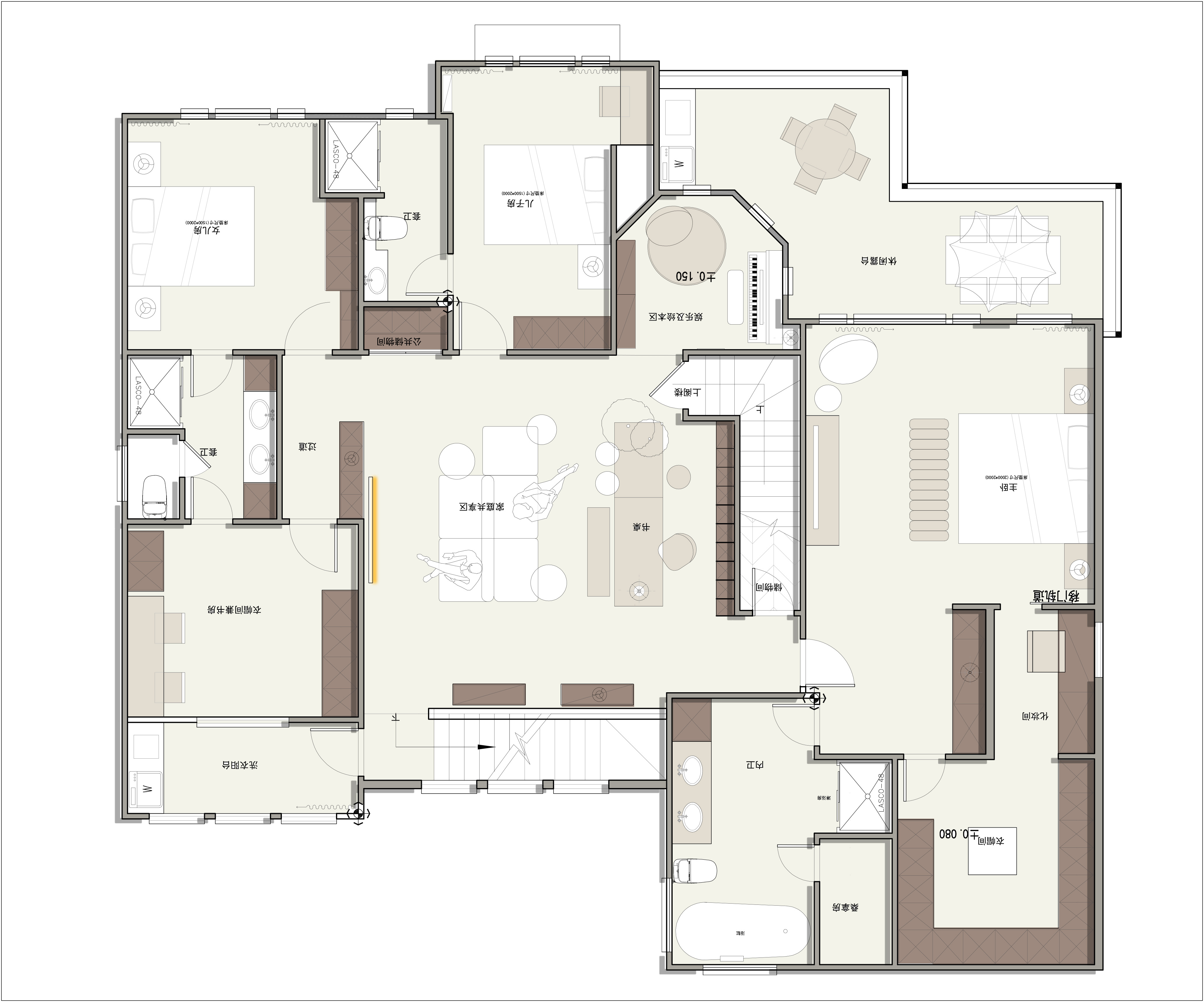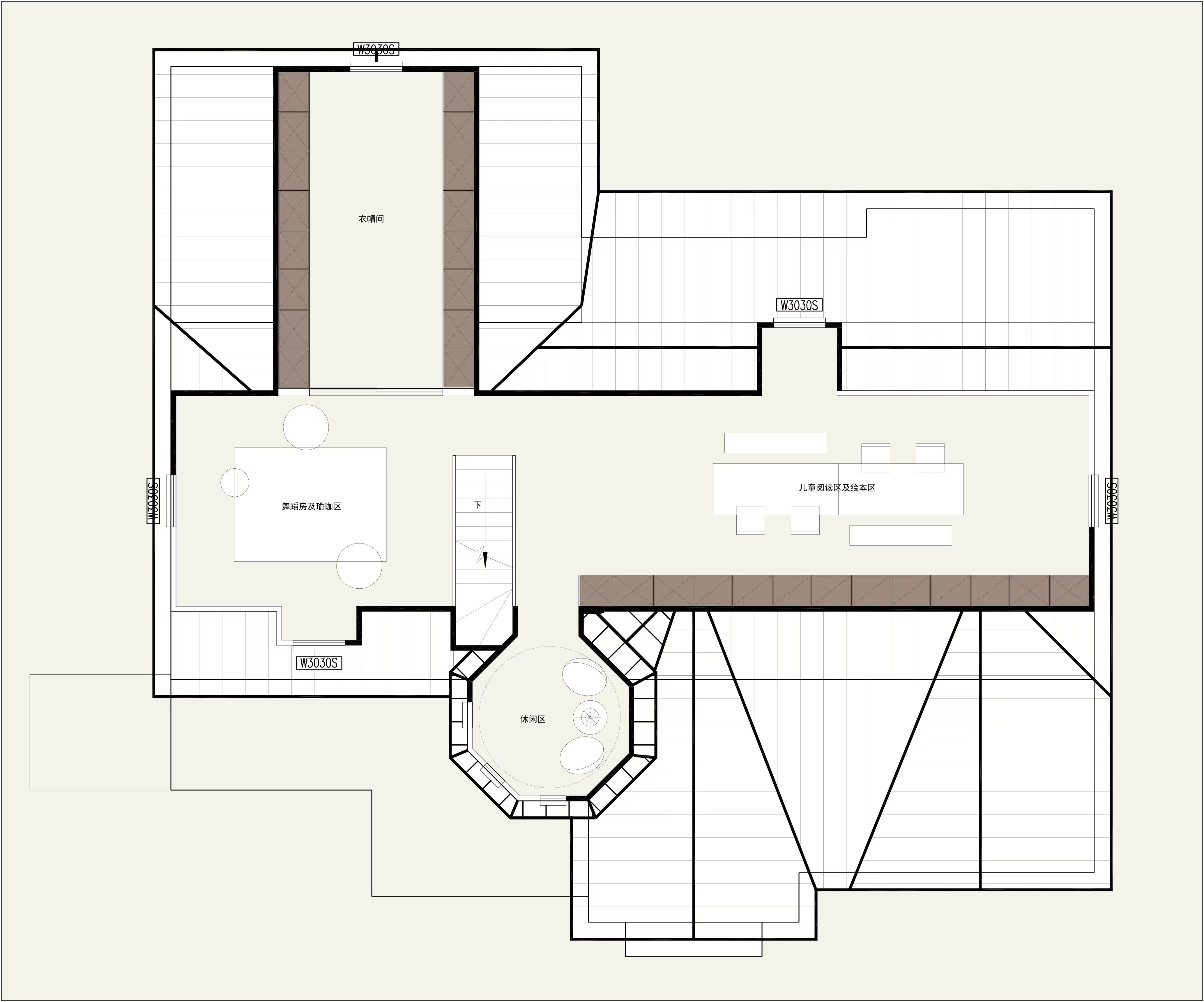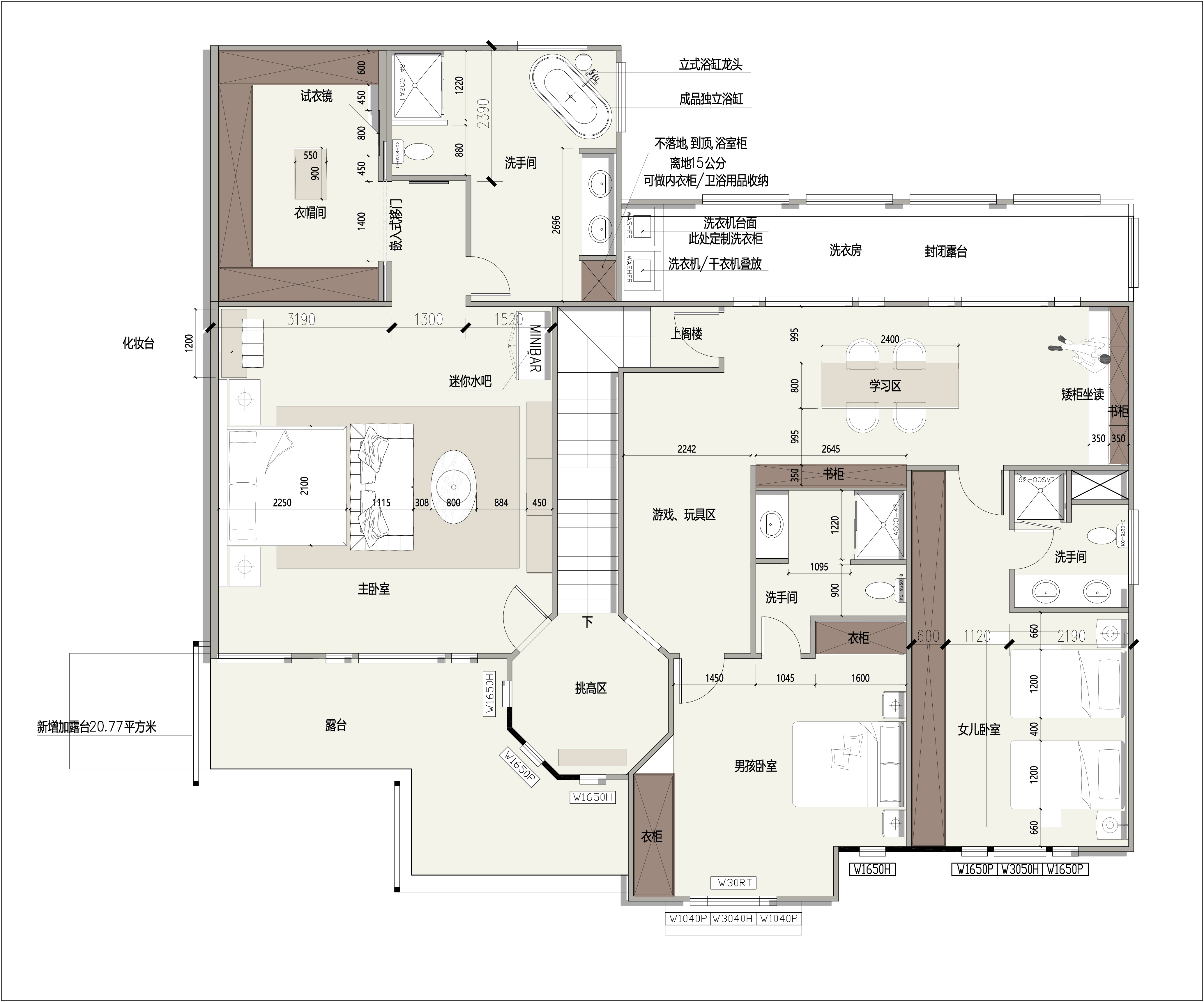 6.考虑到二楼次卧的卫生间位于房子中央且整个二楼缺乏家人互动空间,将次卧的卫生间拆除并对次卧进行了空间重构,既实现了次卧套间的功能,也打造出了一个包含亲子休闲、娱乐以及阅读的空间。 7.考虑到原二楼主卧的动线比较长,且与两个儿童房之间被切割,设计后调整了主卧的门洞方向,打造出了一个包含衣帽间、化妆间、卫生间的主卧套间。 8.考虑到两个孩子需要独立的学习空间,将原儿童房与走廊打通并进行了空间重构,打造出一个包含卫生间、书房的卧室套间。