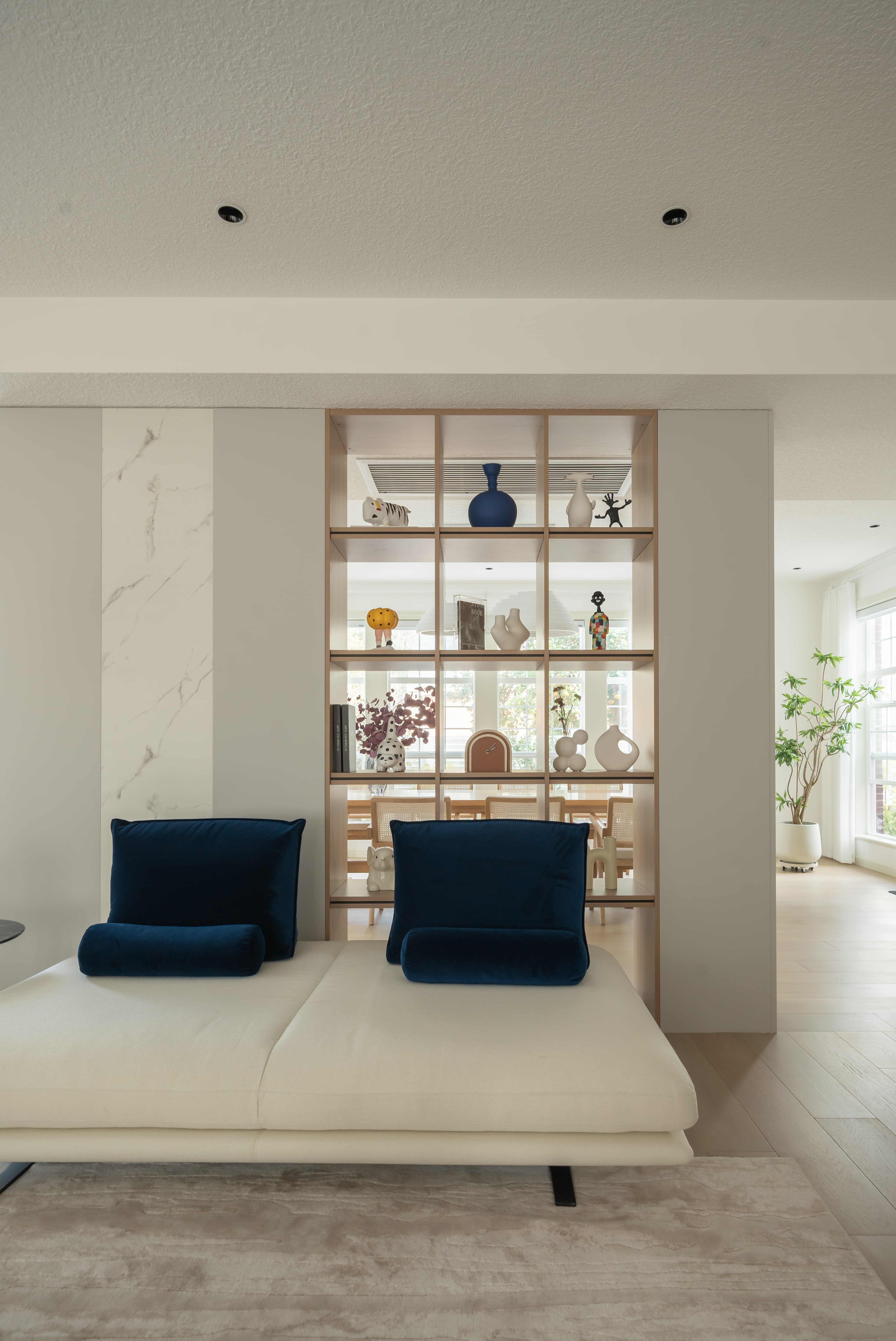 入户的次净衣柜选用了彩绘的几何图形,一方面巧妙遮挡住入户的视线。同时也是这个区域充满仪式感,让归家的人瞬间过渡心情,调整呼吸,漫步而入。穿过玄关去,进入空间便感受到客厅的开阔感觉。