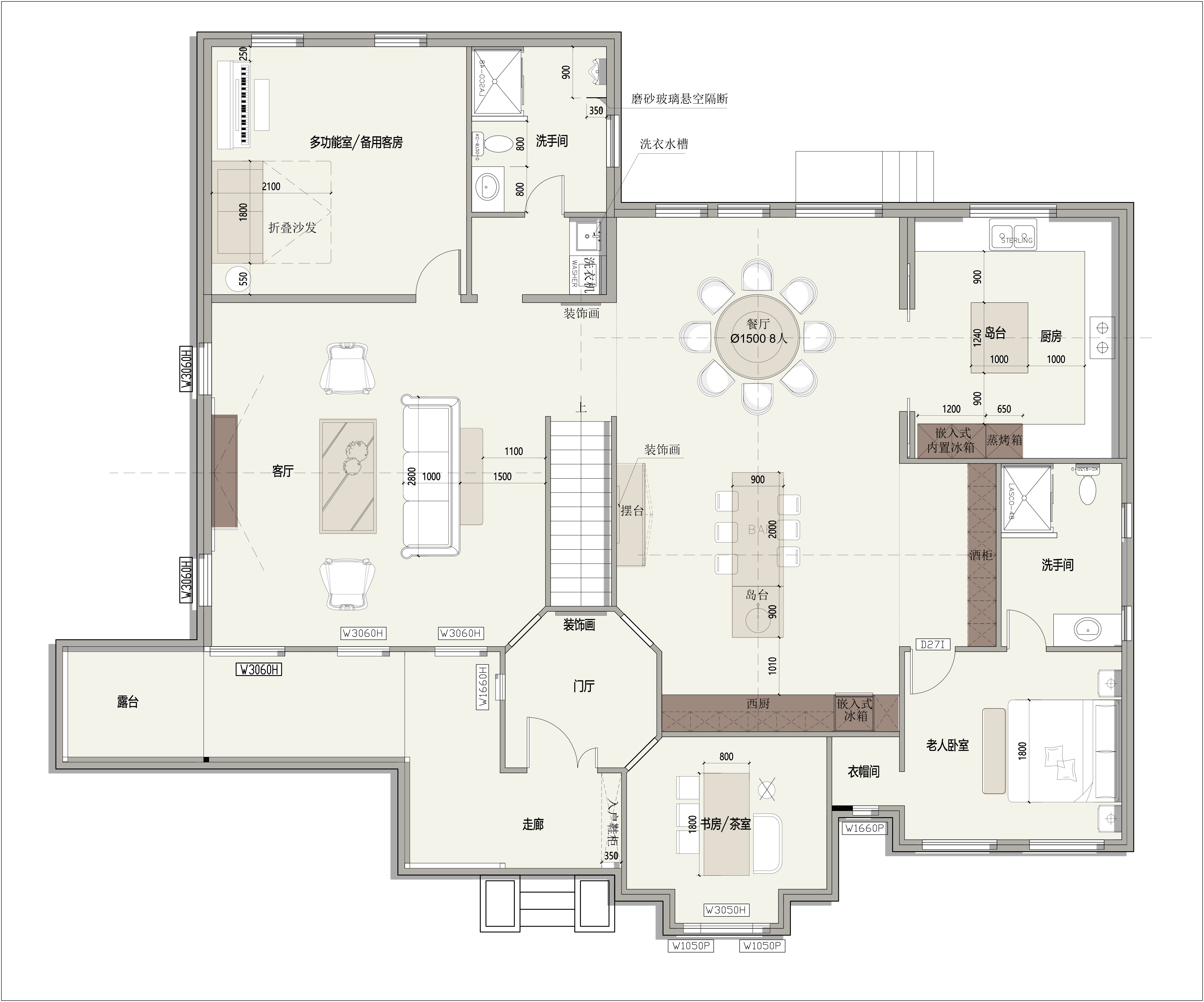装修平面图,考虑到屋主比较注重家人之间的交流与互动,以及各家庭成员之间的私密空间,因此设计师主要围绕这两方面进行规划与设计: 1.考虑到入户的私密性与空间的通畅,调整了楼梯的位置,打造了独立的门厅,入户后动线舒适;2.考虑到家庭成员之前的互动,将一楼客卧套间打造成家人的休闲和学习区; 3.考虑到客厅的采光,每个区域内都改造出一个窗口,将室外自然风光引起室内,以此来衔接自然风光和室内生活。 4.考虑到家人的用餐习惯,餐厨动线以及书房的空间比较小,将书房整体外移并对整个餐厅的空间进行了重构,既实现了屋主的需求,也大大缩短了餐厨动线,提升了居住舒适度。 5.考虑到私密性和便利性,将原次卧的卫生间外移与厨房拉平,打造出两个卫生间,一个做为客卫。