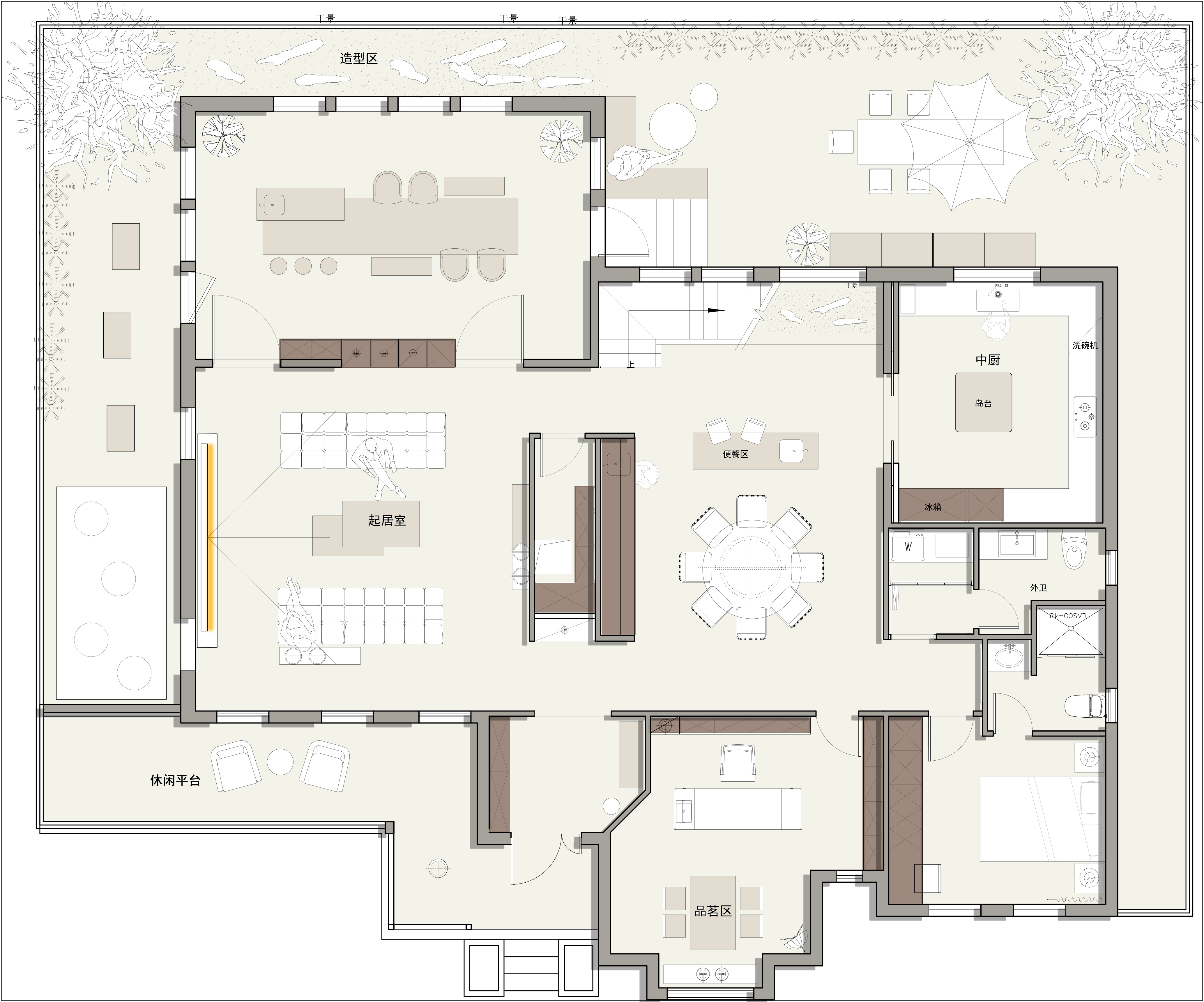 空间布局:动静结合的设计手法,带来居者深层次的思考。整体动线设计十分流畅,布局巧妙优雅,让空间更加饱满。