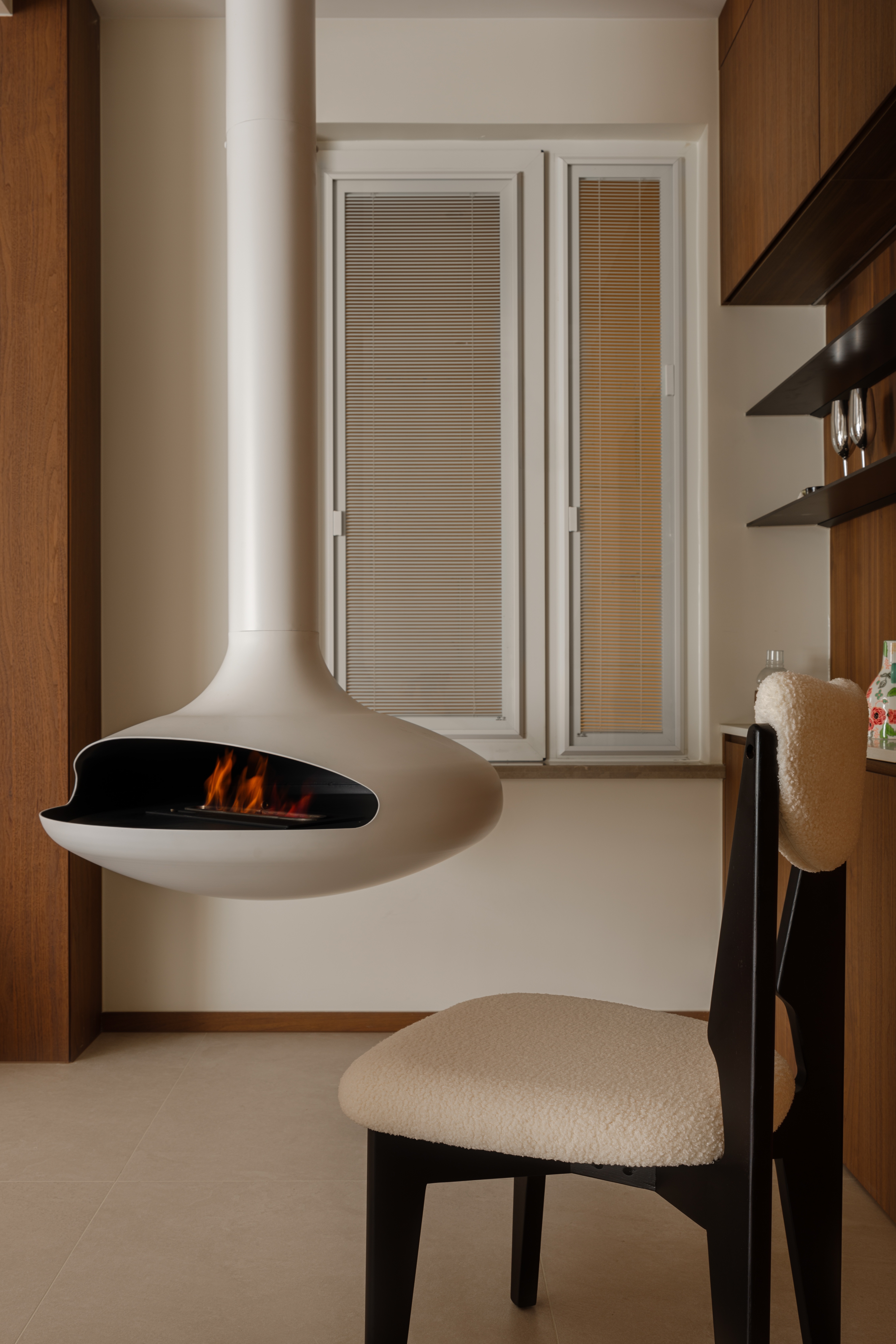 可转动的书架、可移动的沙发与跳动的炉火,共同编织出灵活的生活场景,回应不同的心境与时刻。