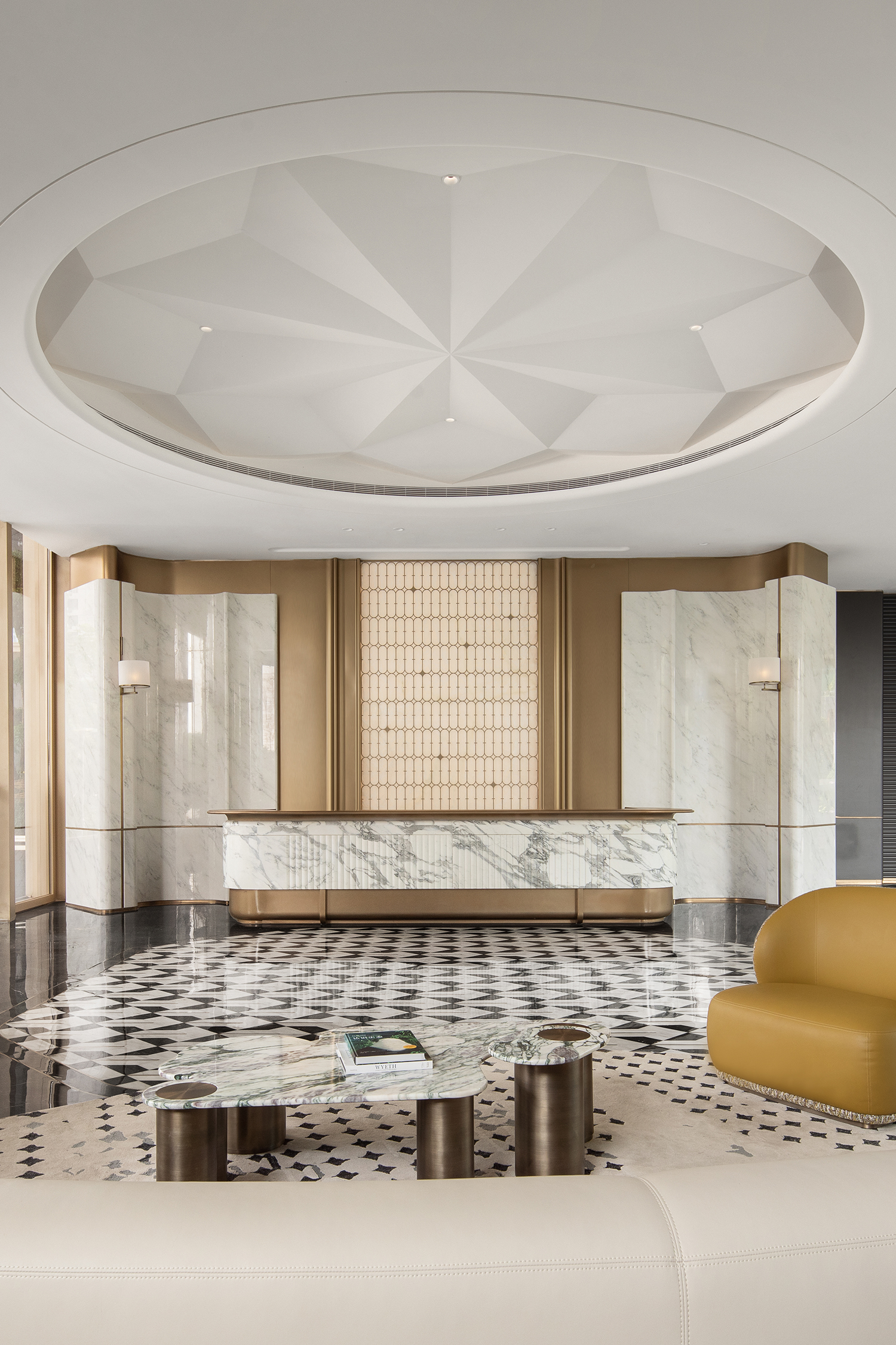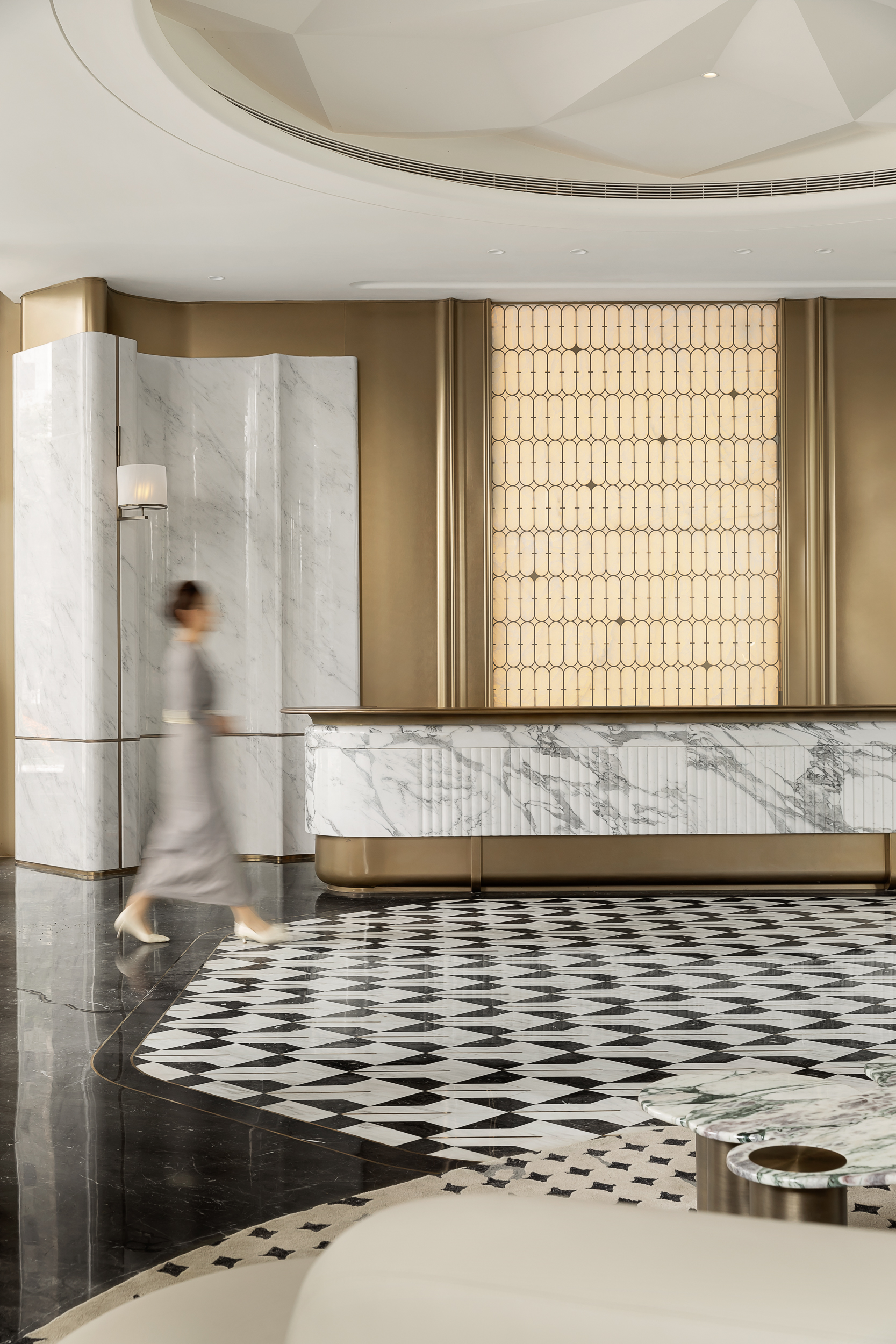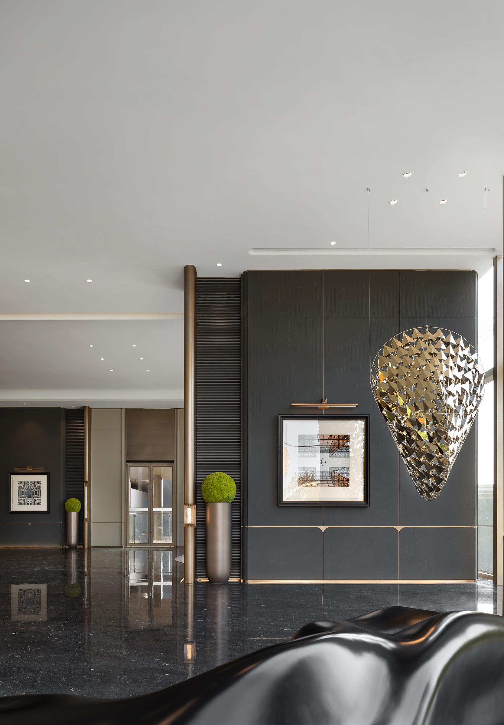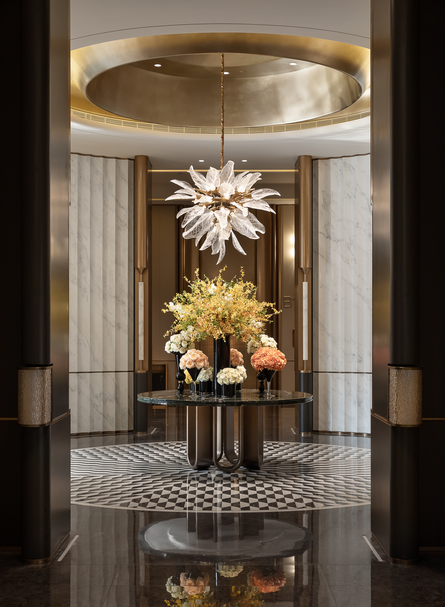 空间意境:入户大堂境界奢阔,天花灵感取自钻石的多面棱角,关于时间淬炼的隐喻,空间凝练出与光同行的永恒格调。金属的冷冽光泽与大理石的温润相映成辉,流动的诗意徜徉着奢雅气质,构筑起光影绮境的空间印象。十字圆厅宛如时光的交汇点,穹顶圆弧镜面倒映着星轨流转;流曲生花,绽放出钻石般的璀璨,地面格纹秩序铺陈,将光影诗意缀入空间的韵律节奏。