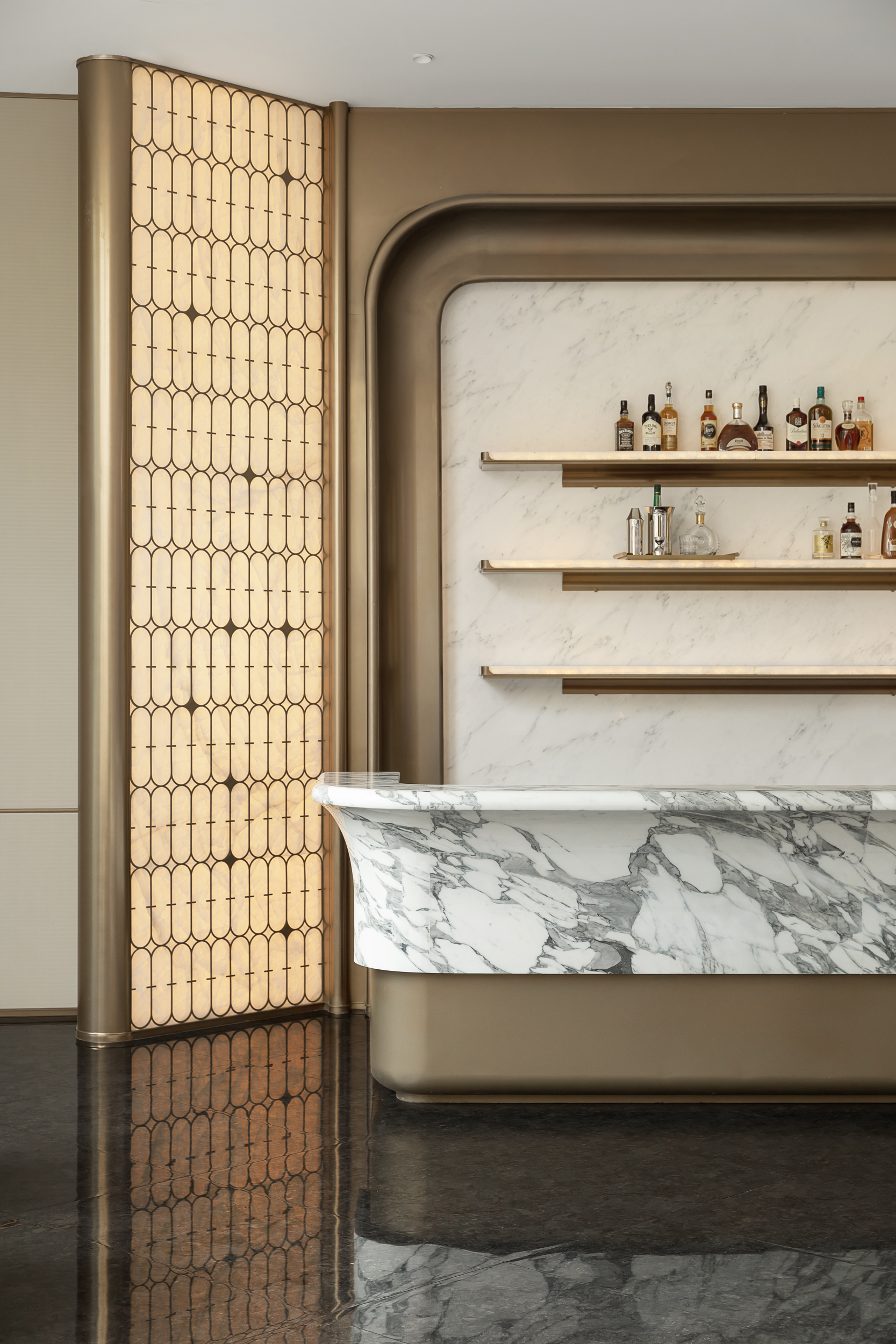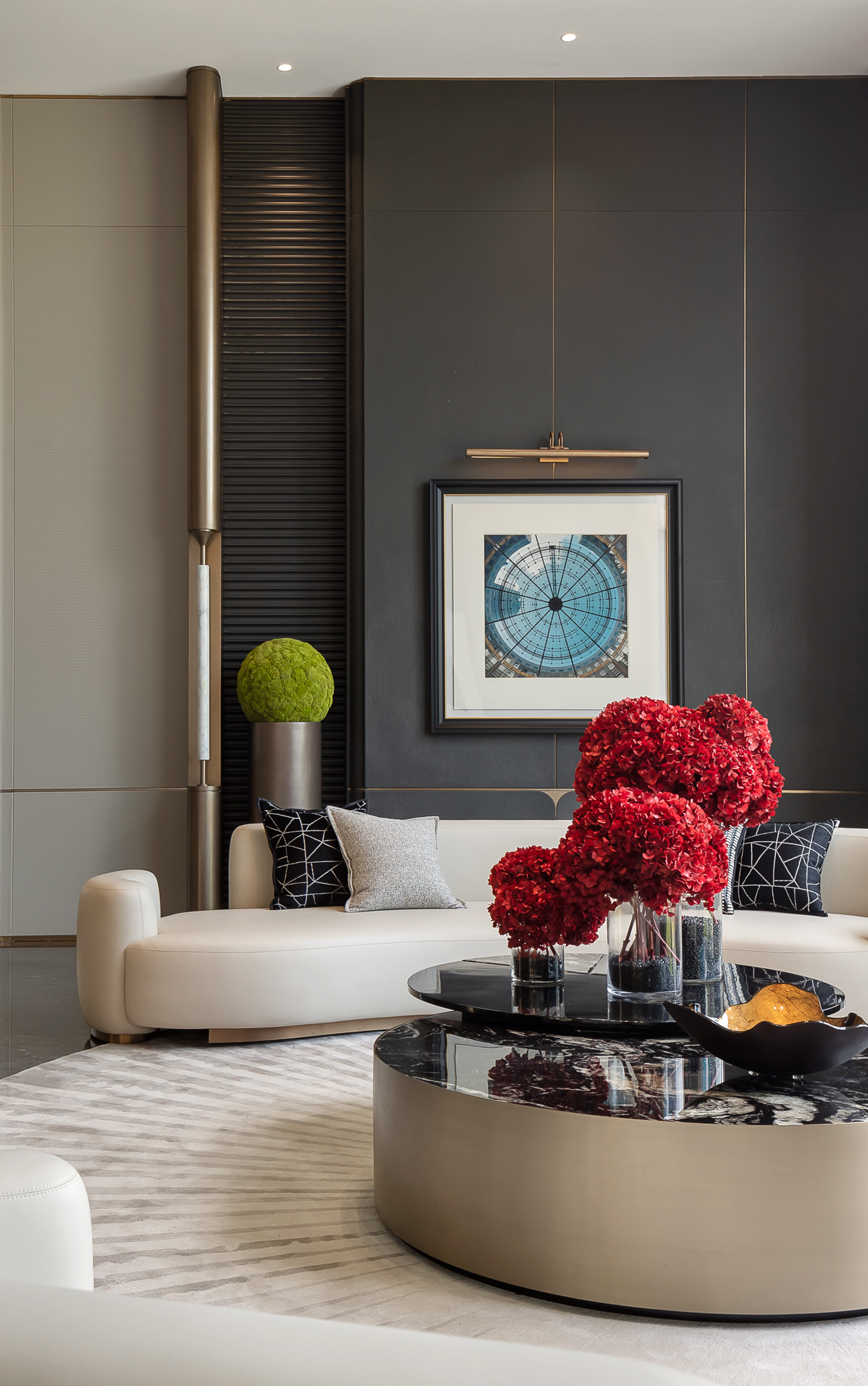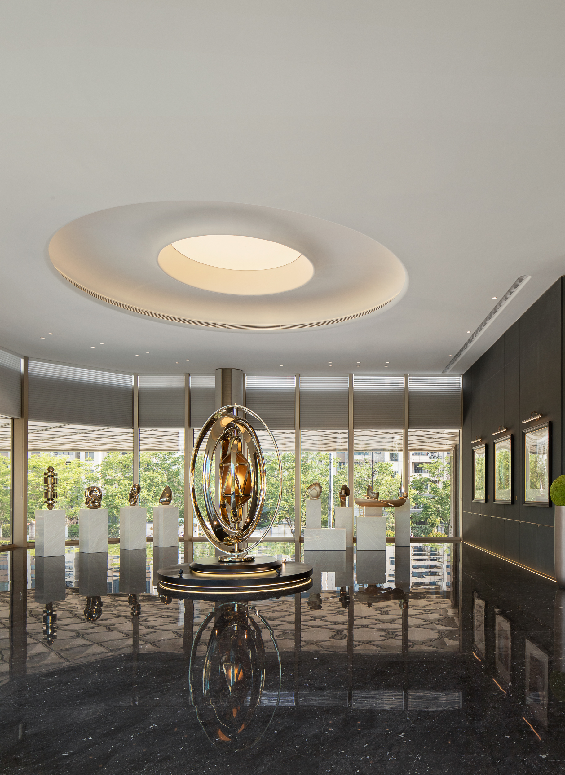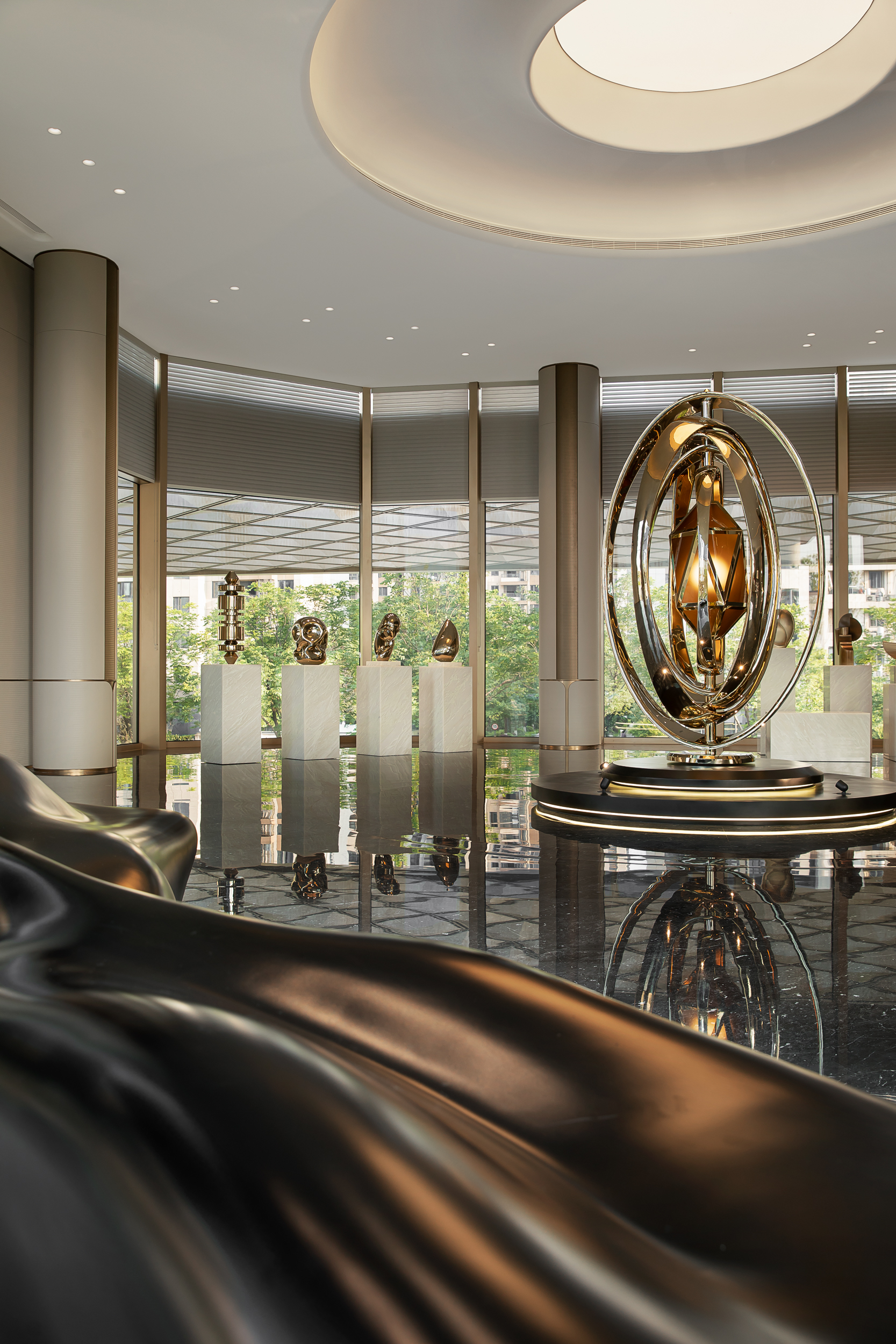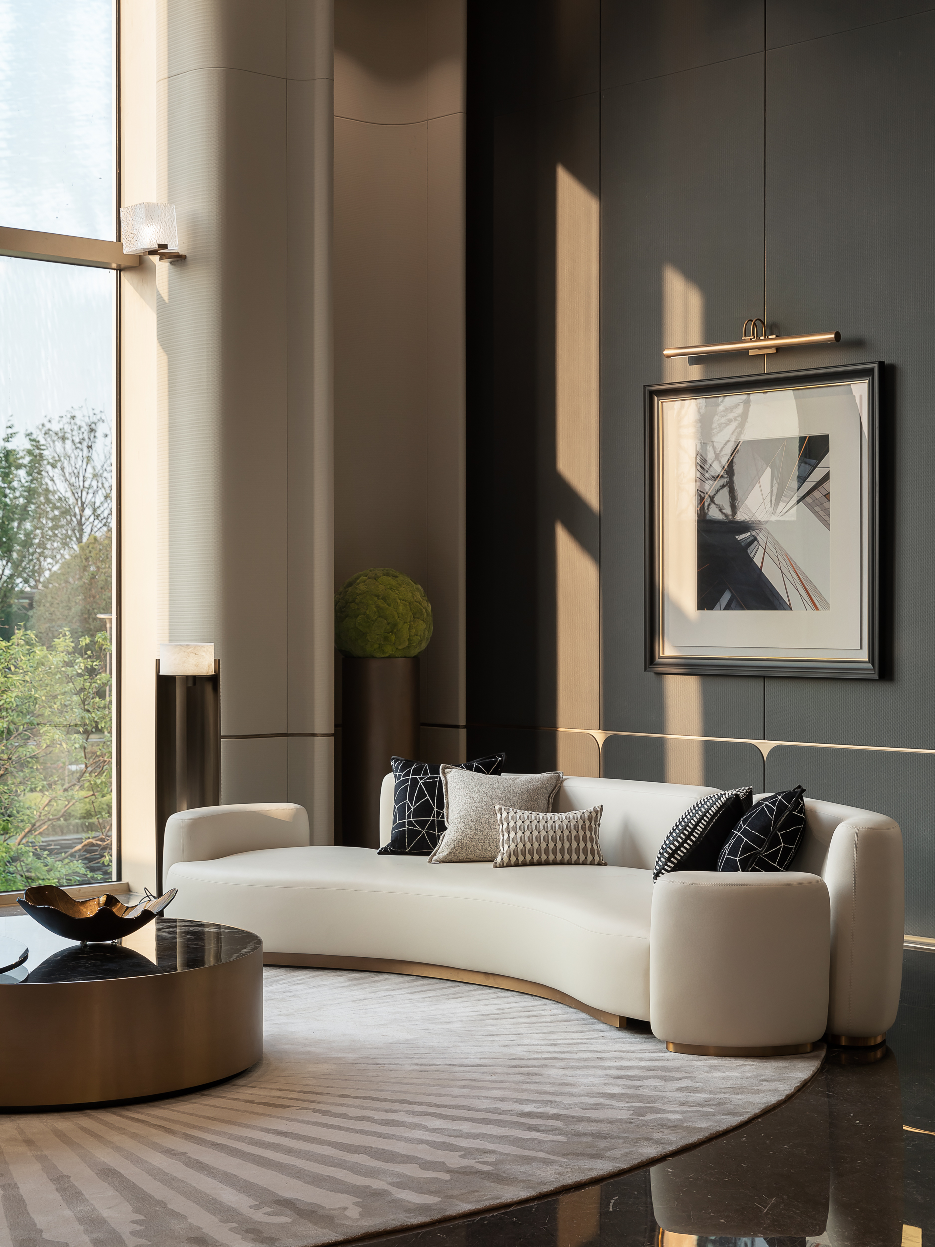 空间意境:入户大堂境界奢阔,天花灵感取自钻石的多面棱角,关于时间淬炼的隐喻,空间凝练出与光同行的永恒格调。金属的冷冽光泽与大理石的温润相映成辉,流动的诗意徜徉着奢雅气质,构筑起光影绮境的空间印象。十字圆厅宛如时光的交汇点,穹顶圆弧镜面倒映着星轨流转;流曲生花,绽放出钻石般的璀璨,地面格纹秩序铺陈,将光影诗意缀入空间的韵律节奏。