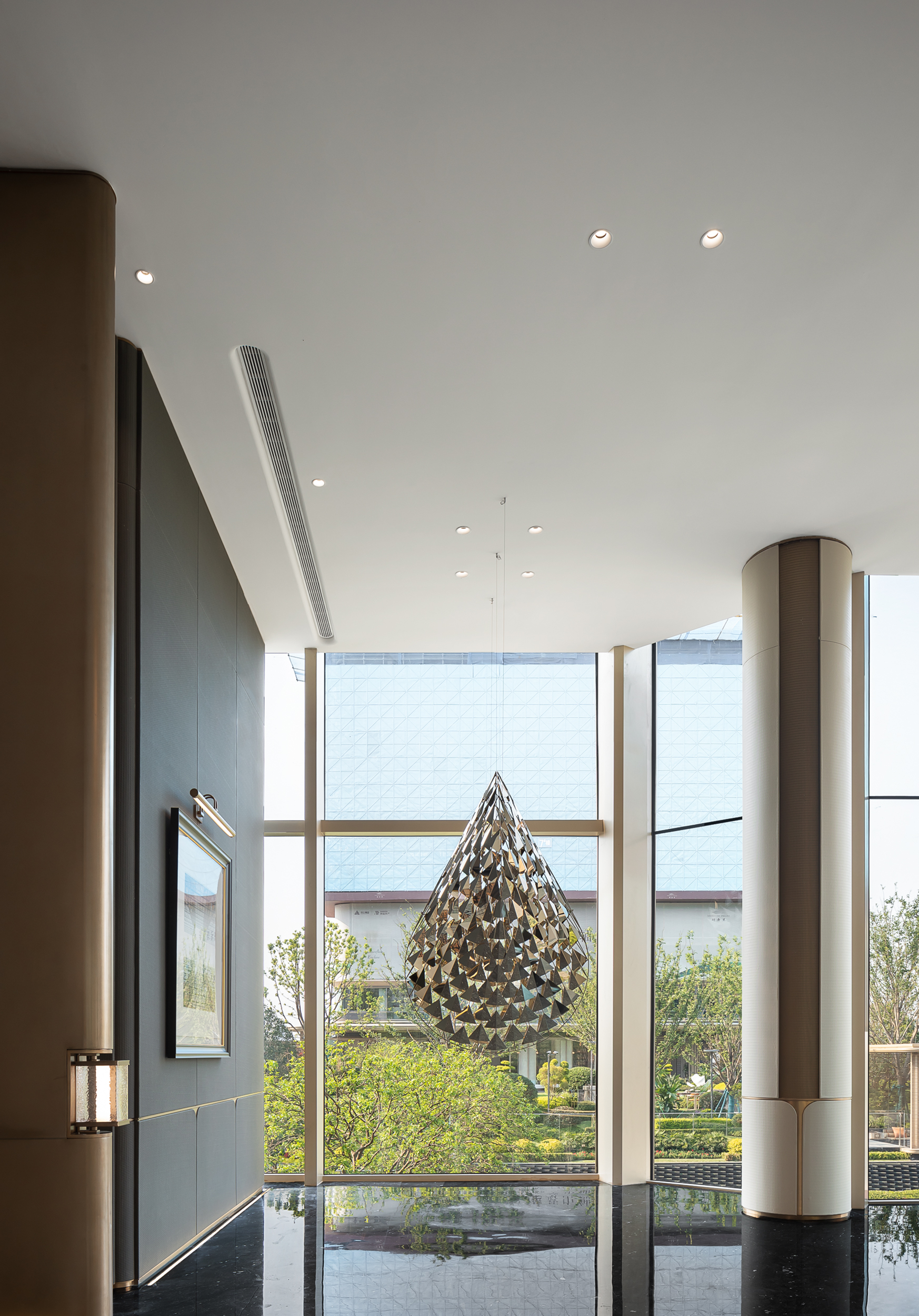 设计选材:犹如棱镜般通透漫射,光线在空间中跳跃、折射、重叠,织就璀璨而柔和的艺术氛围,转化为流动的光影诗境。视觉中心的钻石型艺术品,则是这场时空叙事的灵魂所在:流光飞舞,影熠生辉,星芒轻落于折射之上,闪耀变幻中以层次美感,寓意时间恒远而不变。